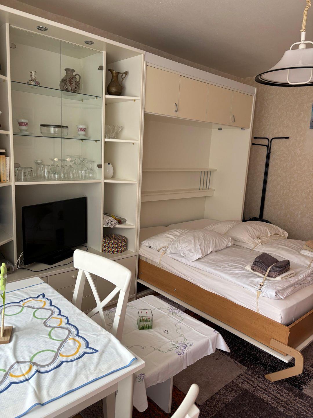 Sie hat eine Balkon. Die Wohnung ist ausgestattet mit Schrankbetten. Ebenso verfügt die Wohnung über eine kleine Küche mit 4-Platten-Herd und Kühlschrank. Dusche und WC ist auch vorhanden. Die Wohnung besitzt WLAN.