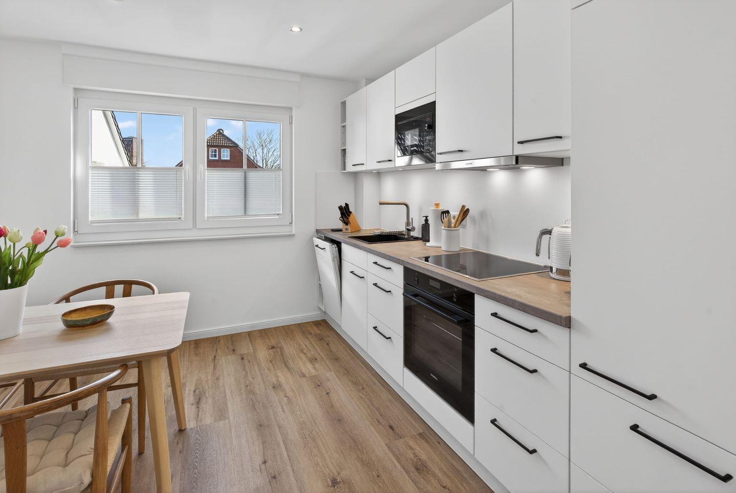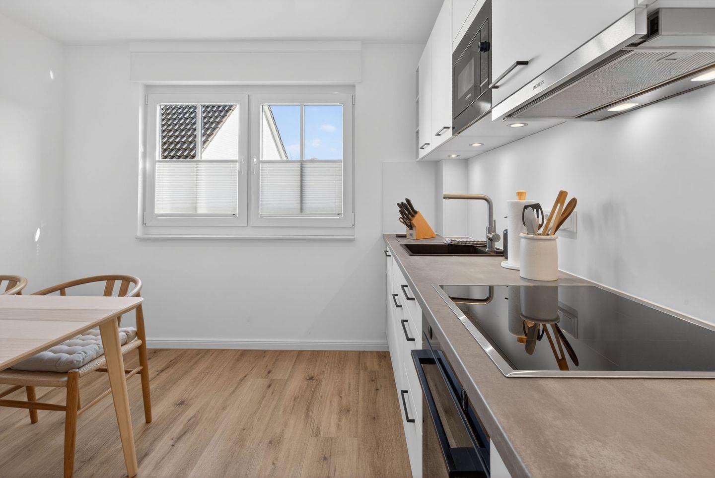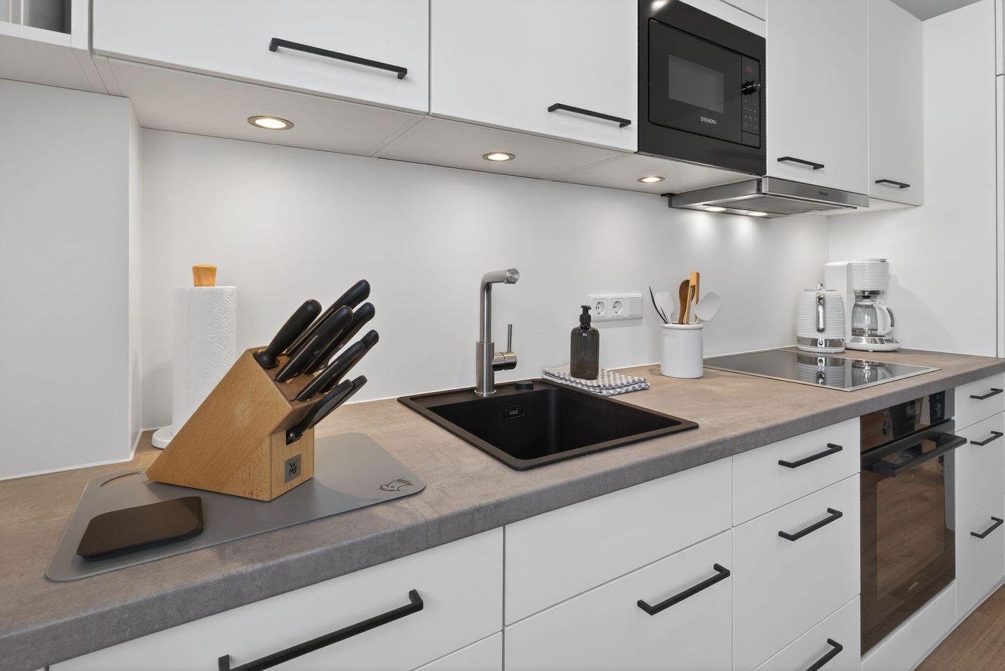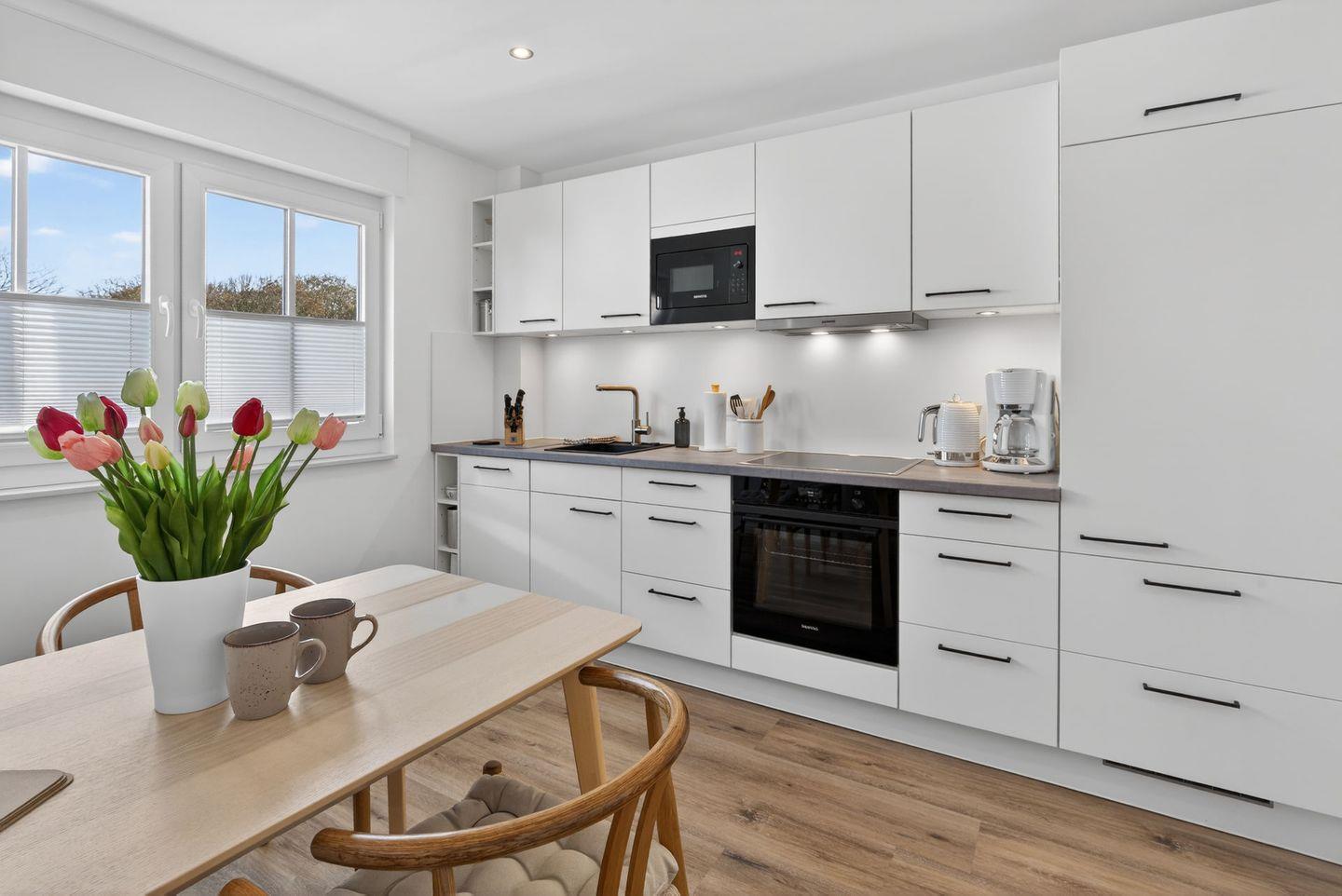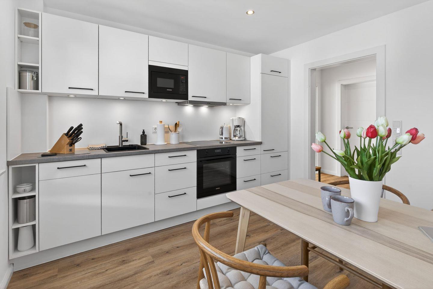 Die geschlossene Küche ist komplett ausgestattet und ermöglicht Ihnen eine unkomplizierte Selbstversorgung. Zur Verfügung stehen Cerankochfeld, Backofen, Mikrowelle, Kühlschrank, Spülmaschine, Wasserkocher, Toaster und Kaffeemaschine. Geschirr, Besteck, Küchenutensilien, Geschirrhandtücher.