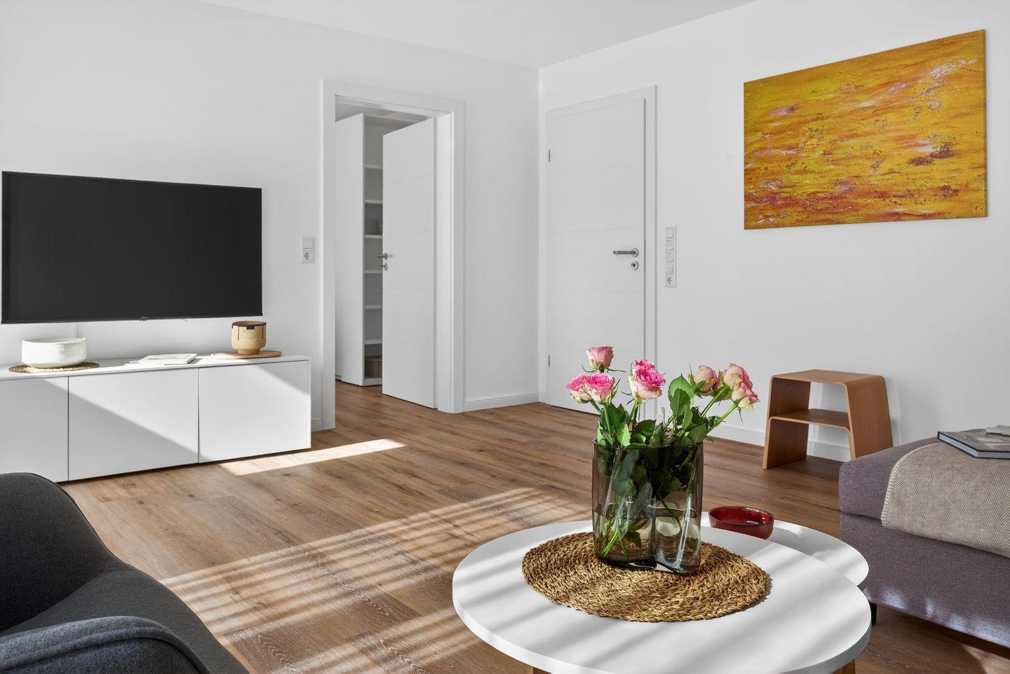 Im Wohnbereich sorgen Sofa, Sessel, Kommode, Garderobe und Esstisch für eine gemütliche und angenehme Atmosphäre. Zwei Fernseher mit digitalem Satellitenanschluss sowie WLAN und Internet stehen Ihnen ebenfalls zur Verfügung. Die Fußbodenheizung tragen in jeder Jahreszeit zu einem angenehmen Wohnklima bei. Vinylböden im Wohn- und Schlafbereich, Sichtschutz an allen Fenstern unterstreichen den gepflegten und wohnlichen Charakter.