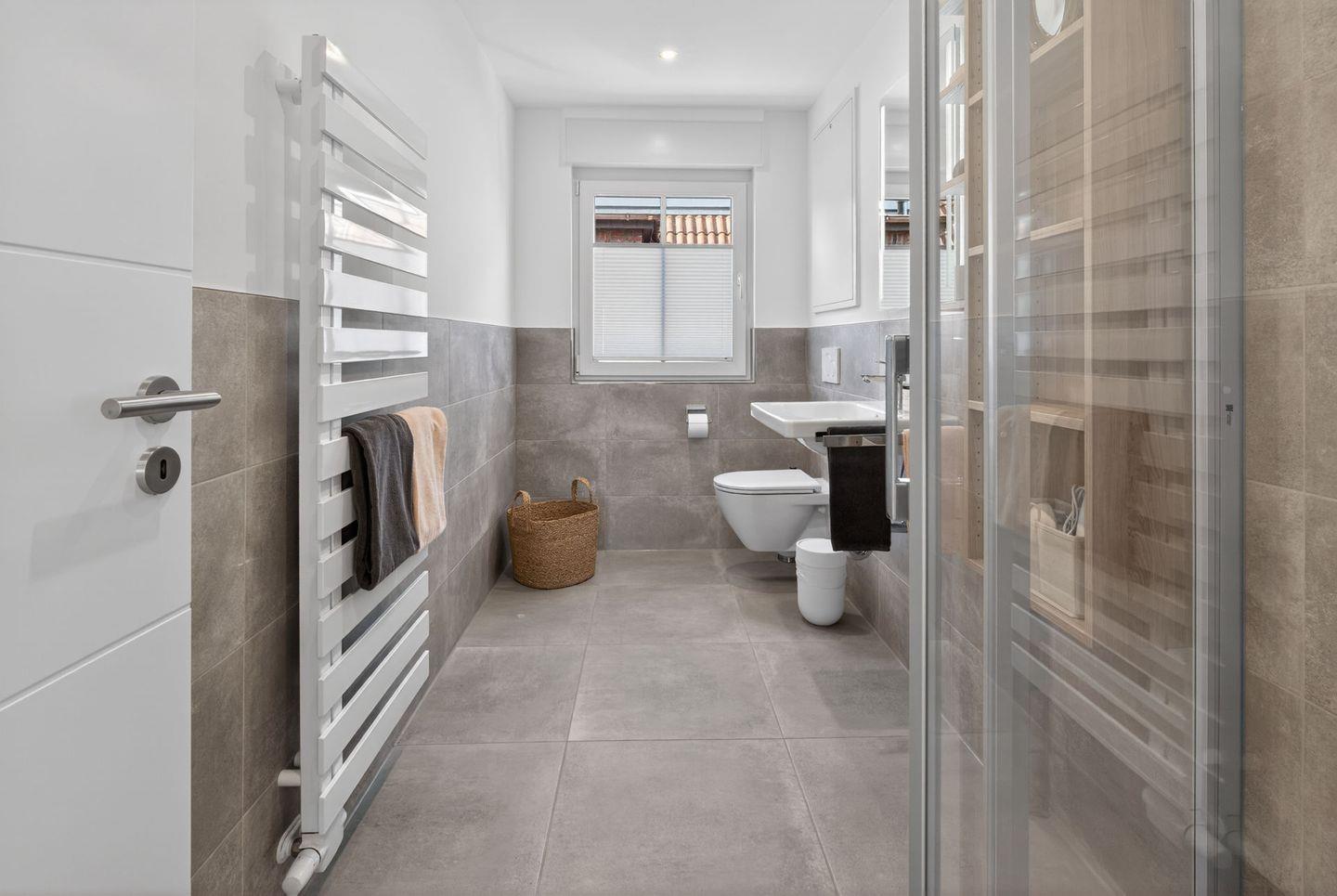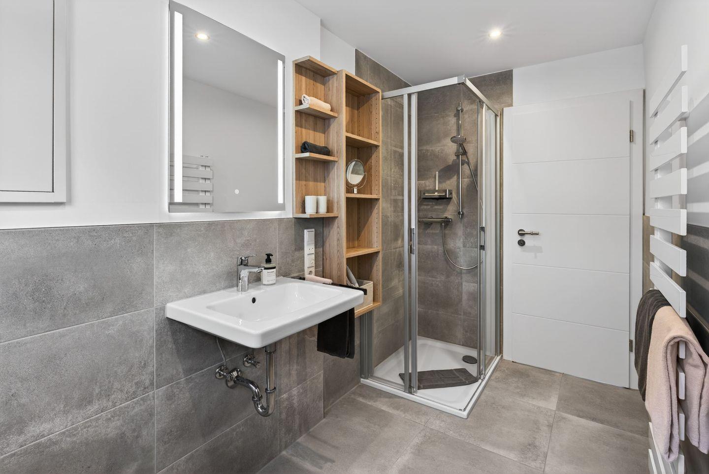 Das Badezimmer verfügt über eine bodengleiche Dusche, WC, Waschbecken, Spiegel, Kosmetikspiegel, Fenster und Haartrockner. Bettwäsche und Handtücher sind inklusive, sodass Sie Ihren Aufenthalt von Anfang an entspannt beginnen können. Ein Wäscheständer, Staubsauger und weitere praktische Details ergänzen die Ausstattung.