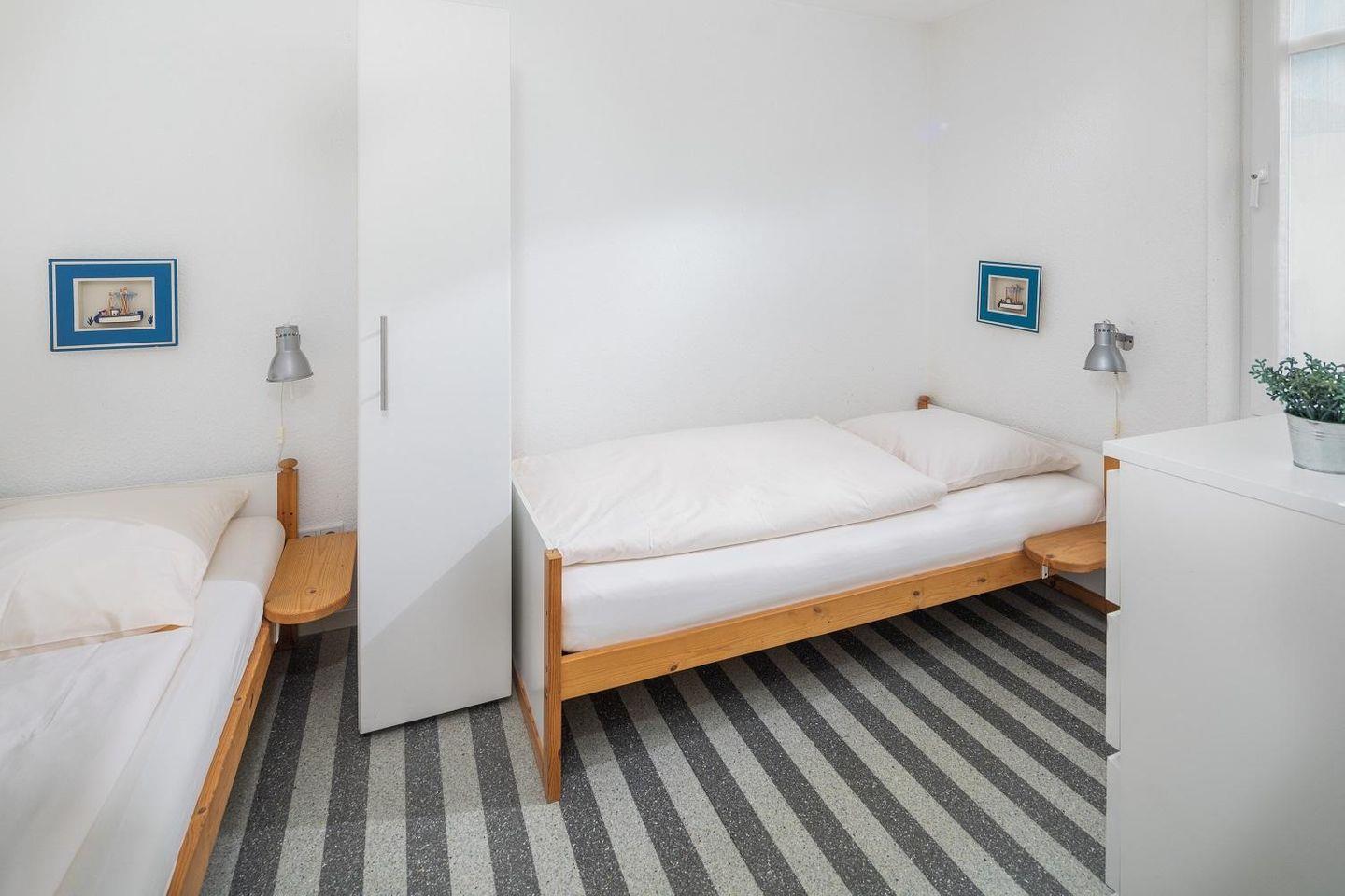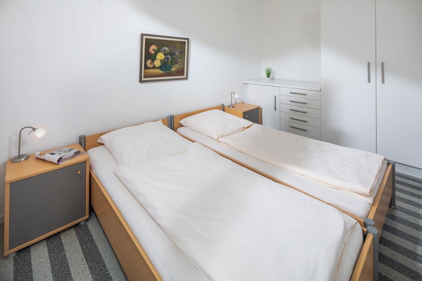 die beiden Schlafzimmer der zweckmäßig eingerichteten Wohnung im EG liegen sich gegenüber nach hinten raus. Das größere der beiden mit Doppelbett verfügt über ein zusätzliches TV, das andere ist mit zwei Einzelbetten ausgestattet.