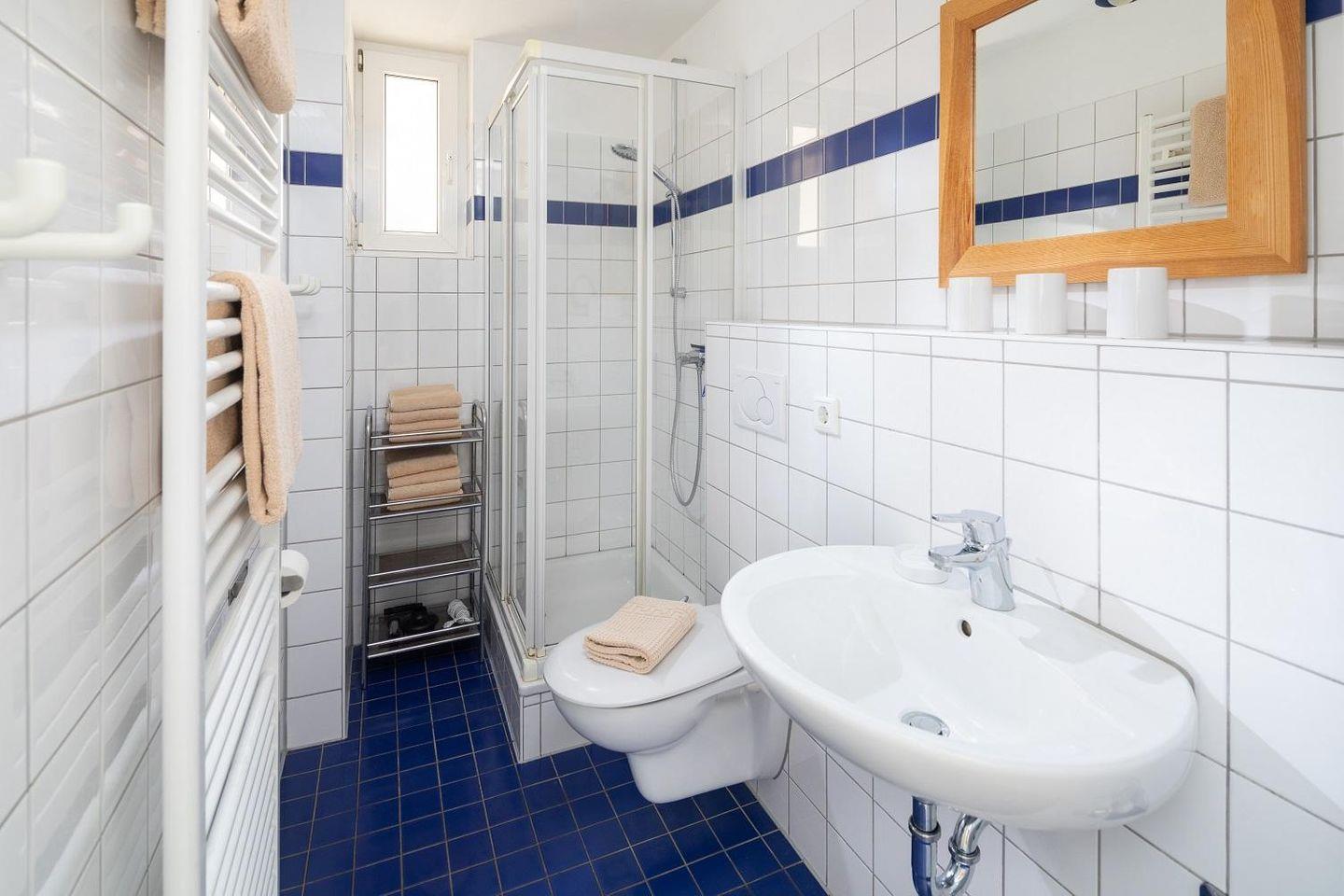 Neben der Sofaecke im Wohnzimmer und der Küchenzeile findet die Essecke vor den Fenstern Platz. Das Tageslichtbad (kleines Fenster) hat Dusche/WC.