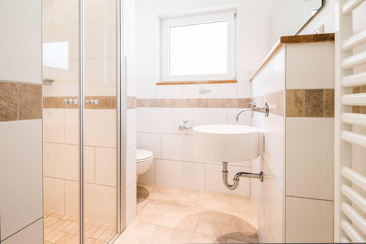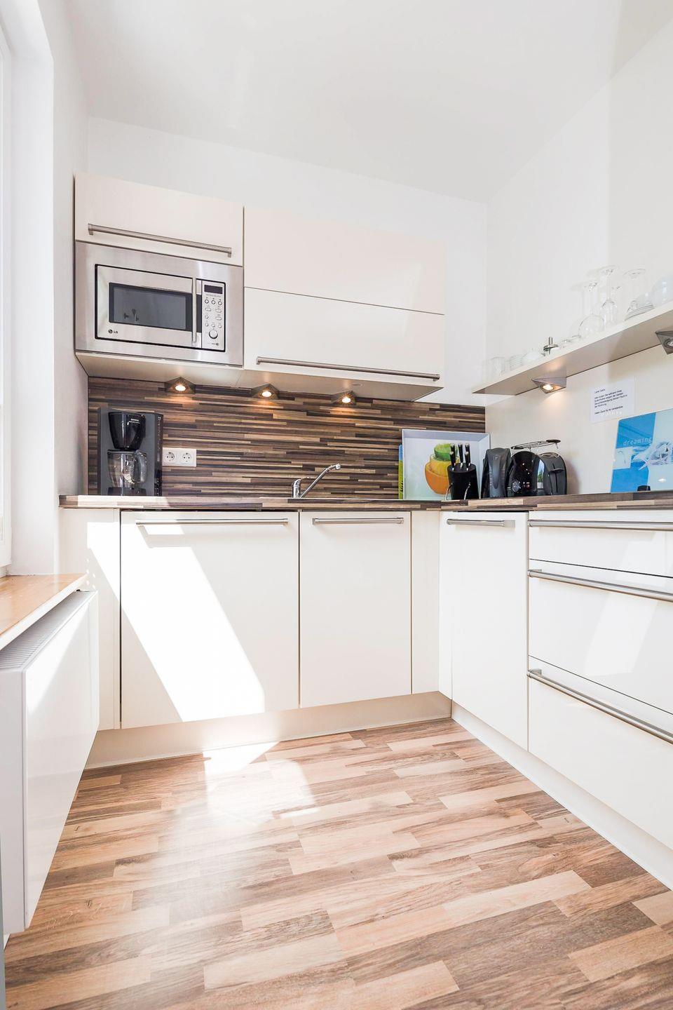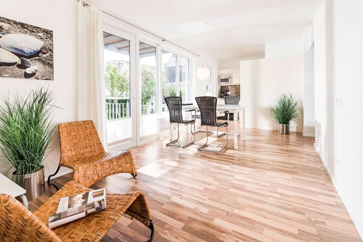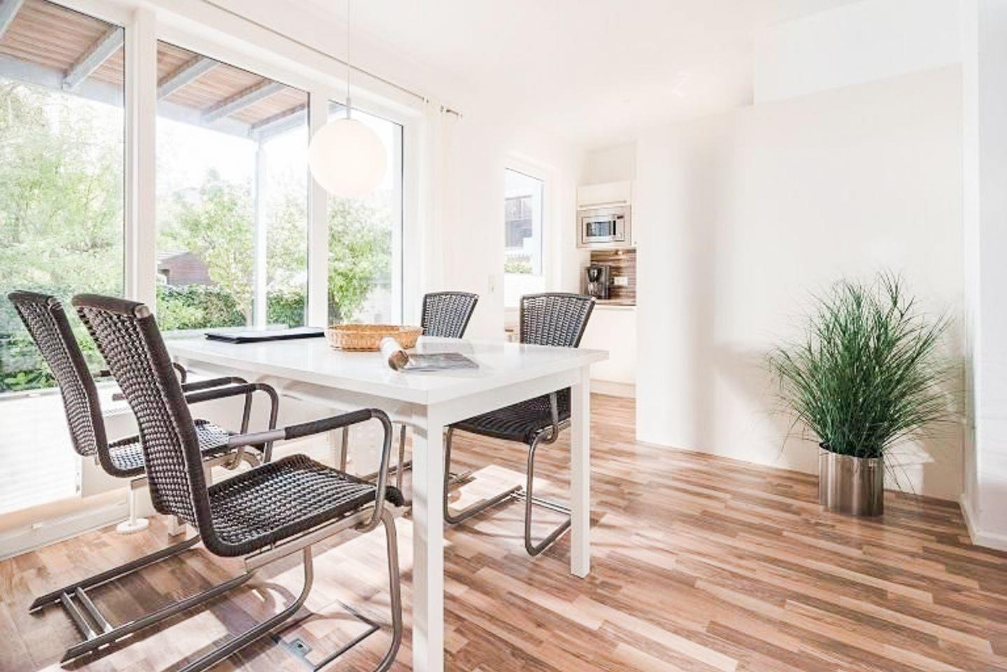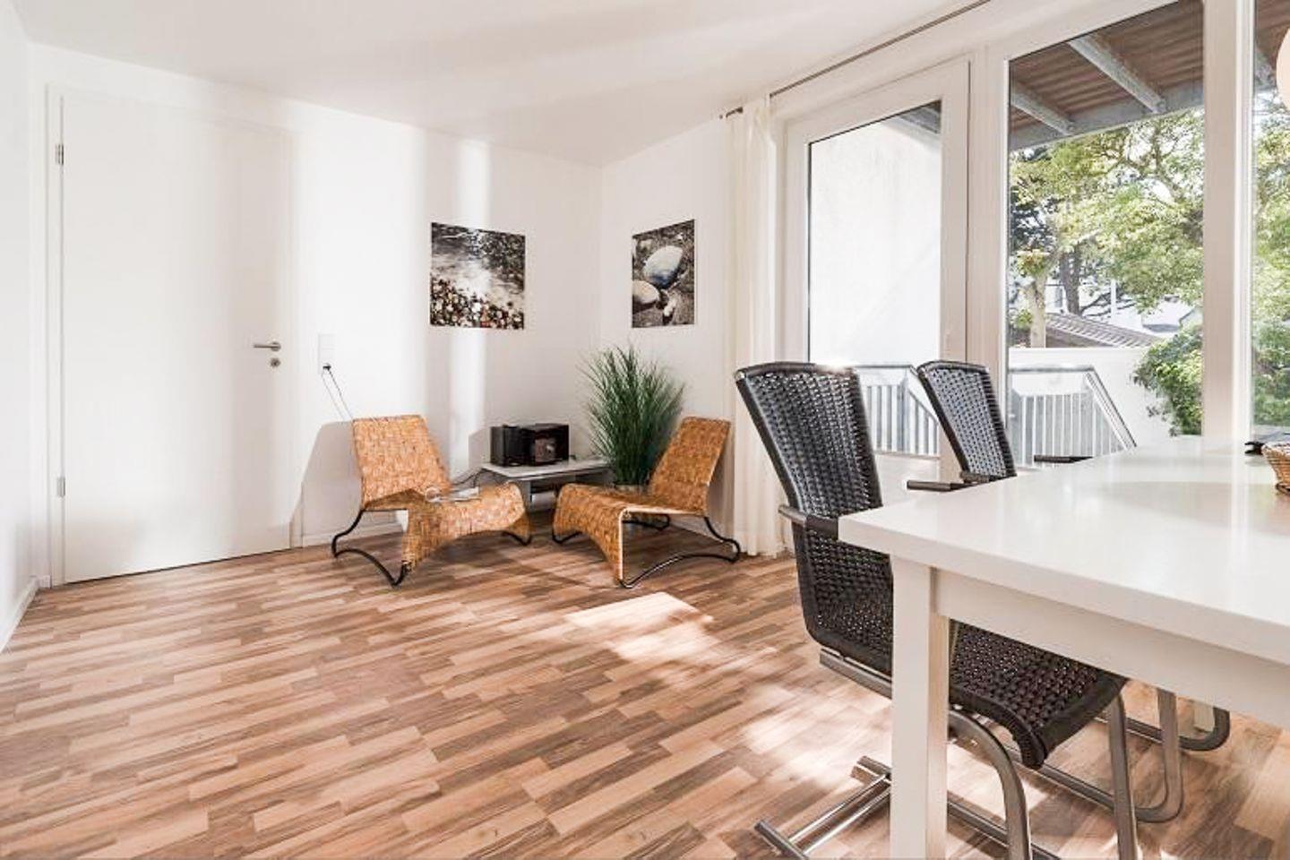Im Erdgeschoss des Appartements befinden sich ein kleines Fernsehzimmer mit Sofa sowie die Wohnküche mit Küchenzeile und Zugang zur Terrasse. Der Essplatz vor der Fensterfront bietet ausreichend Platz für 4 Personen. Tageslichtbad mit Dusche/WC.