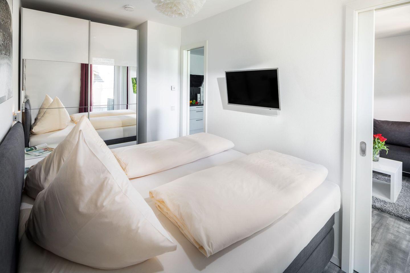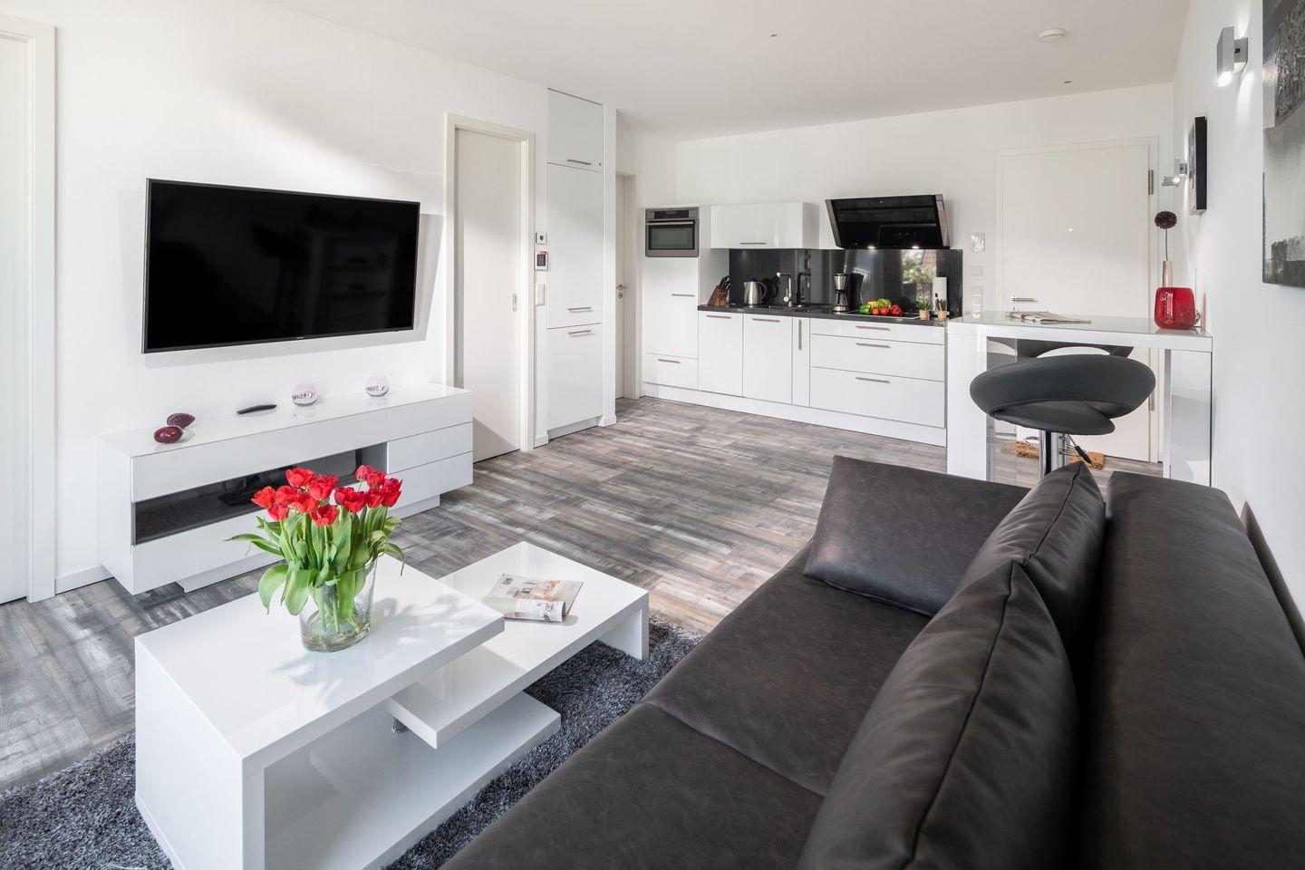 das Appartement im 1. OG verfügt über ein "Norderneyer" Schlafzimmer mit zusätzlichem TV. Im Wohnraum befindet sich eine voll ausgestattete Küchenzeile, Sofa und Esstresen. Der rückseitige Balkon liegt Richtung Osten (Morgensonne). Badezimmer mit Dusche/WC. Fahrstuhl vorhanden.