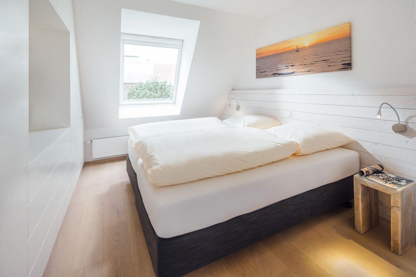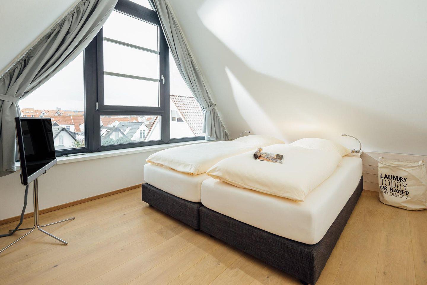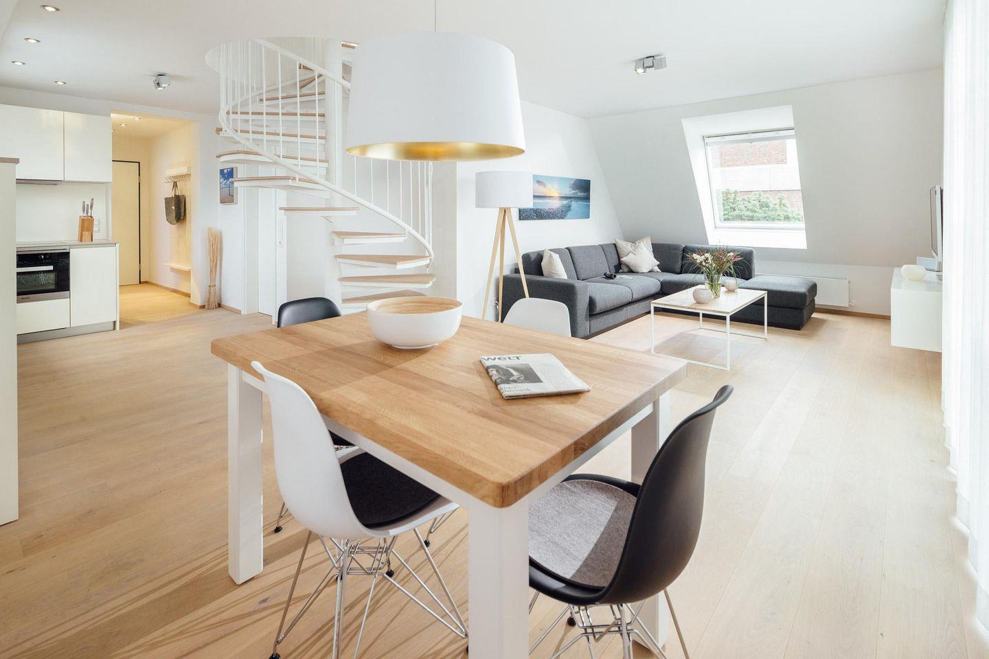 in der 1. Etage befindet sich eines der beiden Schlafzimmer mit Doppelbett (+TV), Tageslichtbad mit XXL-Dusche/WC und der helle Wohnraum mit moderner Küchenzeile. Der Balkon liegt Richtung Westen. Über eine Wendeltreppe erreichen Sie das 2. Schlafzimmer mit Doppelbett (+TV) im Dachgiebel und das 2. Tageslichtbad mit Dusche/WC. Auch ein kleiner Schreibtisch findet dort Platz.