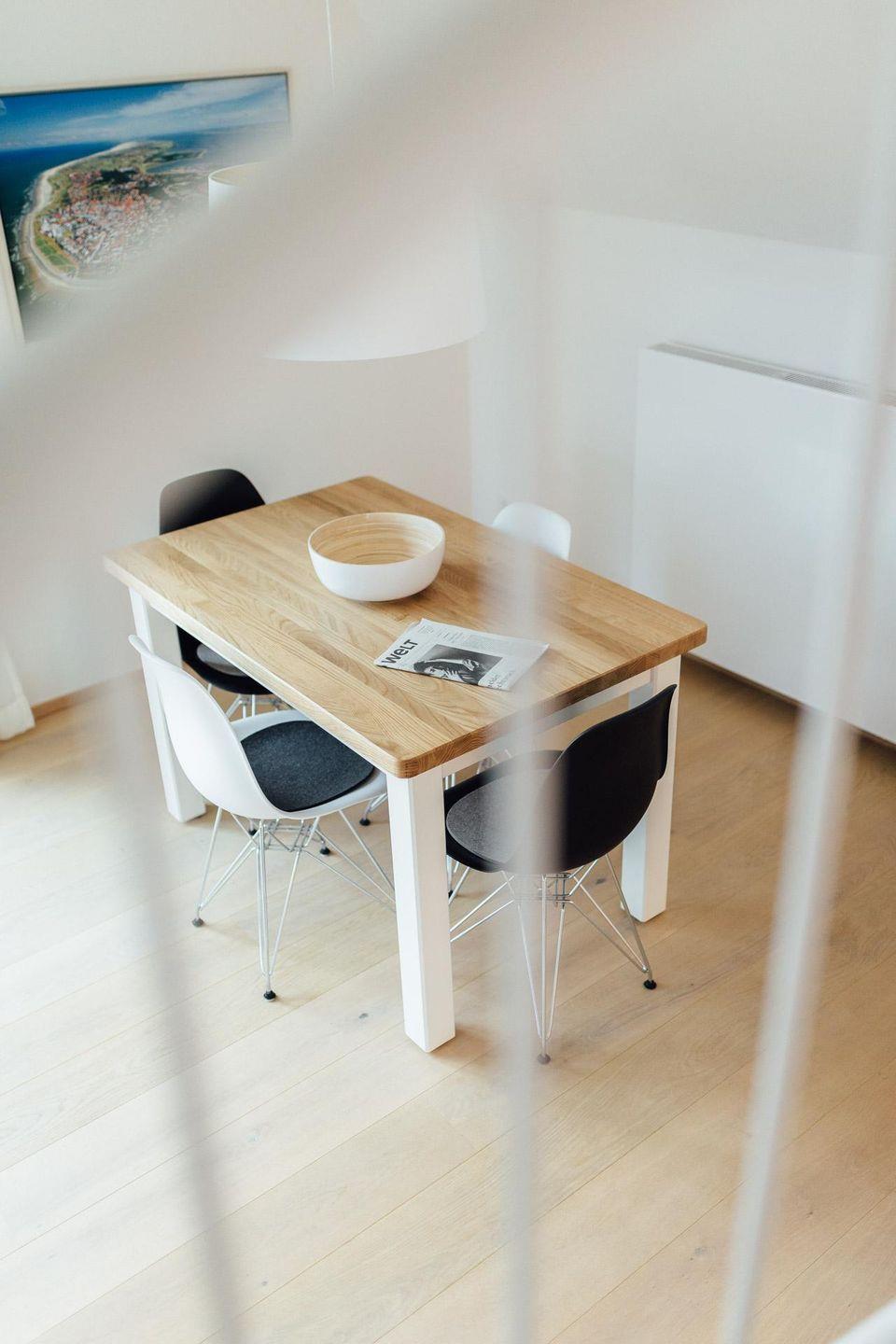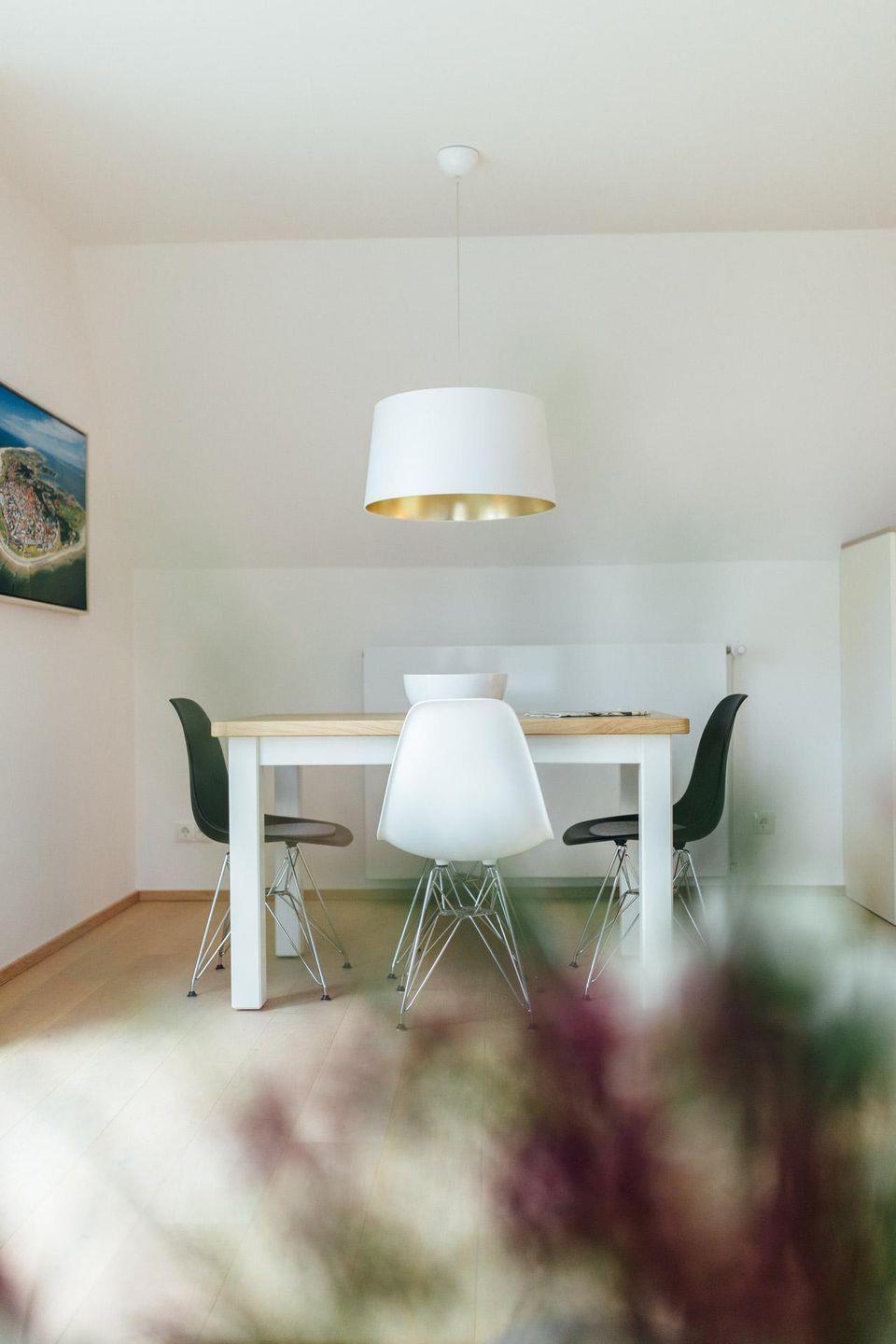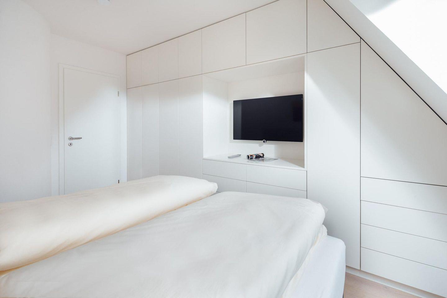 in der 1. Etage befindet sich eines der beiden Schlafzimmer mit Doppelbett (+TV), Tageslichtbad mit XXL-Dusche/WC und der helle Wohnraum mit moderner Küchenzeile. Der Balkon liegt Richtung Westen. Über eine Wendeltreppe erreichen Sie das 2. Schlafzimmer mit Doppelbett (+TV) im Dachgiebel und das 2. Tageslichtbad mit Dusche/WC. Auch ein kleiner Schreibtisch findet dort Platz.