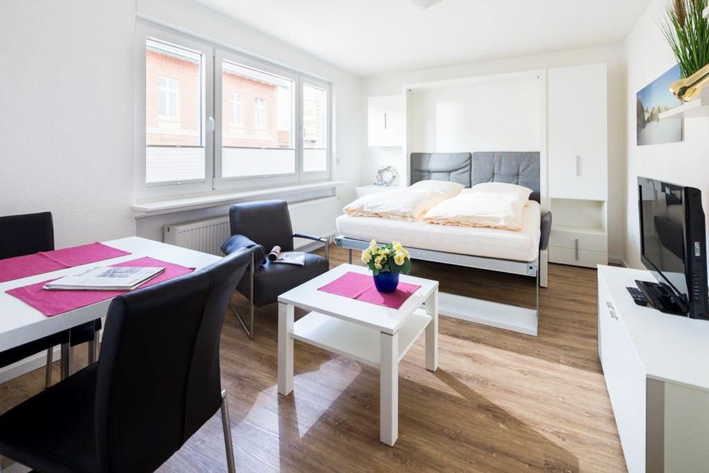 die Wohnung im 2. OG ist ausgestattet mit einem modernen Doppelschrankbett, das sich abends leicht über das Sofa klappen lässt. So ist tagsüber Platz für Sofaecke und Esstisch. Die Küchenzeile ist separat, Tageslichtbad mit Dusche/WC.