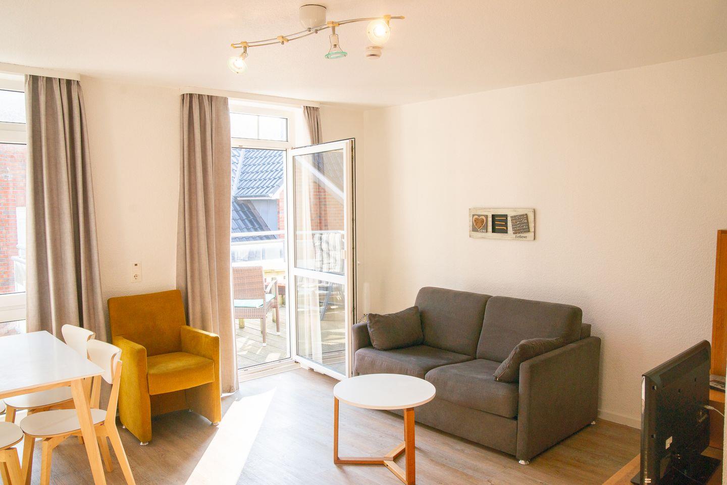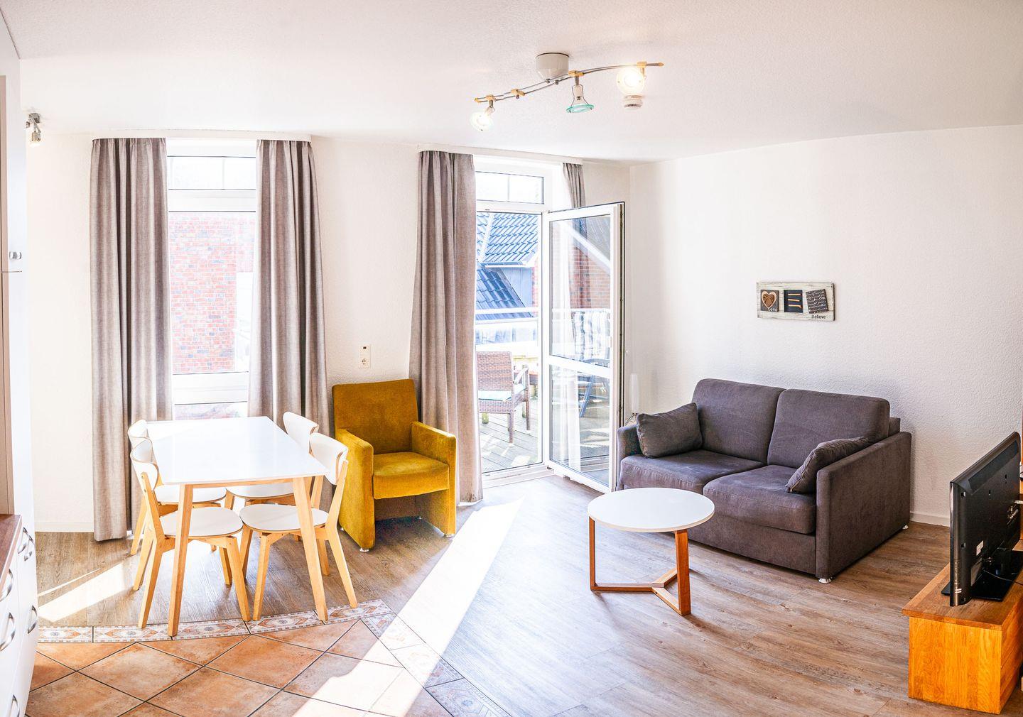 das Appartement im 1. OG verfügt über ein separates Schlafzimmer mit Doppelbett, Wohn-Schlafraum (Schlafsofa 1,40m) mit Küchenzeile, Essecke, Diele und Tageslichtbad mit Dusche/WC. Der geräumige Balkon bietet Platz für Tisch und Stühle und ist sowohl vom Wohn-als auch vom Schlafzimmer aus zugänglich. Ein eigener Parkplatz steht Ihnen auf dem Grundstück zur Verfügung. Der Sonnenhof befindet sich in der Nordhelmsiedlung Norderneys. Im Haus befinden sich 4 weitere Ferienwohnungen.