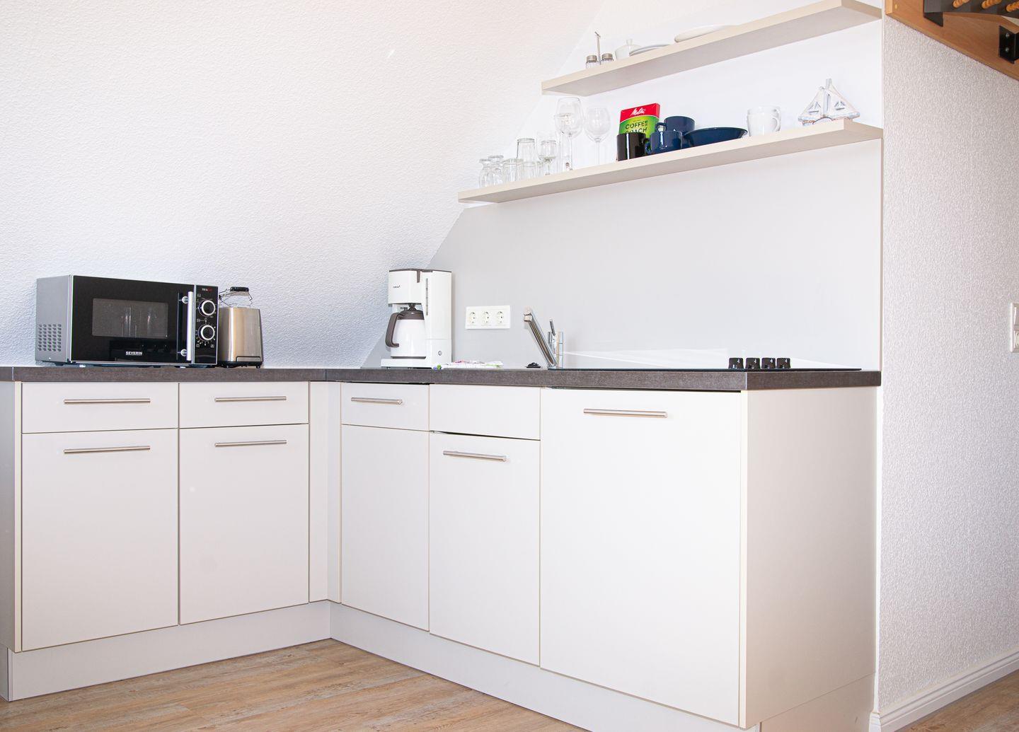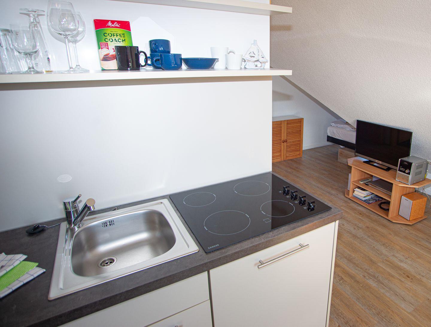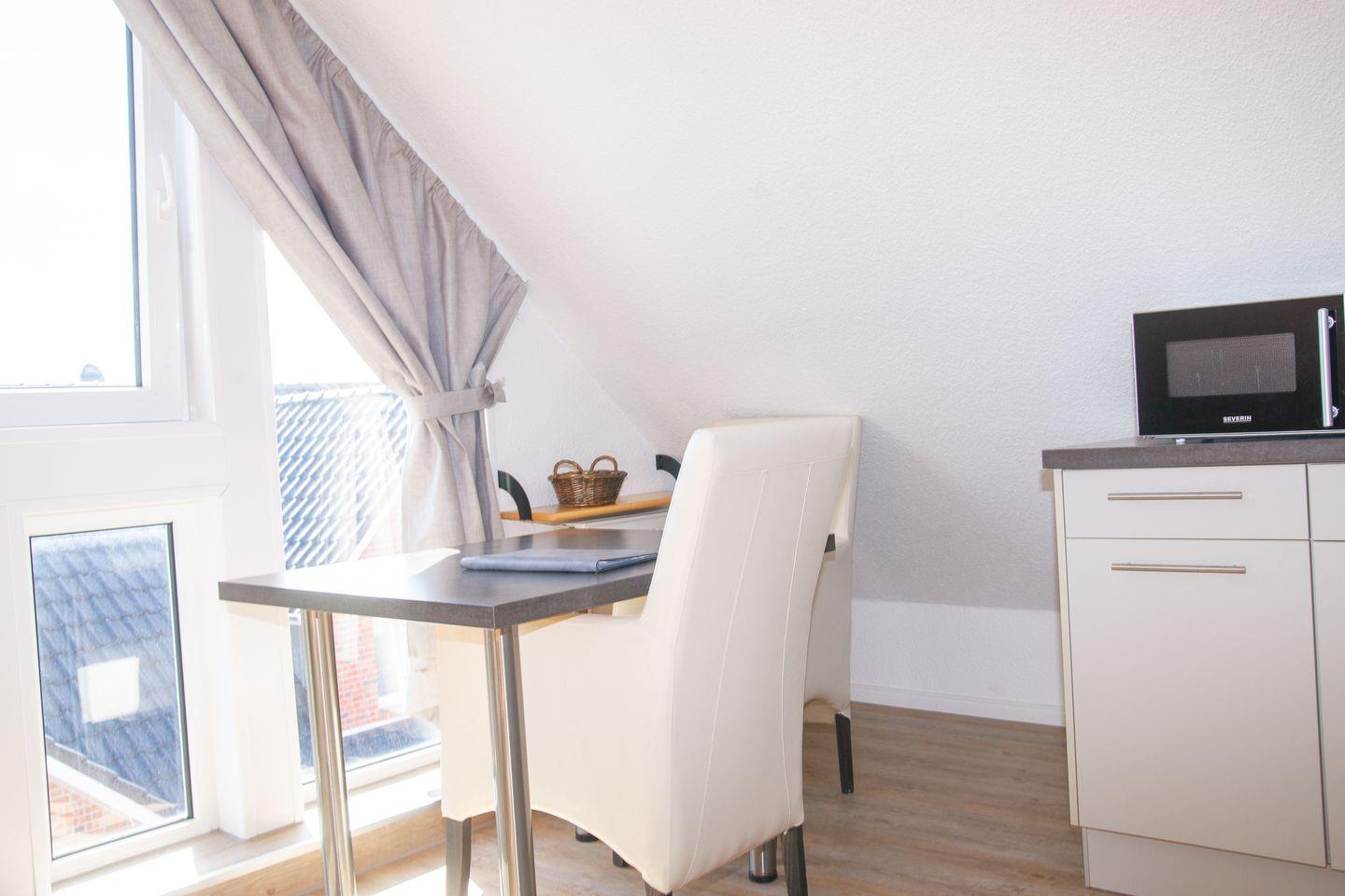 das Appartement im 2. OG verfügt über eine Schlafnische mit feststehendem King-Size-Bett (Breite 1,40m), Sofa-und Essecke, Küchenzeile sowie Tageslichtbad mit Dusche/WC. Ein eigener Parkplatz steht Ihnen auf dem Grundstück zur Verfügung. Der Sonnenhof befindet sich in der Nordhelmsiedlung Norderneys. Im Haus befinden sich 4 weitere Ferienwohnungen.