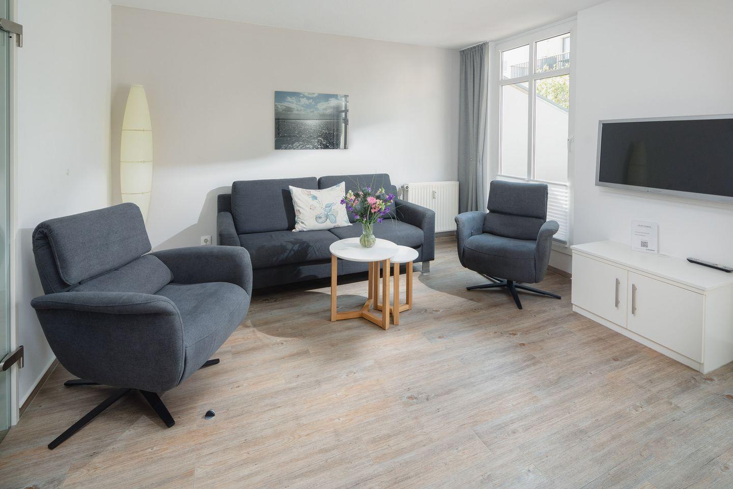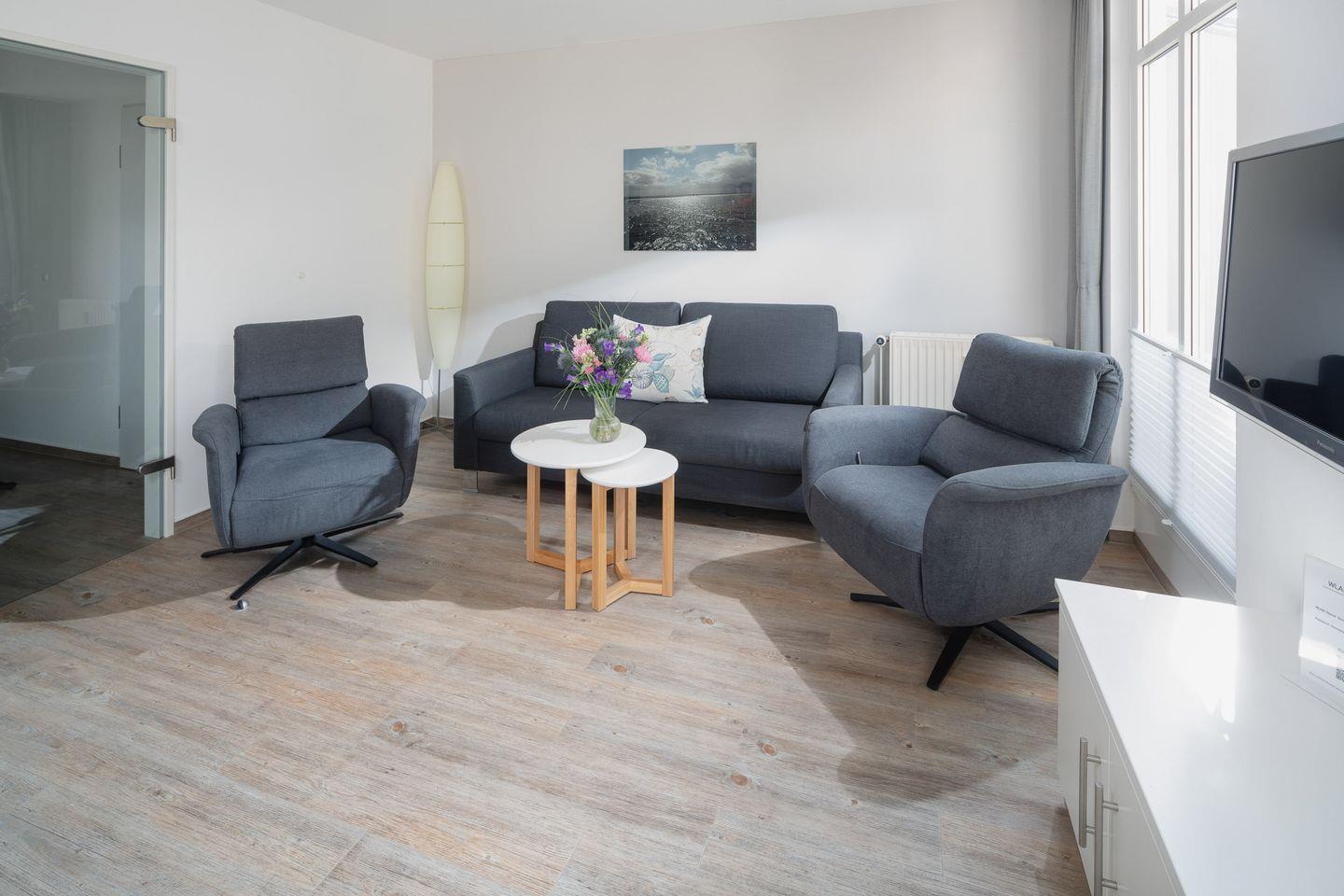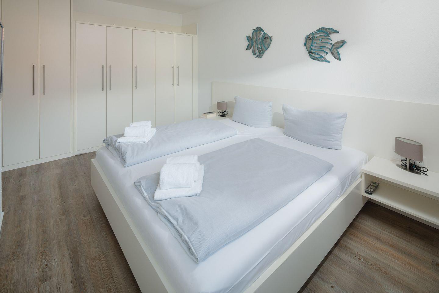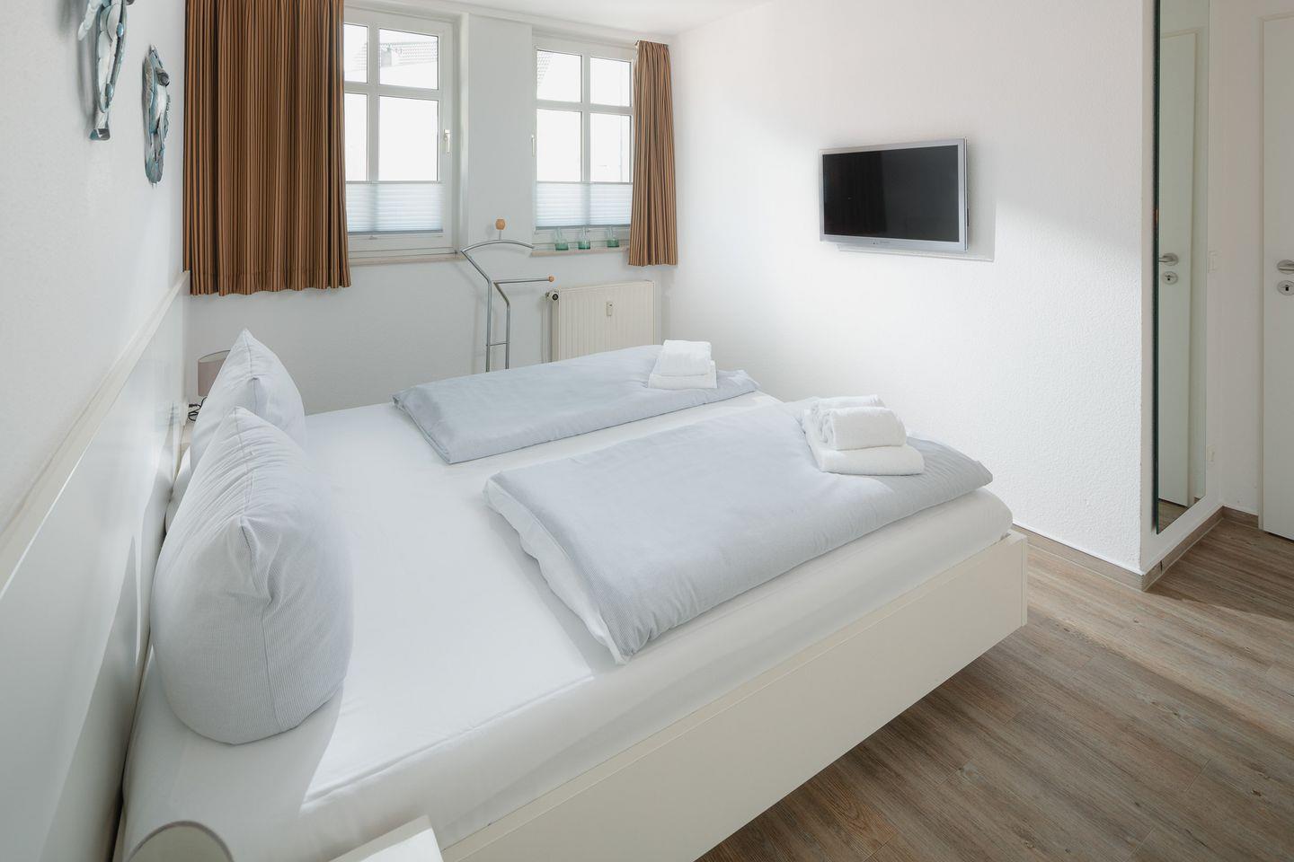 das moderne Appartement im 1. OG, 2026 Renoviert und mit neuen Matratzen ausgestattet, verfügt über zwei separate Schlafzimmer. Eines mit Doppelbett (zusätzliches TV) und eines mit zwei Einzelbetten. Über den Wohnraum mit Küchenzeile, Essecke und gemütlicher Sofaecke haben Sie Zugang zum großen Süd-Westbalkon. Das Badezimmer hat eine Dusche und WC.