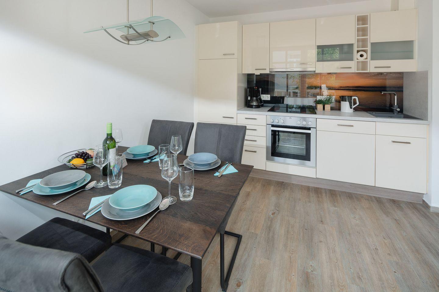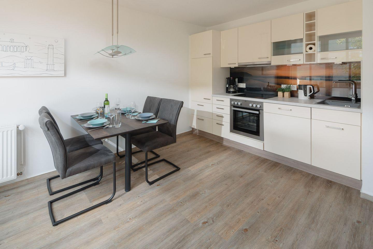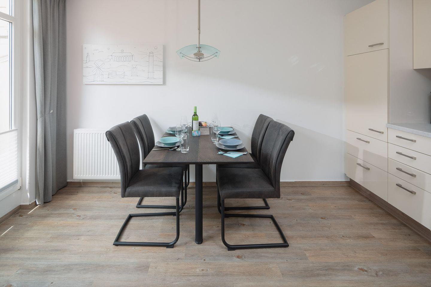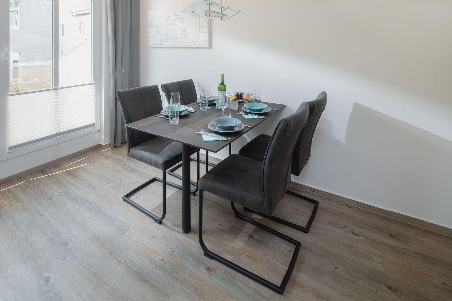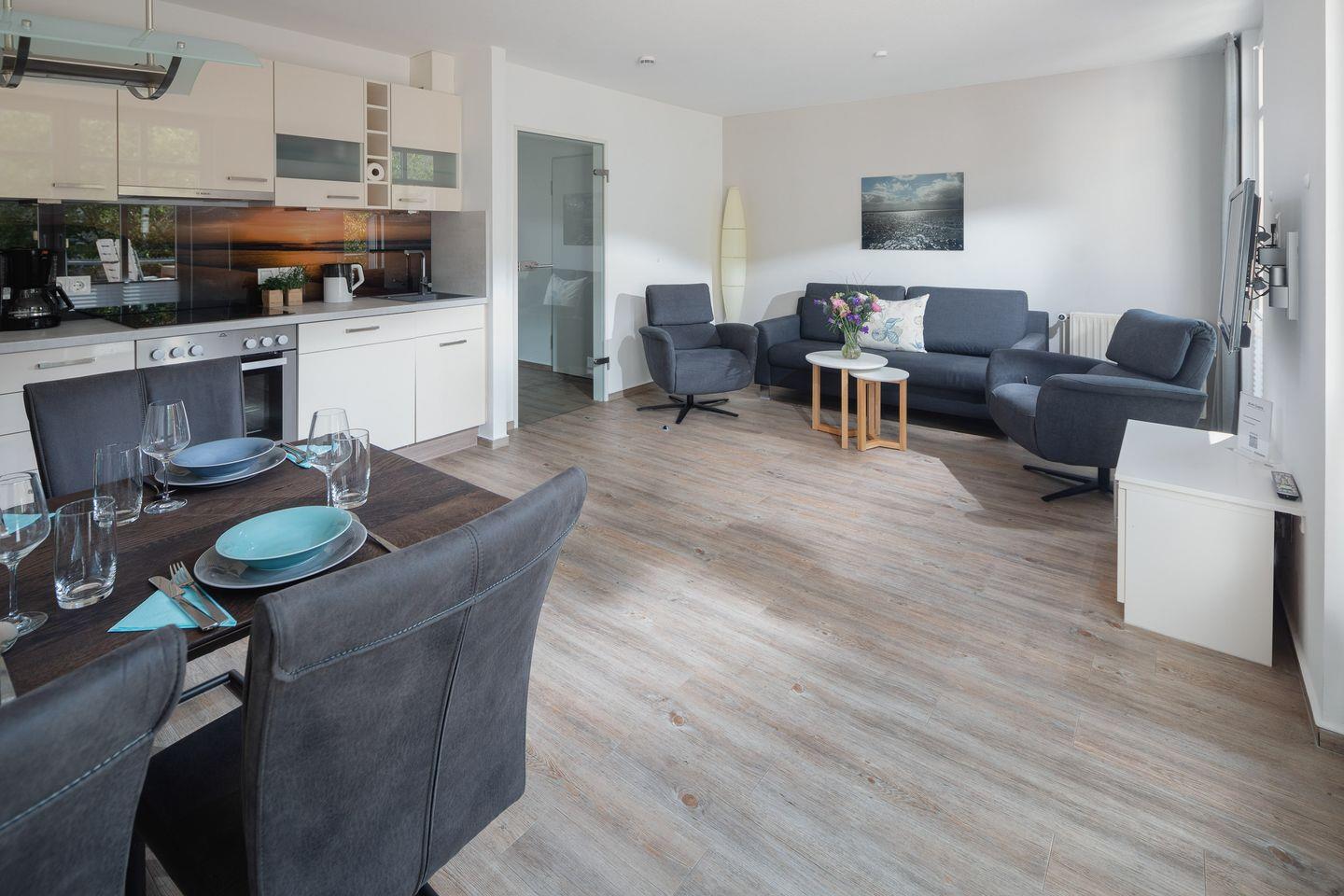 das moderne Appartement im 1. OG, 2026 Renoviert und mit neuen Matratzen ausgestattet, verfügt über zwei separate Schlafzimmer. Eines mit Doppelbett (zusätzliches TV) und eines mit zwei Einzelbetten. Über den Wohnraum mit Küchenzeile, Essecke und gemütlicher Sofaecke haben Sie Zugang zum großen Süd-Westbalkon. Das Badezimmer hat eine Dusche und WC.