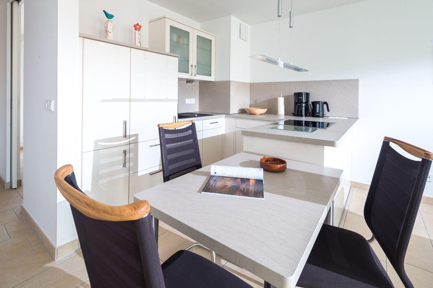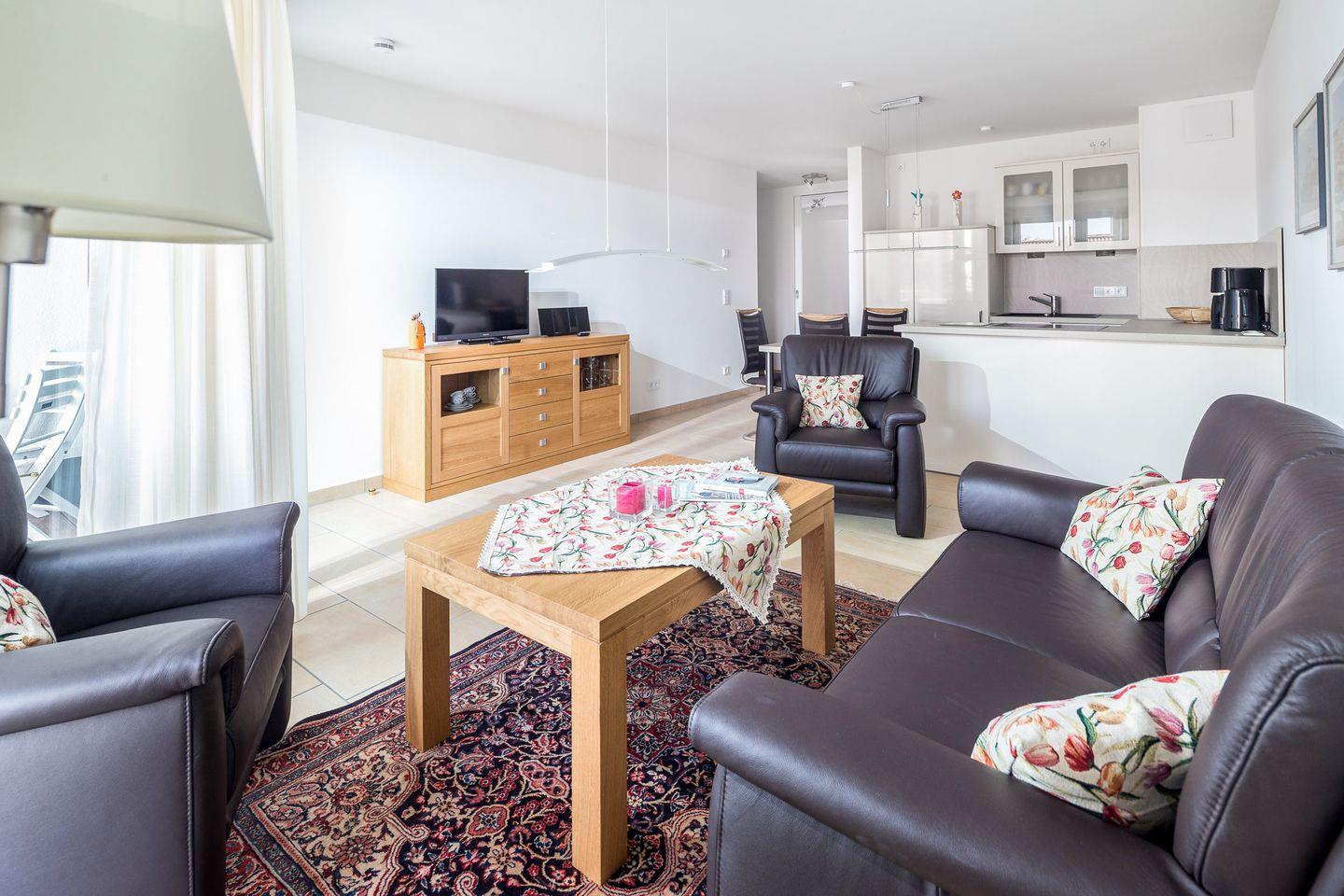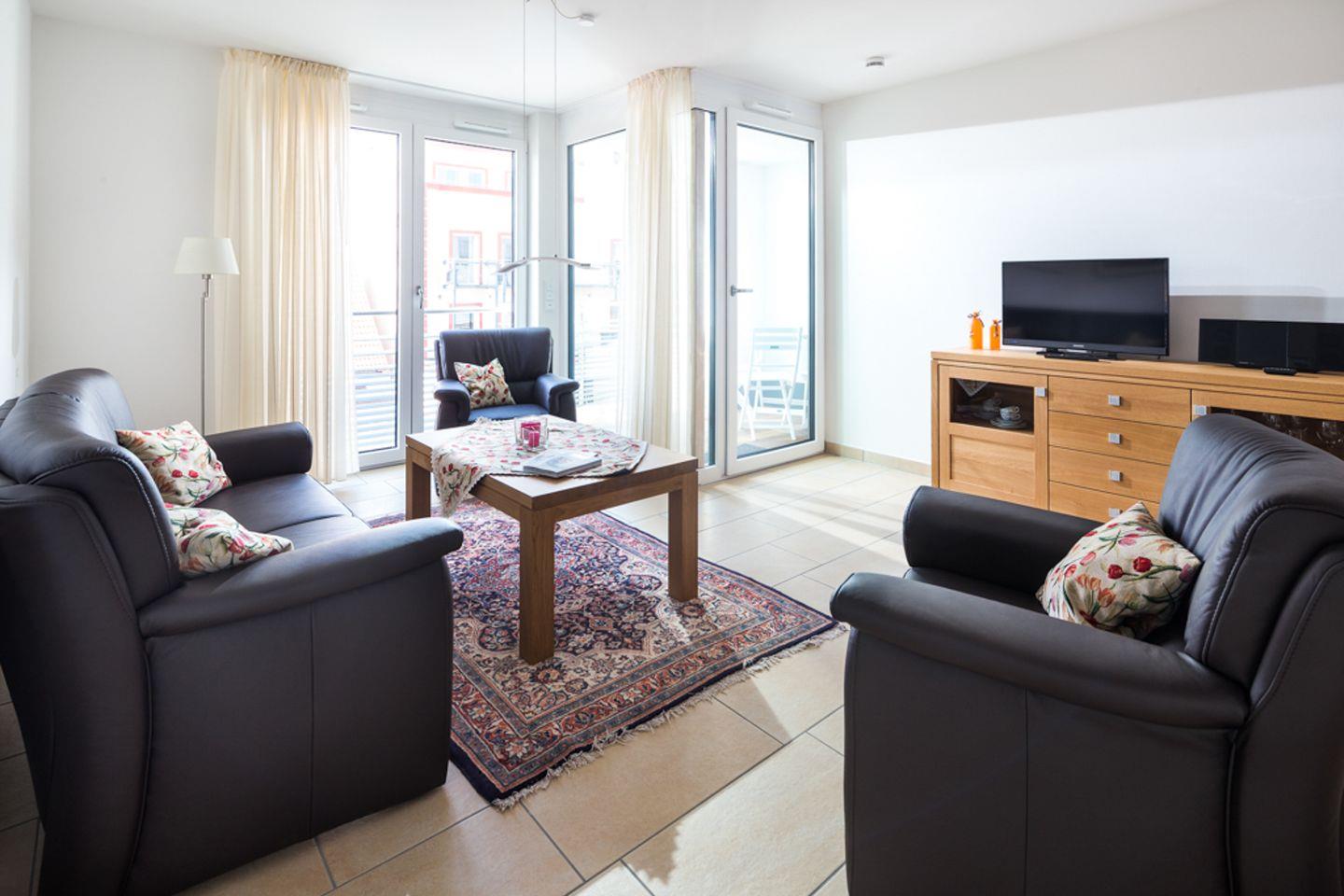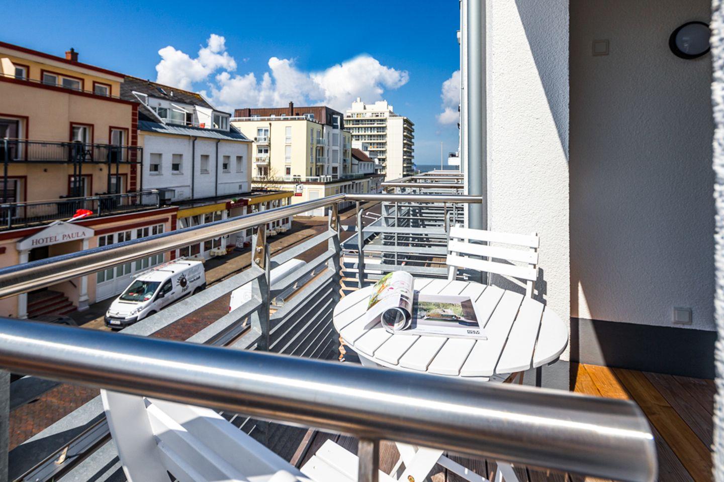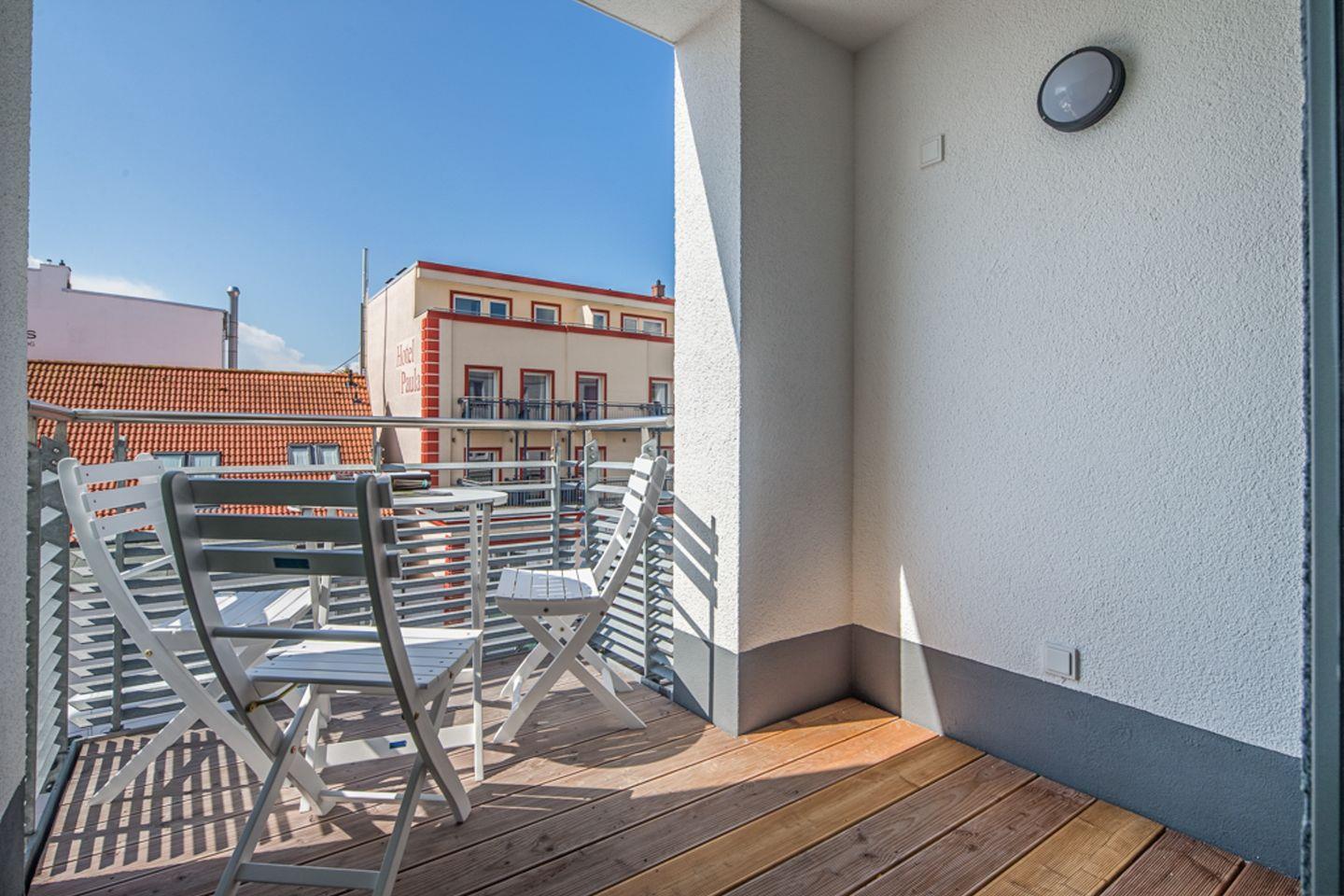 das exklusive Appartement im 2. OG verfügt über ein Schlafzimmer mit Doppelbett und eines mit Einzelbett. Von beiden haben Sie Zugang auf den kleinen Balkon im Hof Richtung Osten. Den zweiten Balkon betreten Sie durch das Wohnzimmer. Von diesem aus können Sie die Straße hinunter das Meer sehen. Der Wohnraum ist ausgestattet mit Sofaecke und Küchenzeile mit Esstisch für 3 Personen. Diele, Bad mit Dusche/WC. Fahrstuhl vorhanden.