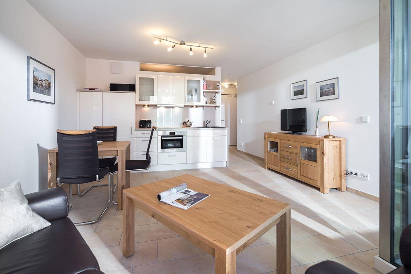 vom Balkon des Wohnzimmers können Sie die Straße hinunter das Meer sehen. Der Wohnraum ist ausgestattet mit Essecke, Küchenzeile und offener Diele. Das separate Schlafzimmer verfügt über einen weiteren kleinen Balkon Richtung Osten. Badezimmer mit XXL Dusche und WC. Die Wohnung liegt im 2. OG hat einen eigenen Zugang zum Fahrstuhl.