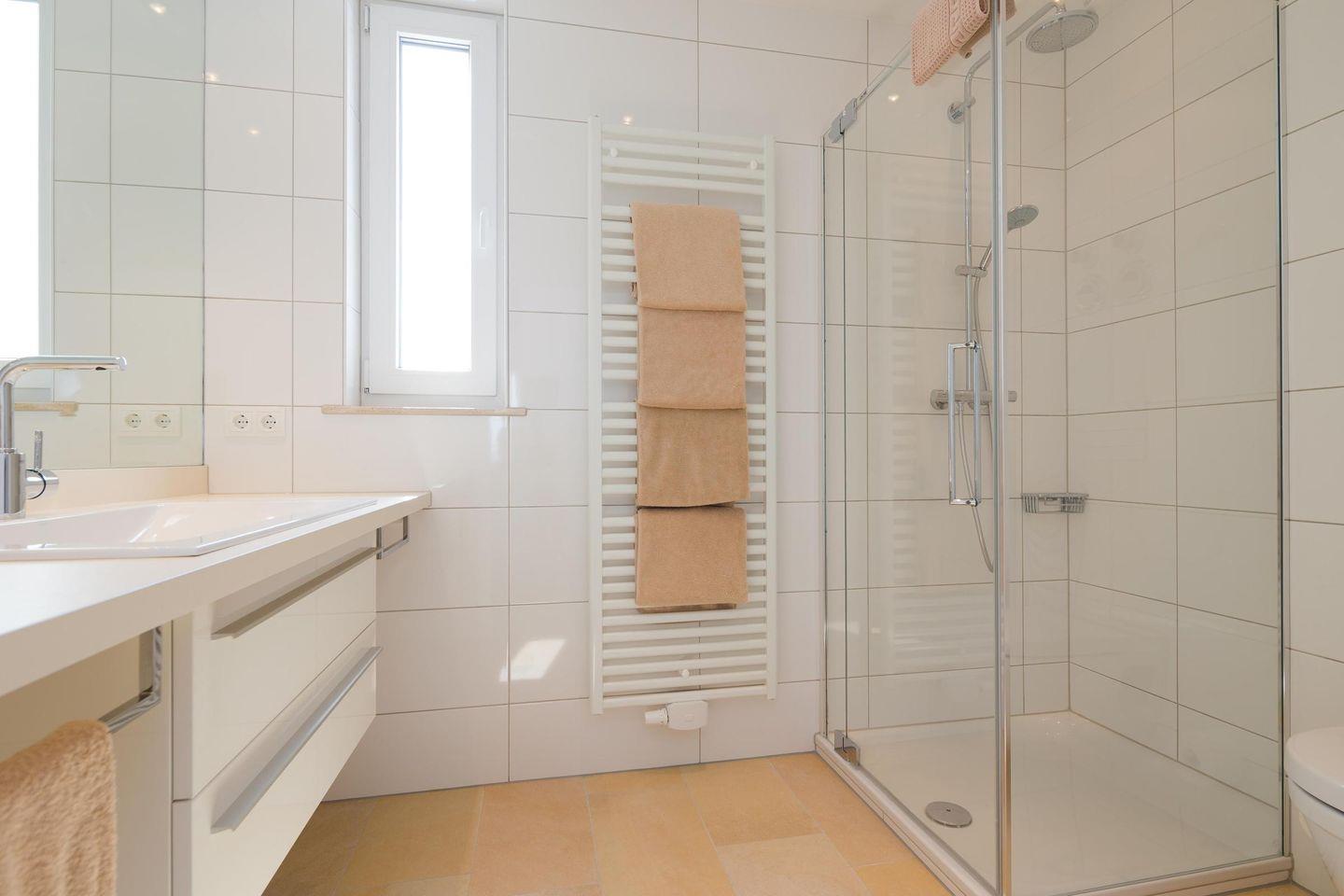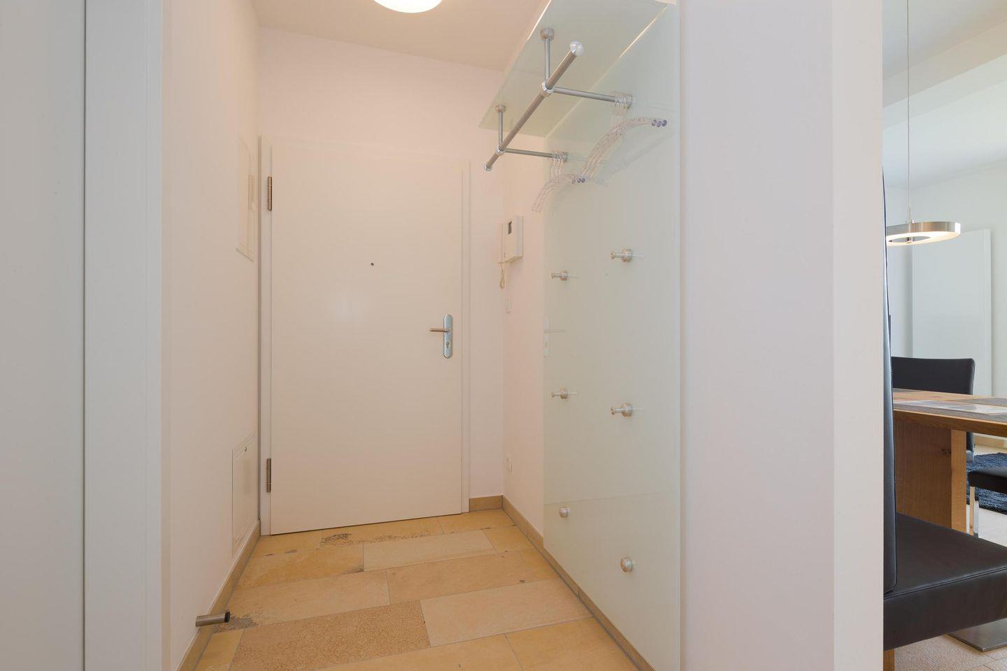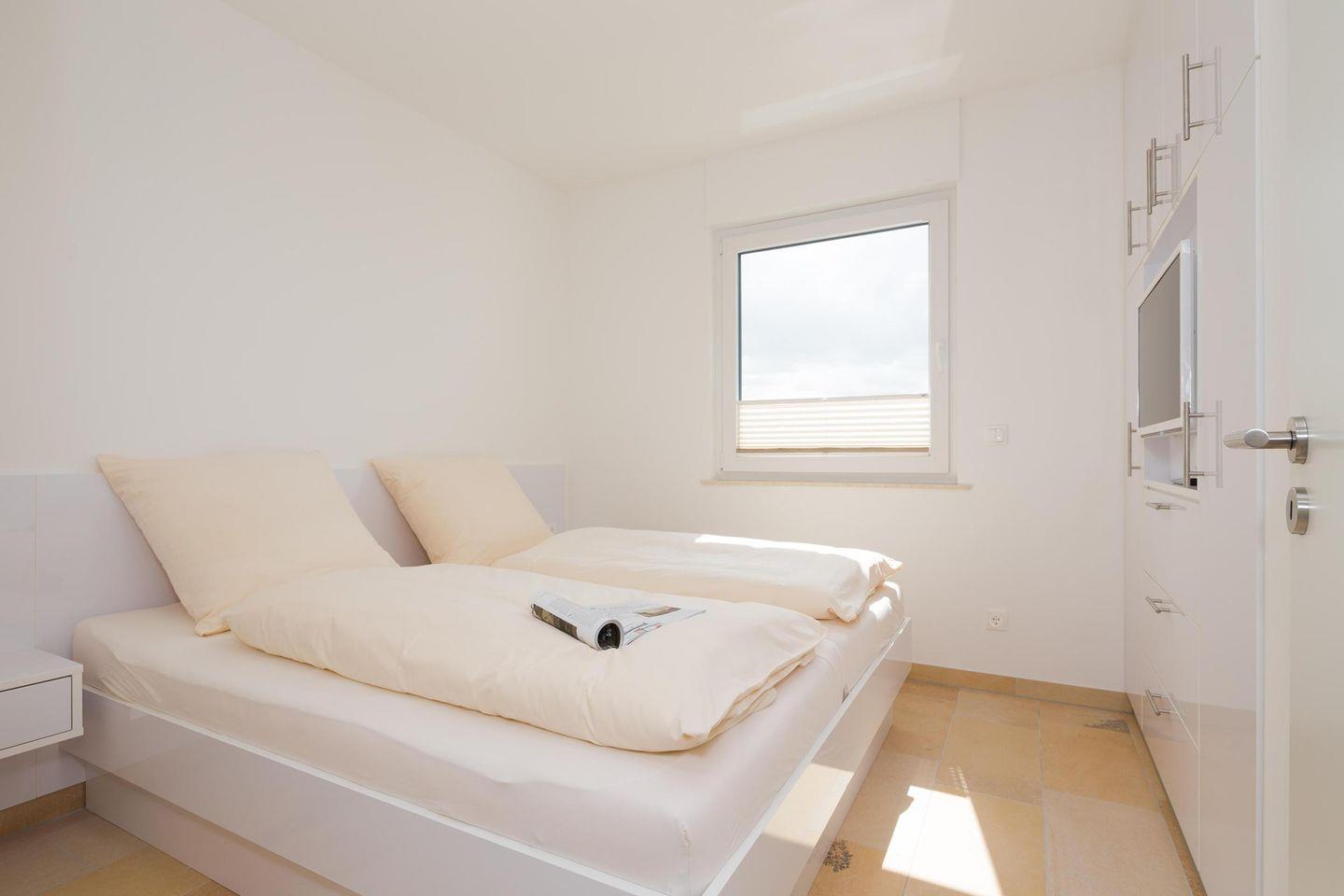 Wohnraum mit Küchenzeile, Essplatz und Sofaecke direkt an den Terrassenfenstern zum Balkon. Beide separate Schlafzimmer sind ausgestattet mit Doppelbett und haben zusätzlich TV. Der Balkon Richtung offene Nordsee ist sowohl vom Wohnzimmer als auch von einem der beiden Schlafzimmer zu begehen. Tageslichtbad mit Dusche/WC. Fahrstuhl vorhanden.