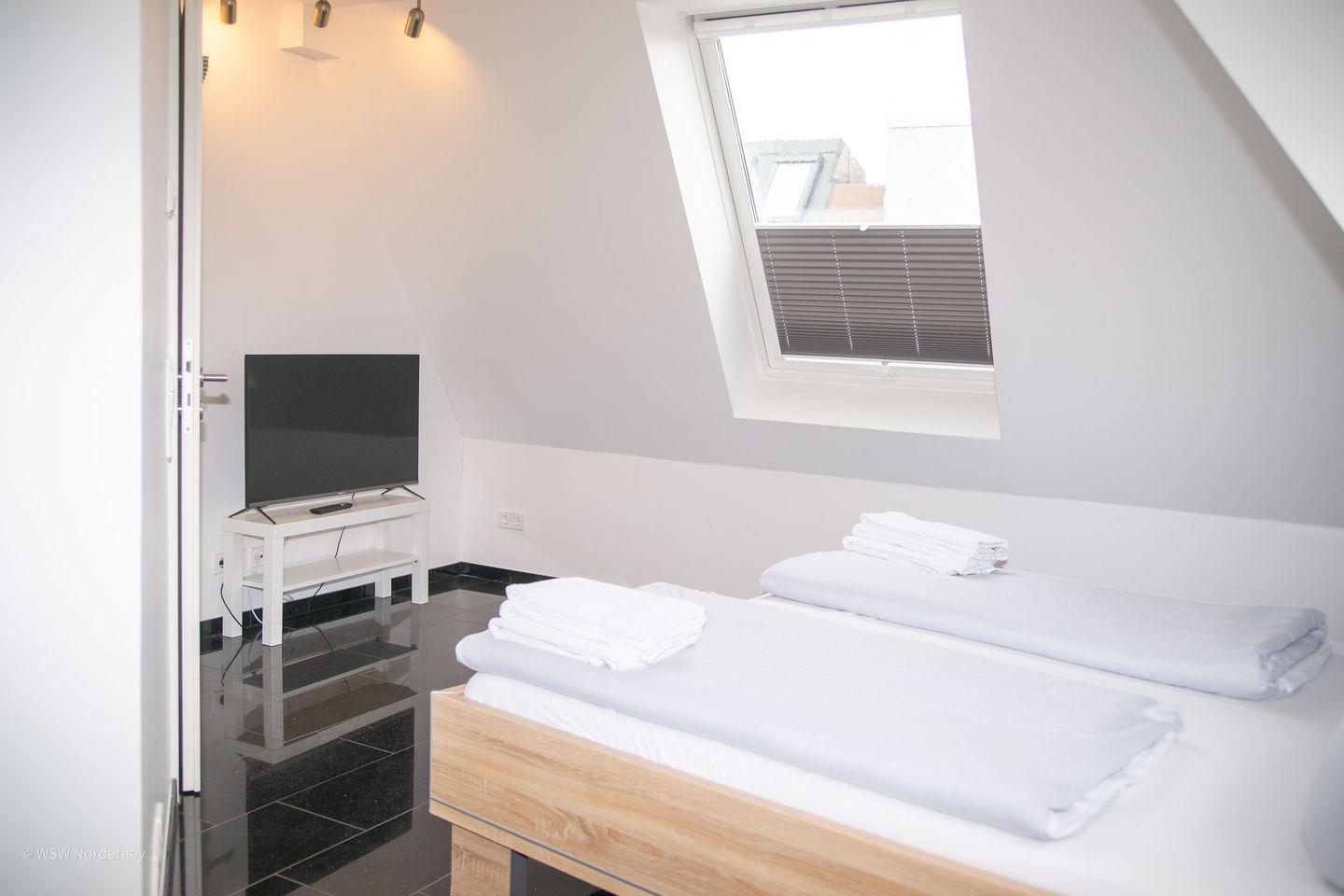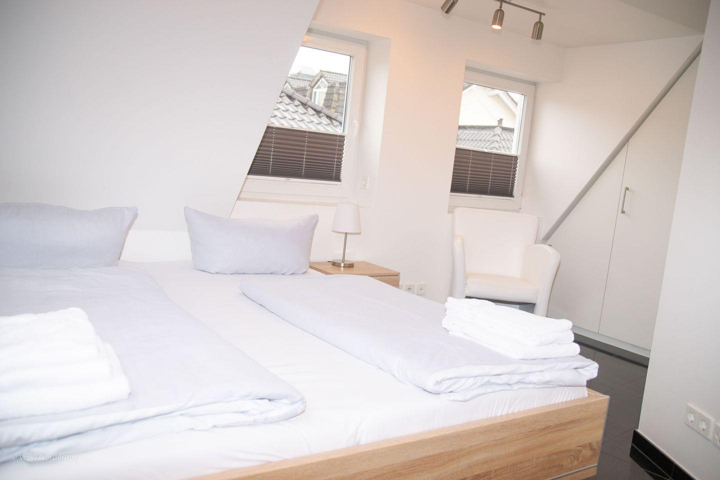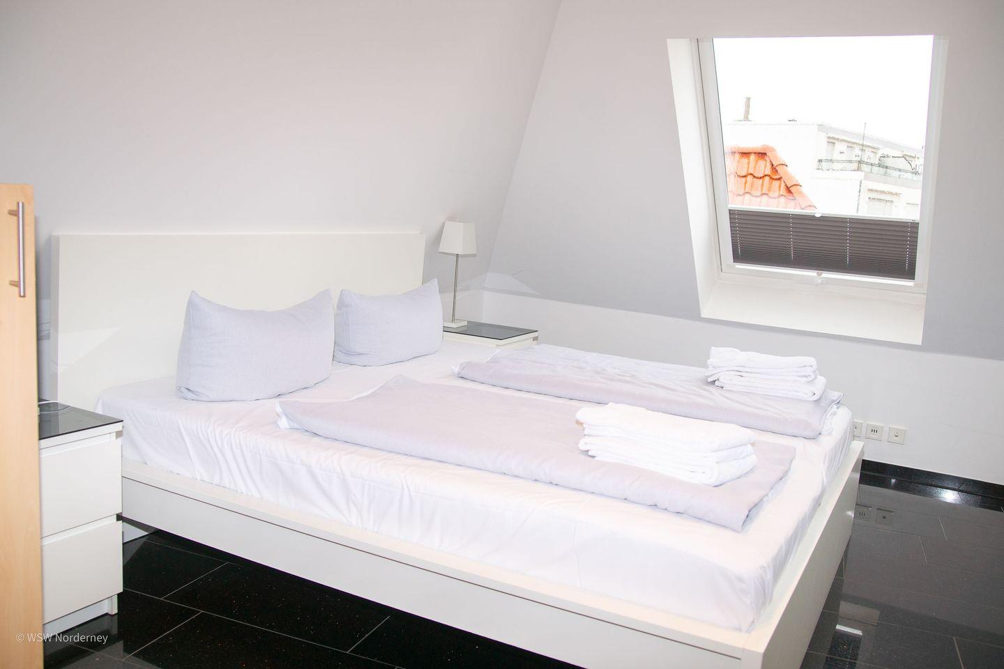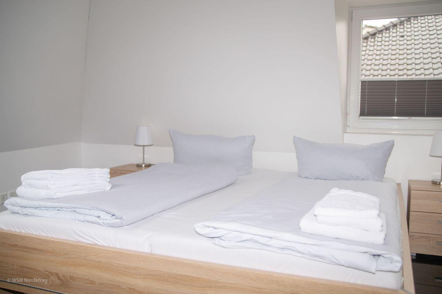 zwei geräumige Schlafzimmer mit je einem Doppelbett werden durch einen Wohnraum mit Sitz-und Essecke miteinander verbunden. Die vollausgestattete Küchenzeile befindet sich hinter einer halbhohen Wohnwand. Neben einem Tageslichtbad mit Dusche/WC gibt es auch ein zusätzliches Gäste-WC. Bäcker, Geschäfte und der Norderneyer Kurplatz mit Conversationshaus sind in Sichtnähe, Unterhaltungsmöglichkeiten in unmittelbarer Umgebung.