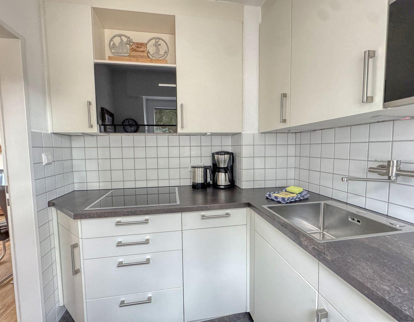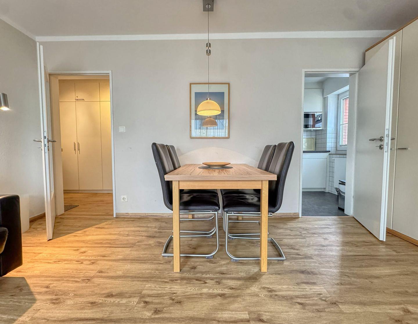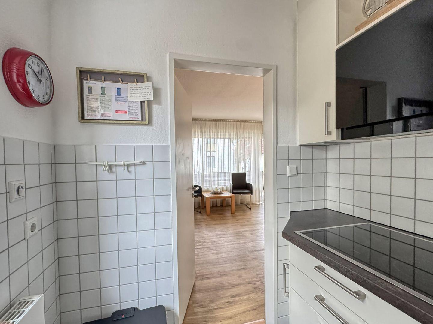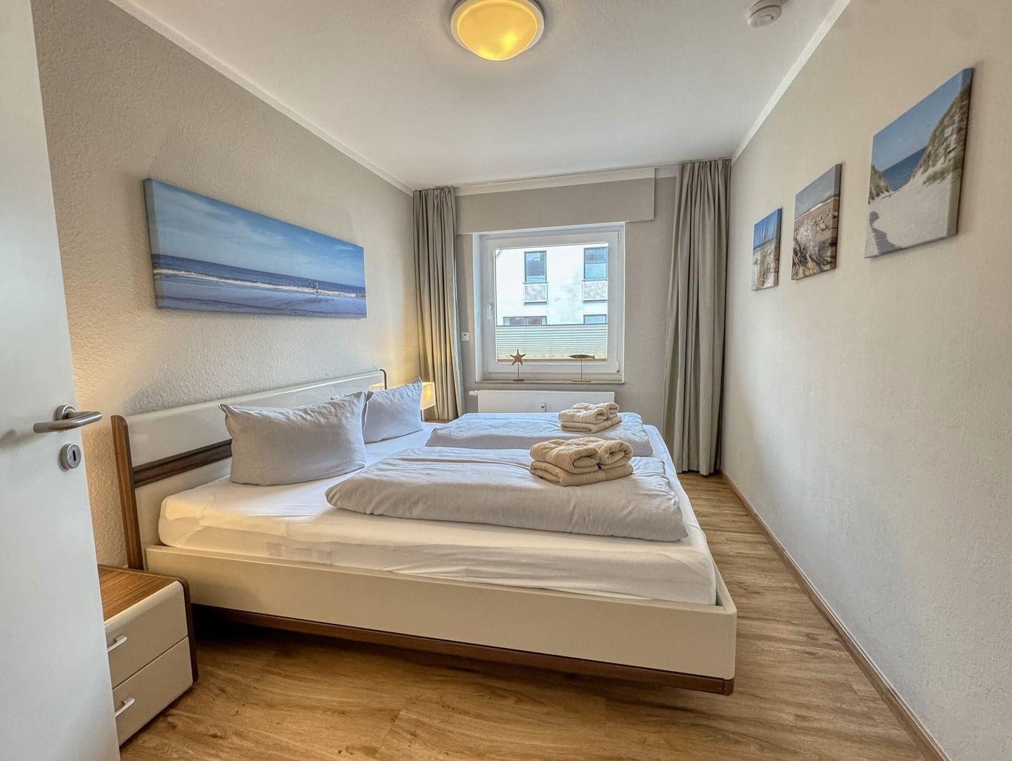 separates Schlafzimmer mit Doppelbett, Wohn-Schlafraum (Schlafsofa 1,60m breit) mit Essecke, Diele. Badezimmer mit Dusche/WC. Die vollausgestattete Küchenzeile ist separat um die Ecke vom Wohnzimmer in einer Nische. Der Westbalkon ist überdacht und liegt zu einer ruhigen Nebenstraße raus. Der Strandaufgang zum Surfcafé und Riffkieker ist nur einen Steinwurf entfernt.