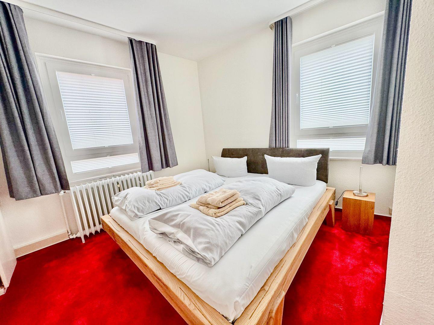 das geräumige Appartement im 1. OG verfügt über 2 separate Schlafzimmer: eines mit Doppelbett und zusätzlichem TV, das andere mit 2 Einzelbetten, die sich zusammenschieben lassen. Das Wohnzimmer ist durch einem offenen Durchgang mit dem Esszimmer verbunden. Die Küche ist separat mit einem Esstresen am Fenster für 2 Personen. Das Tageslichtbad hat Dusche/Waschbecken, das WC ist separat. Der kleine Balkon (15qm) Richtung Westen bietet Platz für 3-4 Personen.