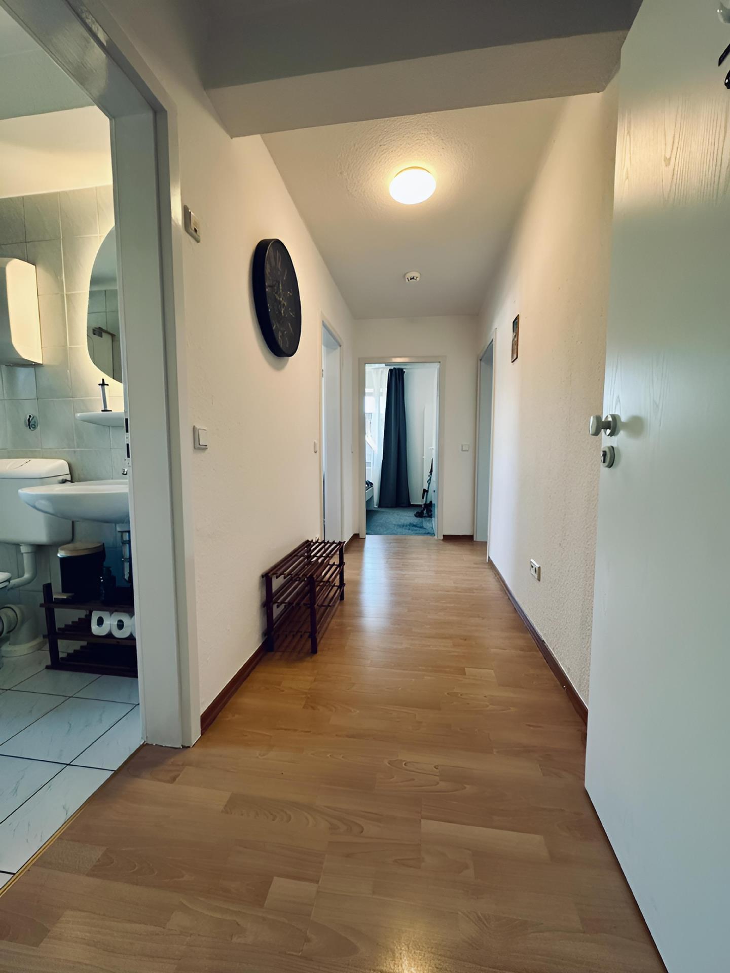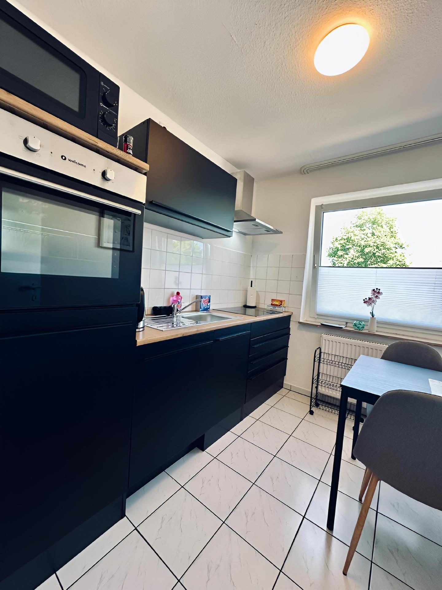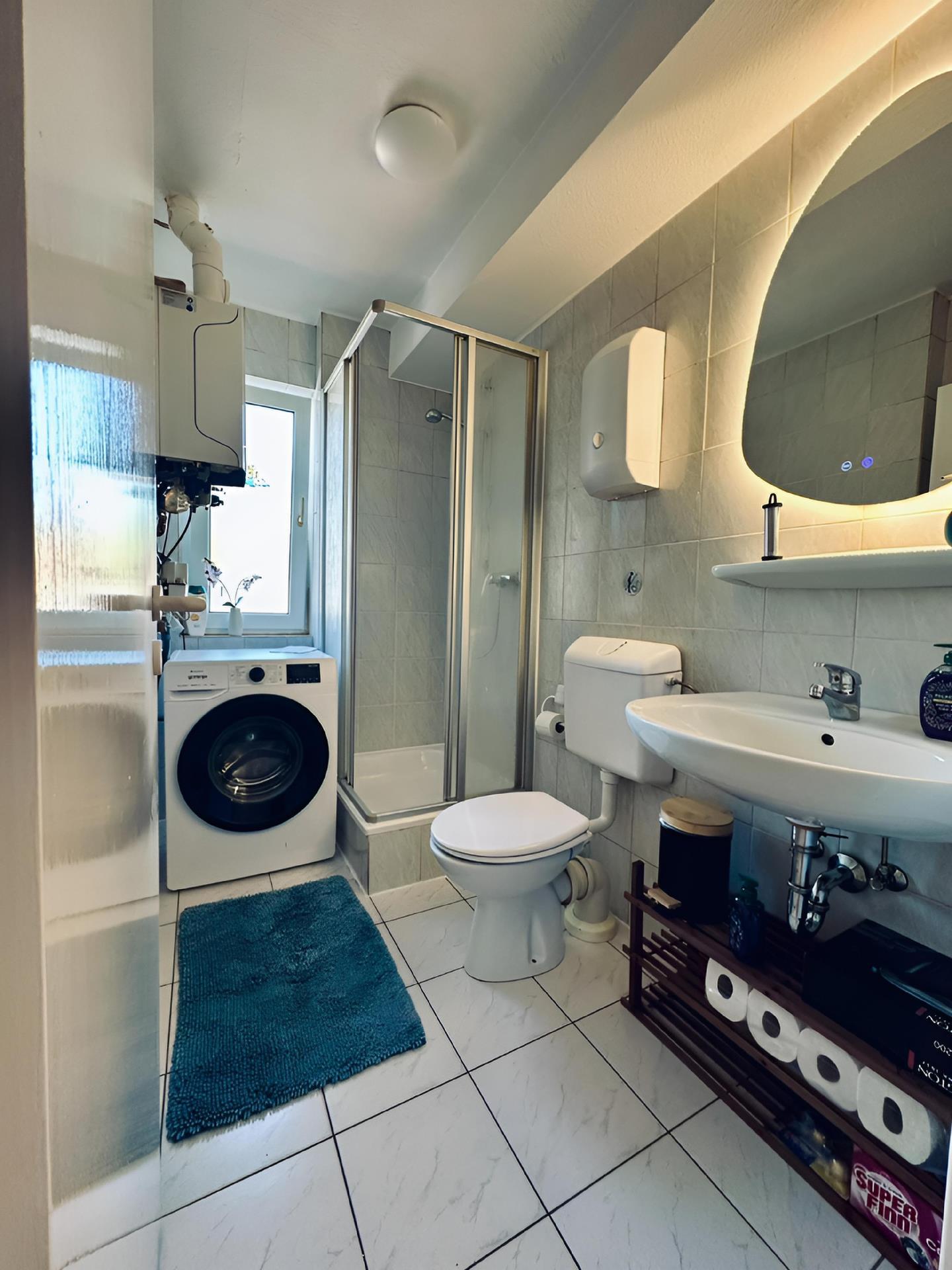 Inside, the flat impresses with its bright and elegant furnishings. It includes a cosy kitchen with dining area that invites you to linger, as well as a modern kitchen equipped with everything your heart desires, including a kettle for relaxed coffee moments. The bathroom is equipped with a practical shower. Furthermore, amenities such as a washing machine and tumble dryer, both for communal use in the building, as well as a fan provide additional comfort during your stay.