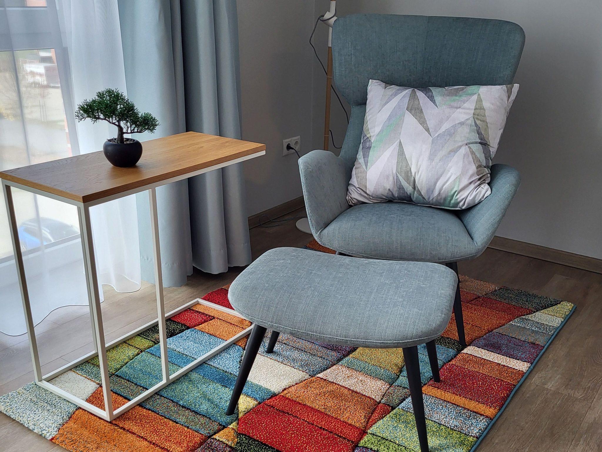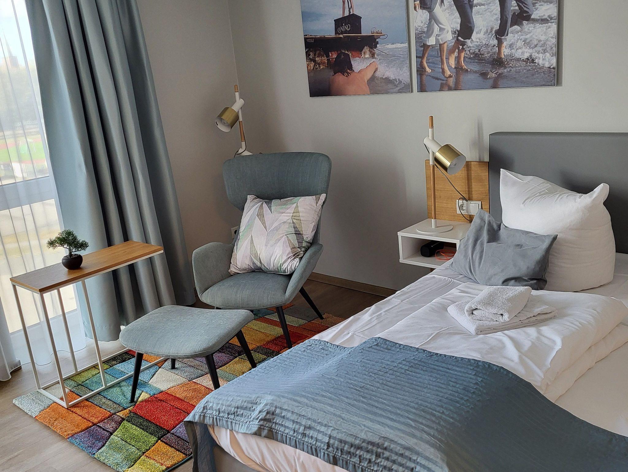 Das 1,40 m breite Boxspringbett im Schlafbereich bietet allerhöchsten Schlafkomfort. Die Garderobe im Eingangsbereich und der Kleiderschrank, sowie die wohnliche Sitzecke mit Sessel und Hocker runden die Einrichtung ab.