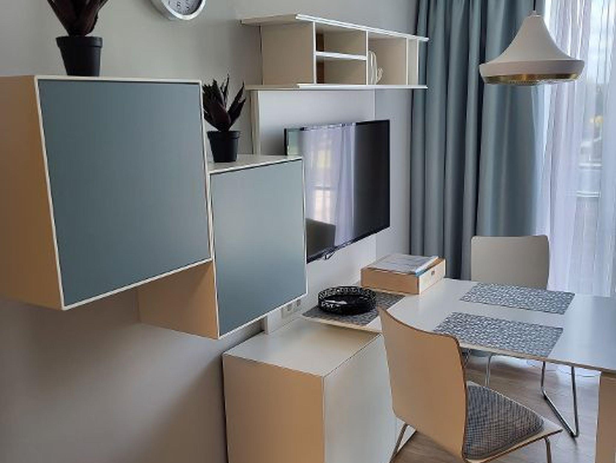 Der Tisch im Essbereich mit 2 Stühlen ist multifunktional und kann durch seine technische Ausstattung auch als Schreibtisch genutzt werden. Ganz selbstverständlich verfügen die Apartments über einen kostenfreien Internetanschluss, einen internetfähigen Smart-TV und ein Bluetooth-Radio.