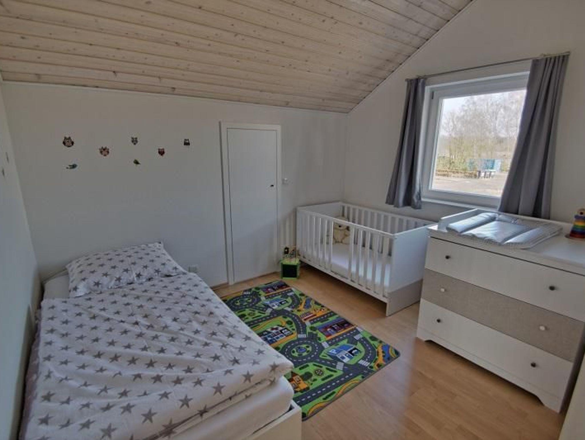 Im Obergeschoss befinden sich ein weiteres Schlafzimmer mit Doppelbett, ein Kinderzimmer mit Baby- bzw. Kleinkindbettchen, ausziehbarem Kojenbett (mit Platz für zwei Kinder oder Erwachsene), Wickelkommode und Spielteppich, ein Bad mit Dusche, WC und Waschmaschine und einer Galerie, die mit ihren zwei Relaxliegen zum Entspannen einlädt.