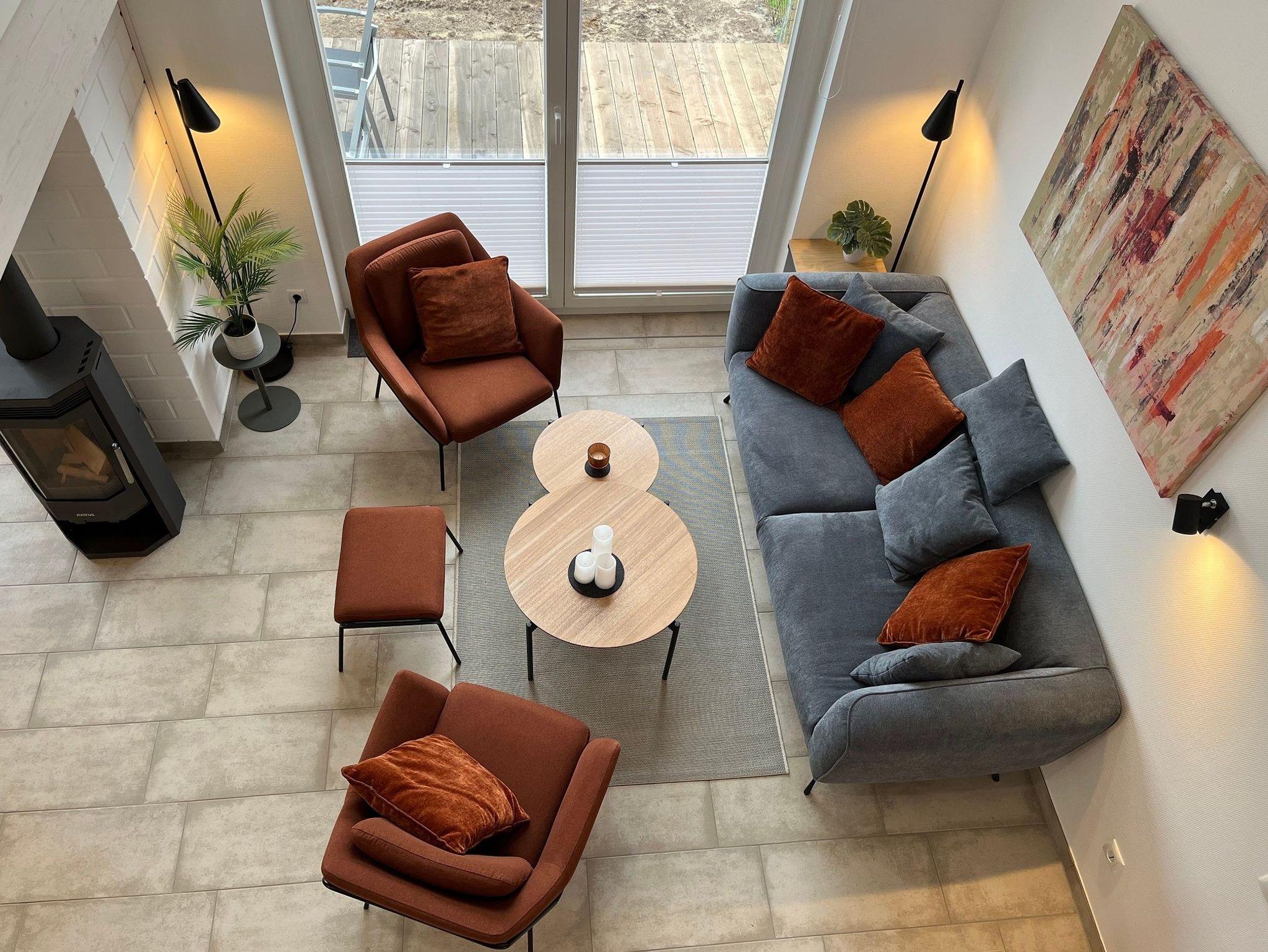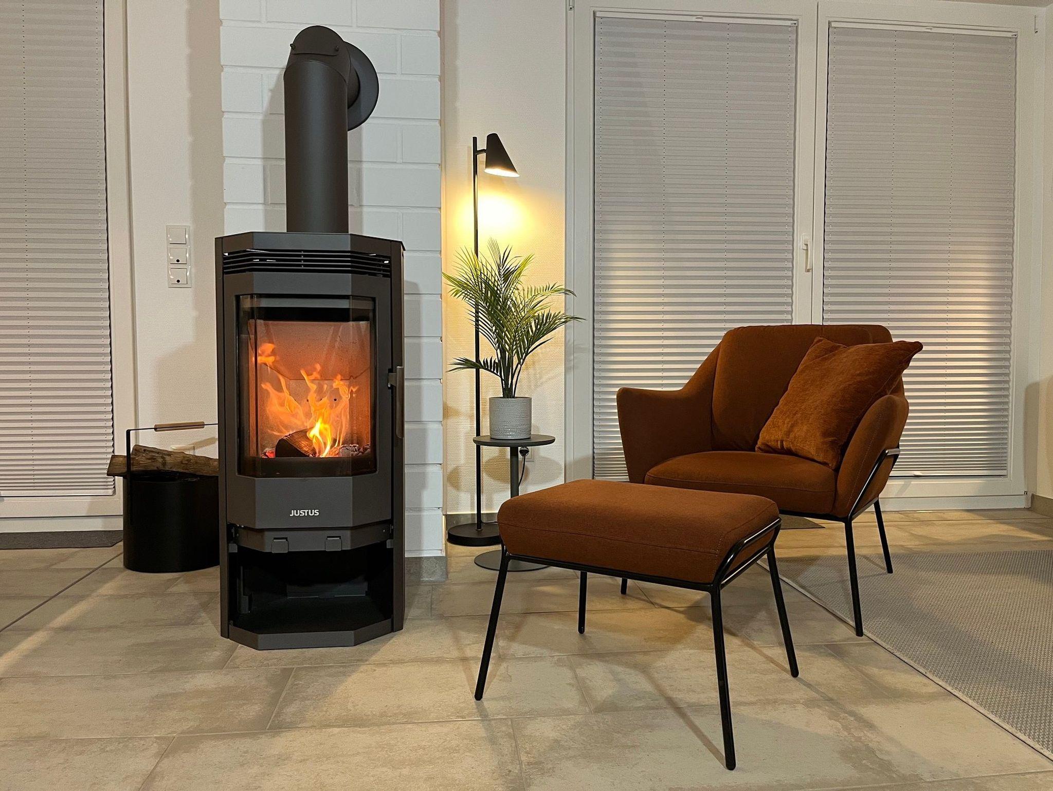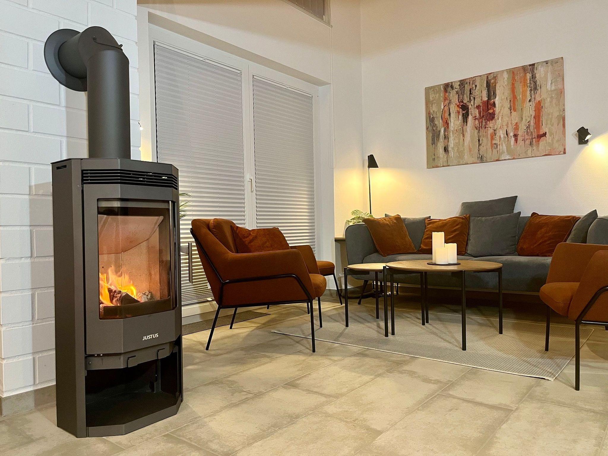 Das Wohnzimmer bietet ein 3er-Sofa, 2 Sessel mit Hocker, 55 Zoll Smart-TV und Kaminofen.