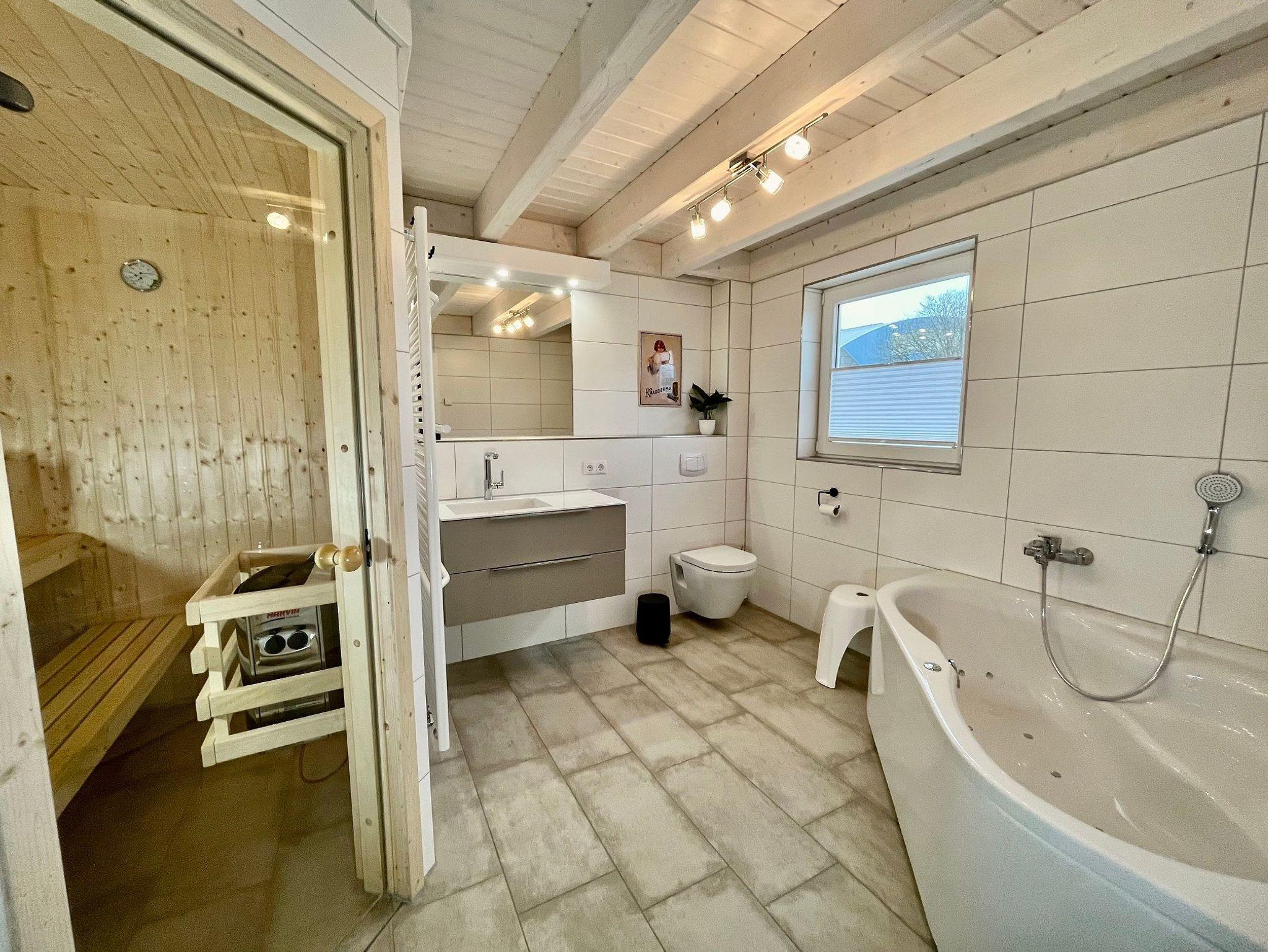Badezimmer EG: Whirlpoolwanne, WC, Fenster, Sauna, Dusche, Handtuchtrockner, Kosmetikspiegel und Föhn.