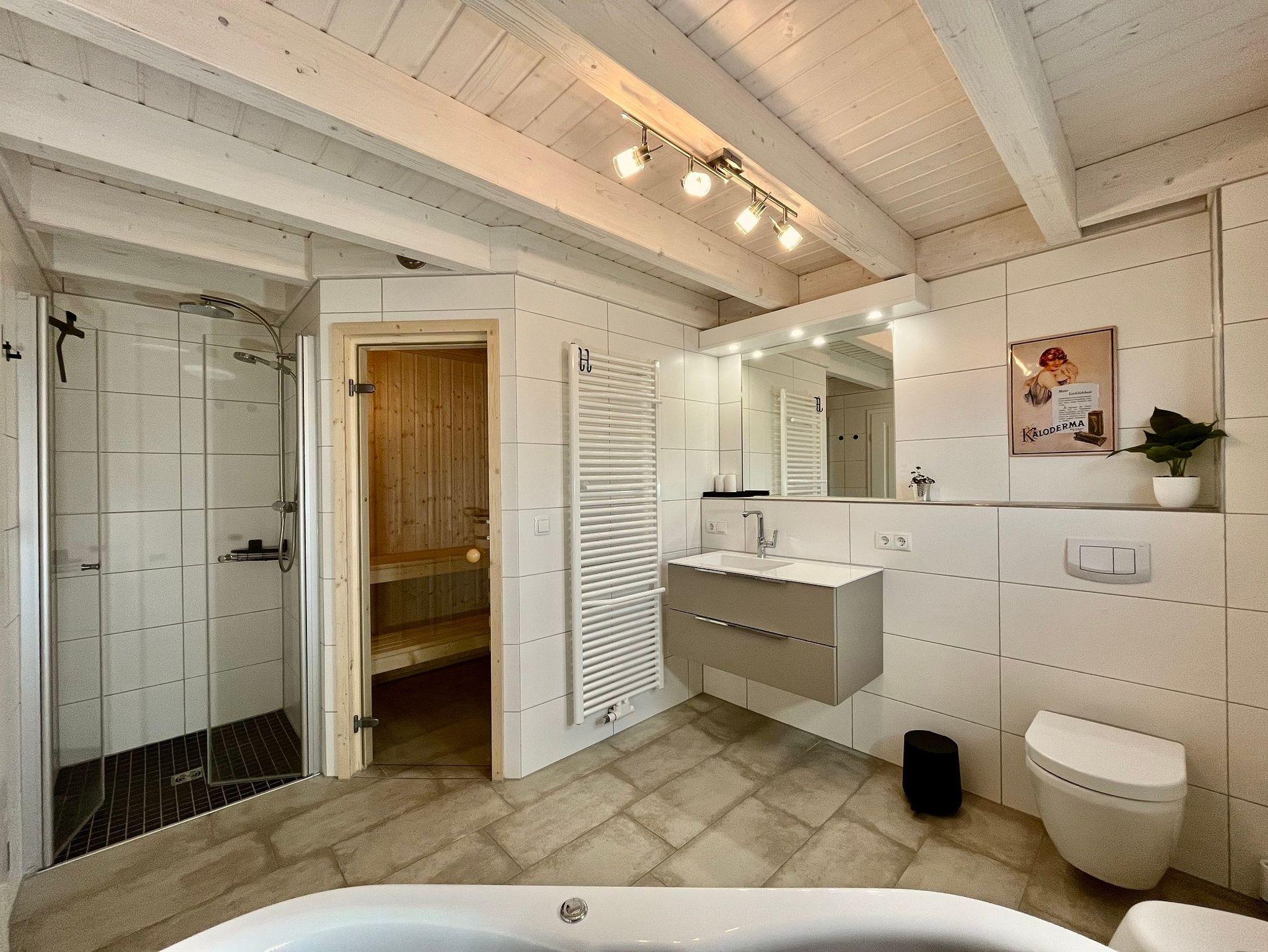Erdgeschoss: Wellnessbad mit Sauna, Whirlpool-Wanne und Regendusche