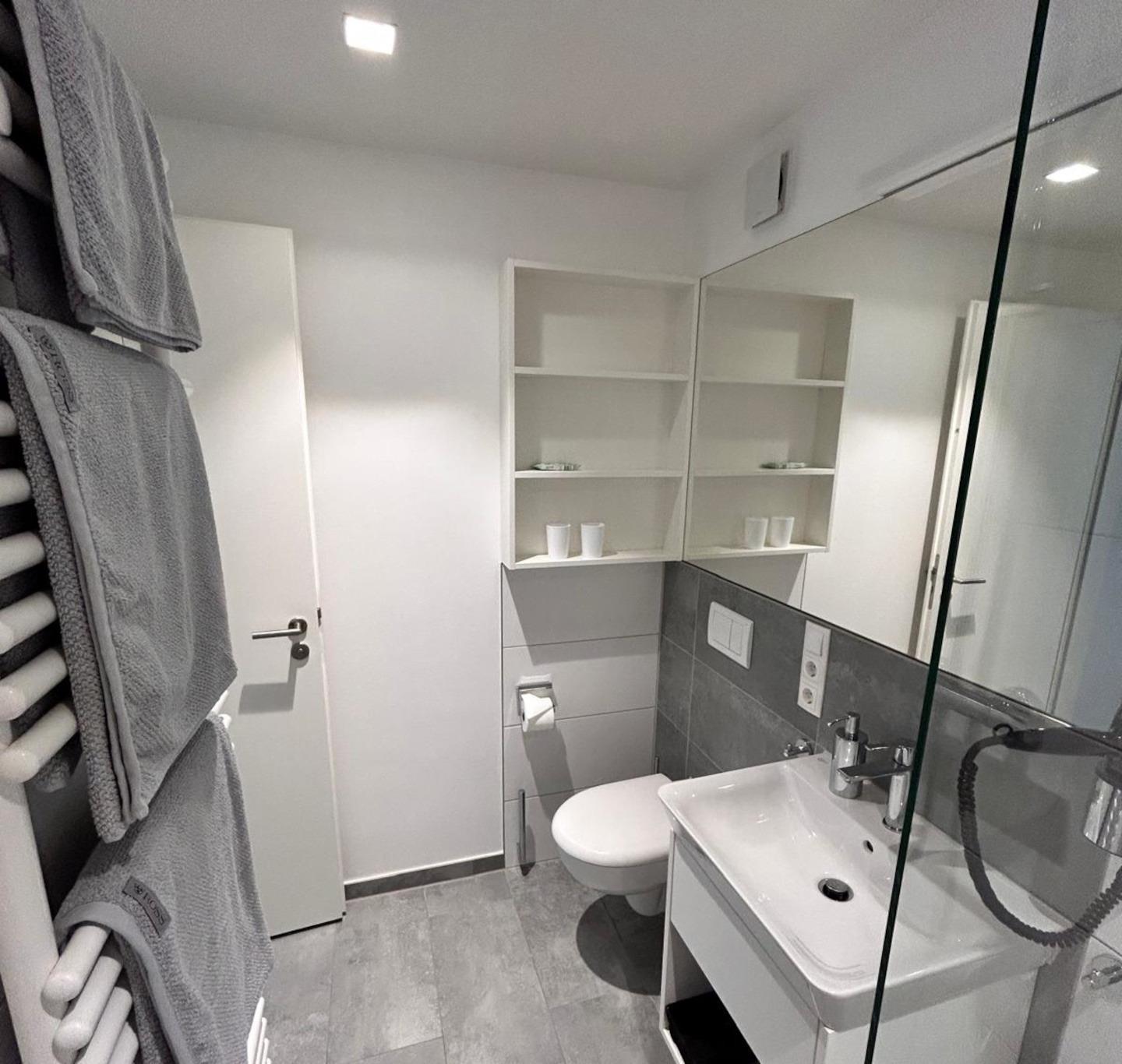 Dieses funktionale, elegante Design wird im Badezimmer durch eine bodengleiche Dusche fortgesetzt. Waschtischunterschrank, Spiegel, Föhn und Seifenspender gehören ebenfalls zur Standardeinrichtung.