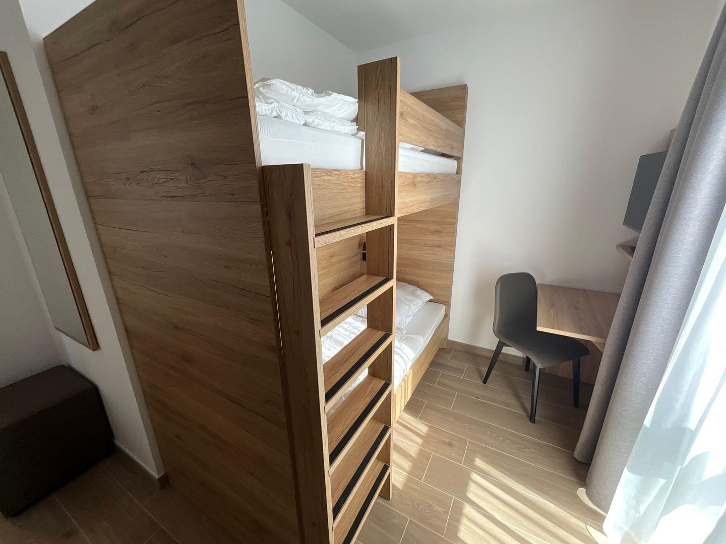 Schlafzimmer 2: Etagenbett (Maße: 2 x 90x200 cm), Flat-TV, Leselampen, Kleiderschrank, Verdunkelungsvorhänge