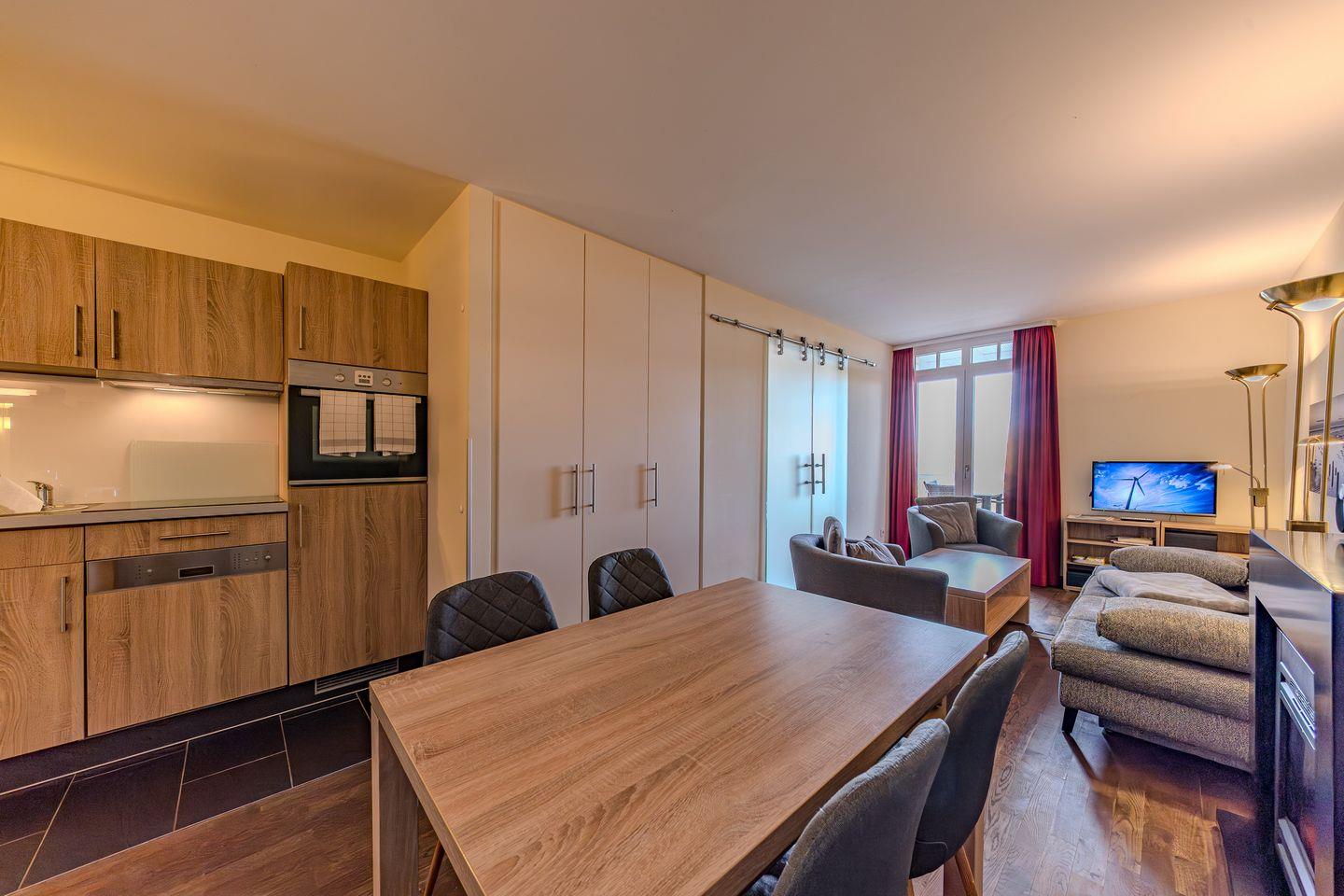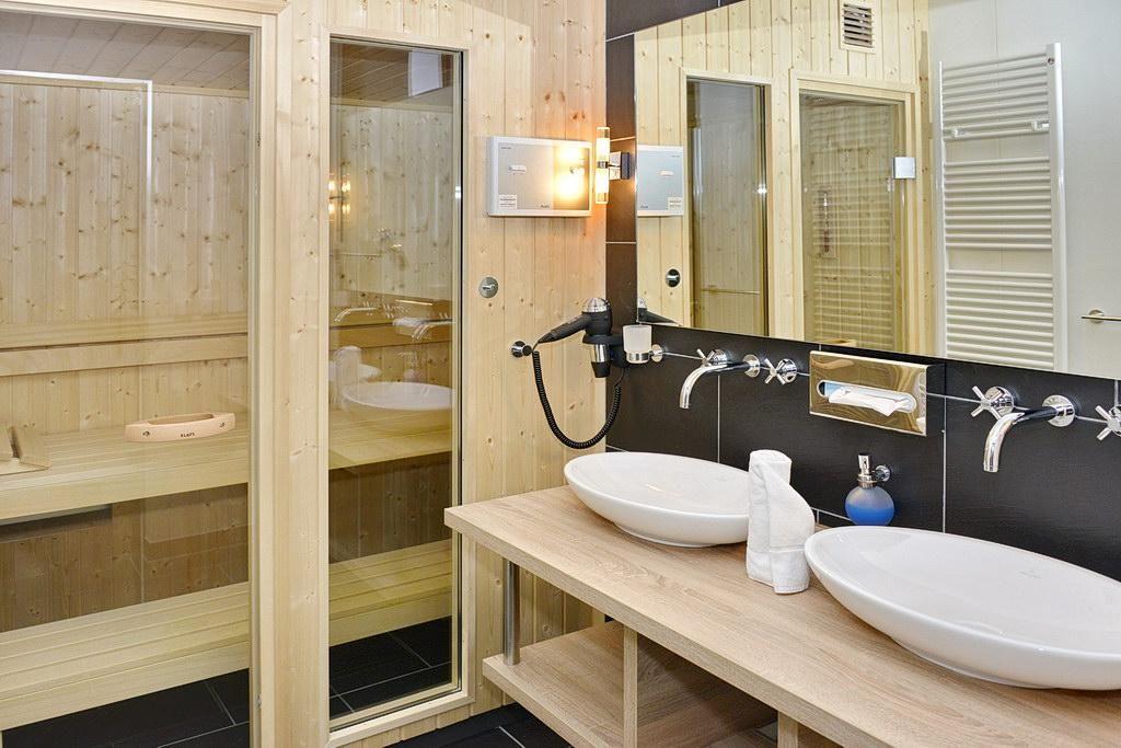 Das moderne Nichtraucher-Apartment verfügt über eine voll ausgestattete offene Küche mit Geschirrspüler, Kaffeemaschine, Toaster, Wasserkocher, Tiefkühlfach und Backofen. In den beiden Schlafzimmern stehen euch jeweils ein Doppelbett (1,80 x 2,00 m), im Wohn-Essbereich ein Flatscreen-TV, eine HiFi-Anlage und ein Elektrokamin zur Verfügung. Das hochwertige Badezimmer lässt keine Wünsche offen – ausgestattet mit einem Doppelwaschtisch, begehbarer Dusche, separatem WC und Bidet, Föhn und Kosmetikspiegel sowie der großzügigen eigenen Sauna lässt sich hier wunderbar entspannen. Das Apartment verfügt über einen Balkon mit eigenem Strandkorb und Gartenmöbeln. Von hier aus genießt ihr einen idyllischen Blick in das Hinterland. Ein Kinderbett kann gegen Entgelt aufgestellt werden und auf Wunsch könnt ihr einen Hochstuhl hinzubuchen.