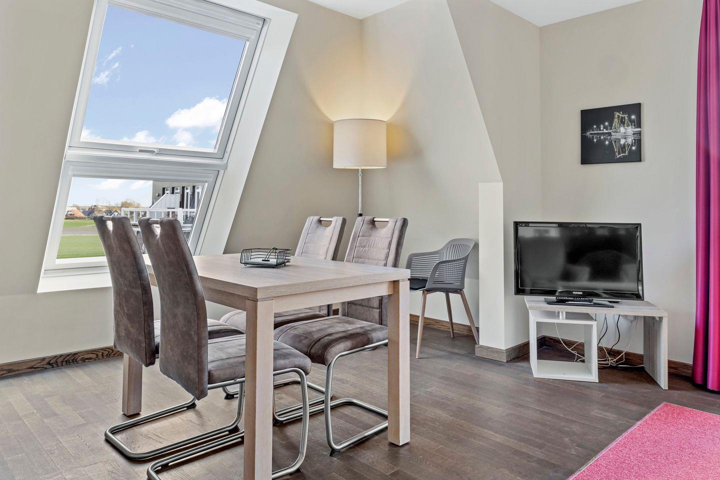 Das 92 m² große 3-Zimmer Penthaus ist für bis zu 4 Personen geeignet. Besonders hervorzuheben sind die Sauna im Apartment und die zwei großzügigen Balkone mit seitlichem Meerblick bzw. mit Blick Richtung Bremerhaven und Überseehafen.