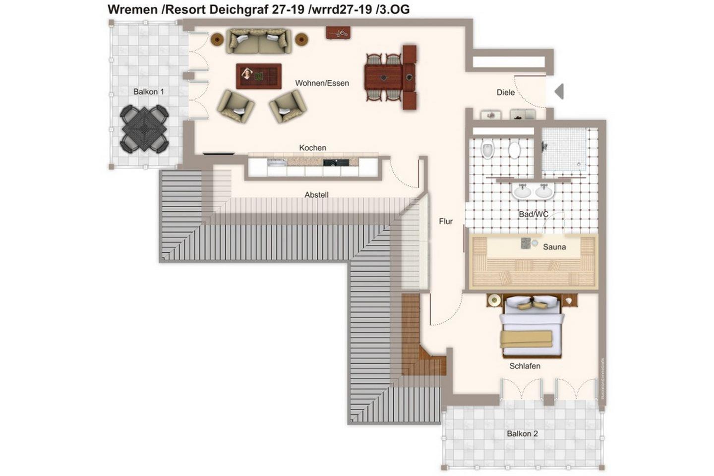 Das hochwertige Penthaus-Apartment befindet sich in Süd-West-Lage und nur wenige Meter vom Deich entfernt, inmitten des Weltnaturerbes Wattenmeer. Im dritten Obergeschoss, dem Dachgeschoss des Hauses gelegen, genießt ihr hier an jedem Tag das milde Meeresklima, einen großartigen Ausblick und das typische Nordseefeeling. In wenigen Gehminuten sind der idyllische kleine Kutterhafen, der Grünstrand und der Leuchtturm Kleiner Preuße - das Wahrzeichen Wremens erreicht. In der nahen Umgebung findet ihr Einkaufsmöglichkeiten und Restaurants.