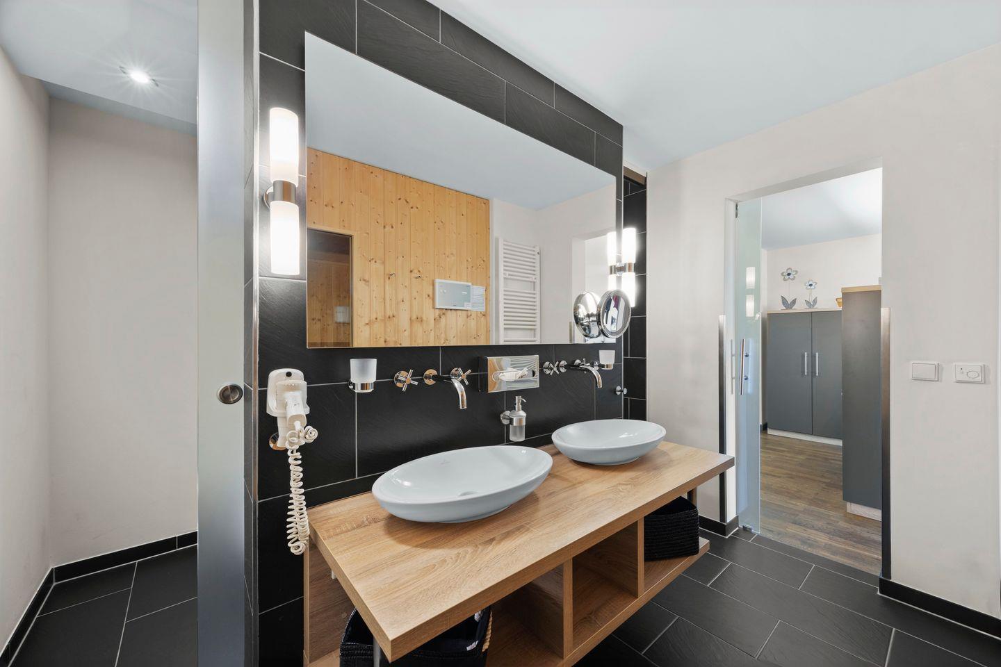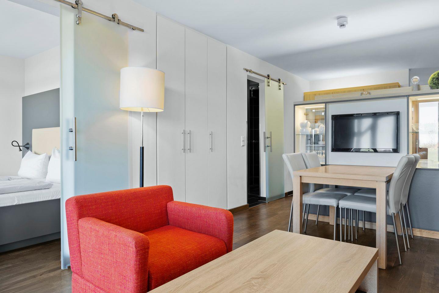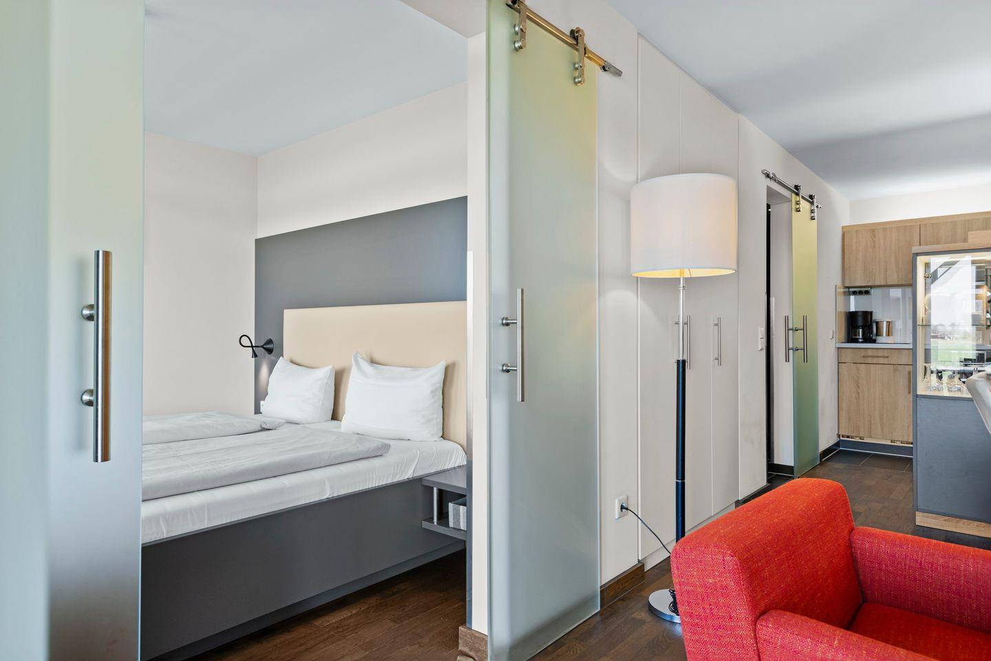 Ein Kinderbett kann gegen Entgelt aufgestellt werden und auf Wunsch könnt ihr einen Hochstuhl hinzubuchen. Im komfortablen Badezimmer mit begehbarer Dusche, WC und Bidet, Föhn und Kosmetikspiegel befindet sich eine eigene Sauna zur vollkommenen Entspannung in privater Atmosphäre. Das Apartment verfügt außerdem über eine ruhig gelegene, windgeschützte Terrasse in östlicher Lage mit Gartenmöbeln und wunderschönem Blick ins Grüne. Hier genießt ihr bereits beim Frühstück den Sonnenschein. Die Terrasse ist sowohl vom Wohn- als auch vom Schlafzimmer begehbar.