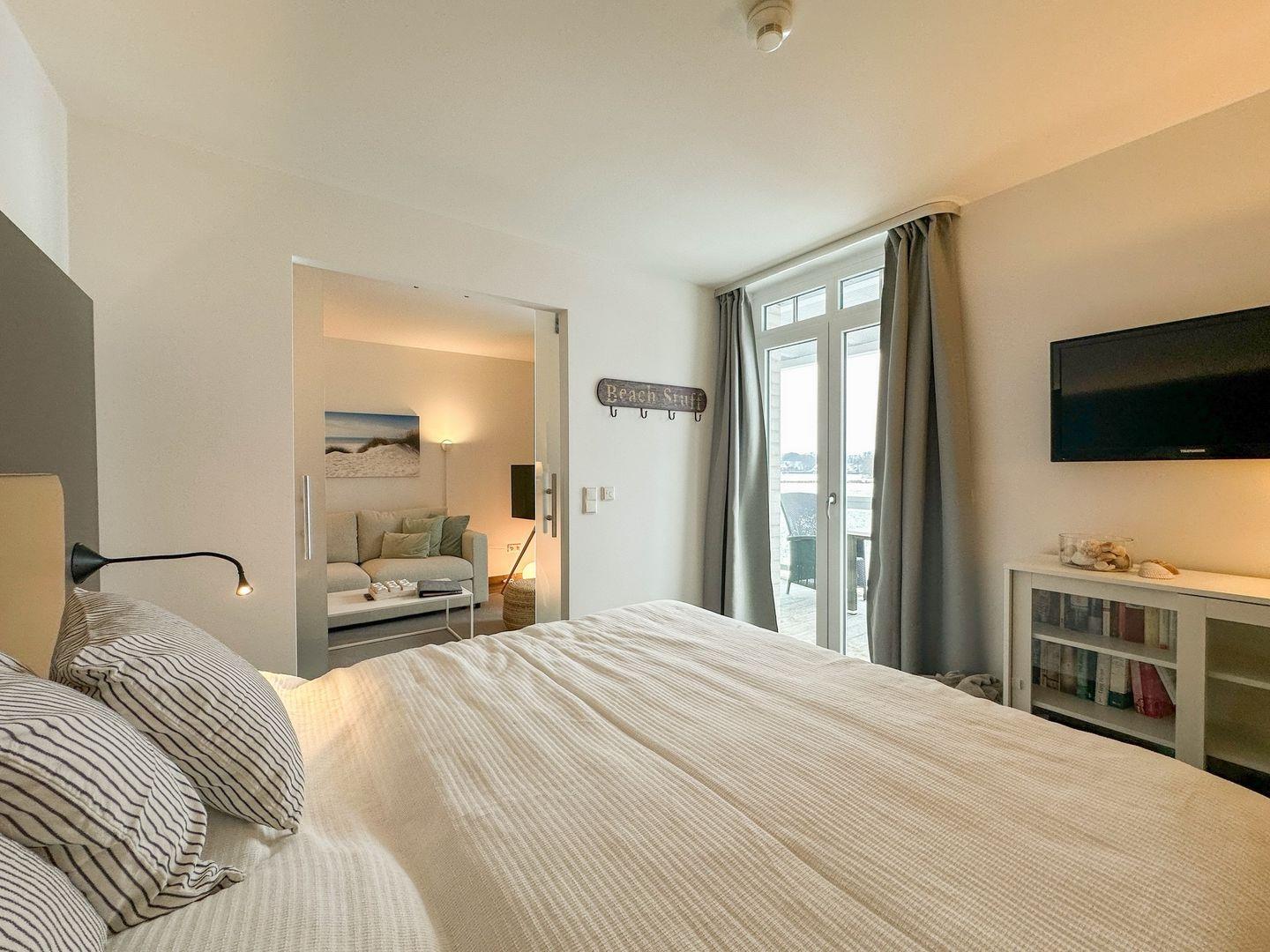 Das hochwertige Badezimmer ist eine richtige kleine Wohlfühloase - ausgestattet mit einem Doppelwaschtisch, begehbarer Regendusche, separatem WC, Bidet, Handtuchwärmer, Föhn und Kosmetikspiegel sowie der eigenen Sauna lässt sich hier wunderbar entspannen. Das Apartment verfügt über einen großzügigen, überdachten Balkon mit eigenem Strandkorb Gartenmöbeln und einem idyllischem Blick ins Umland und auf den Deich. Der sonnige Balkon ist vom Wohn- und Schlafzimmer aus begehbar.