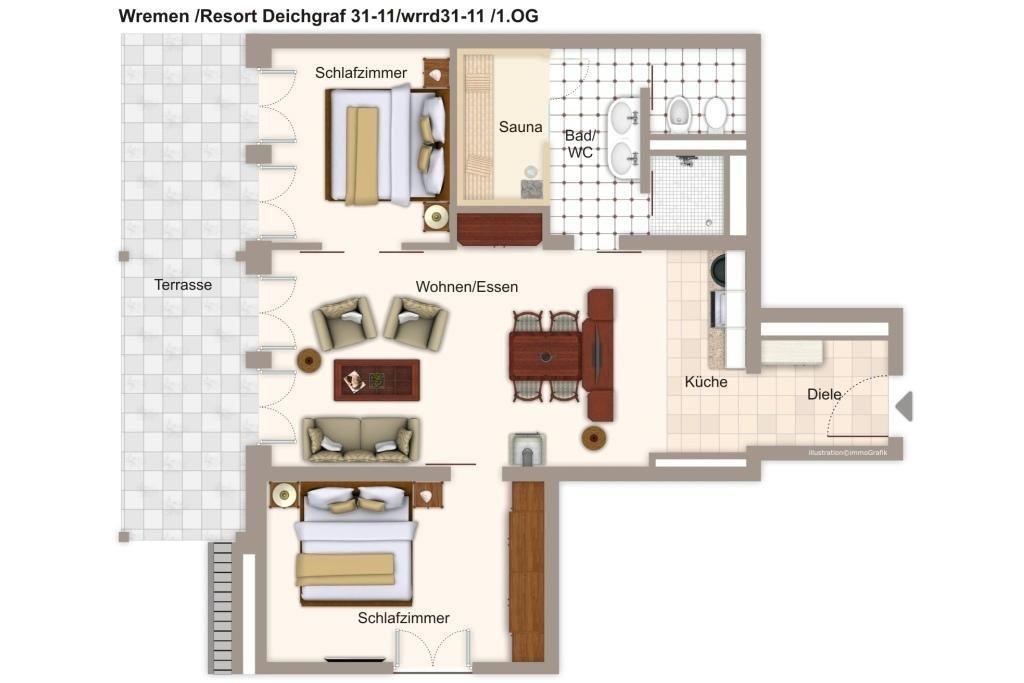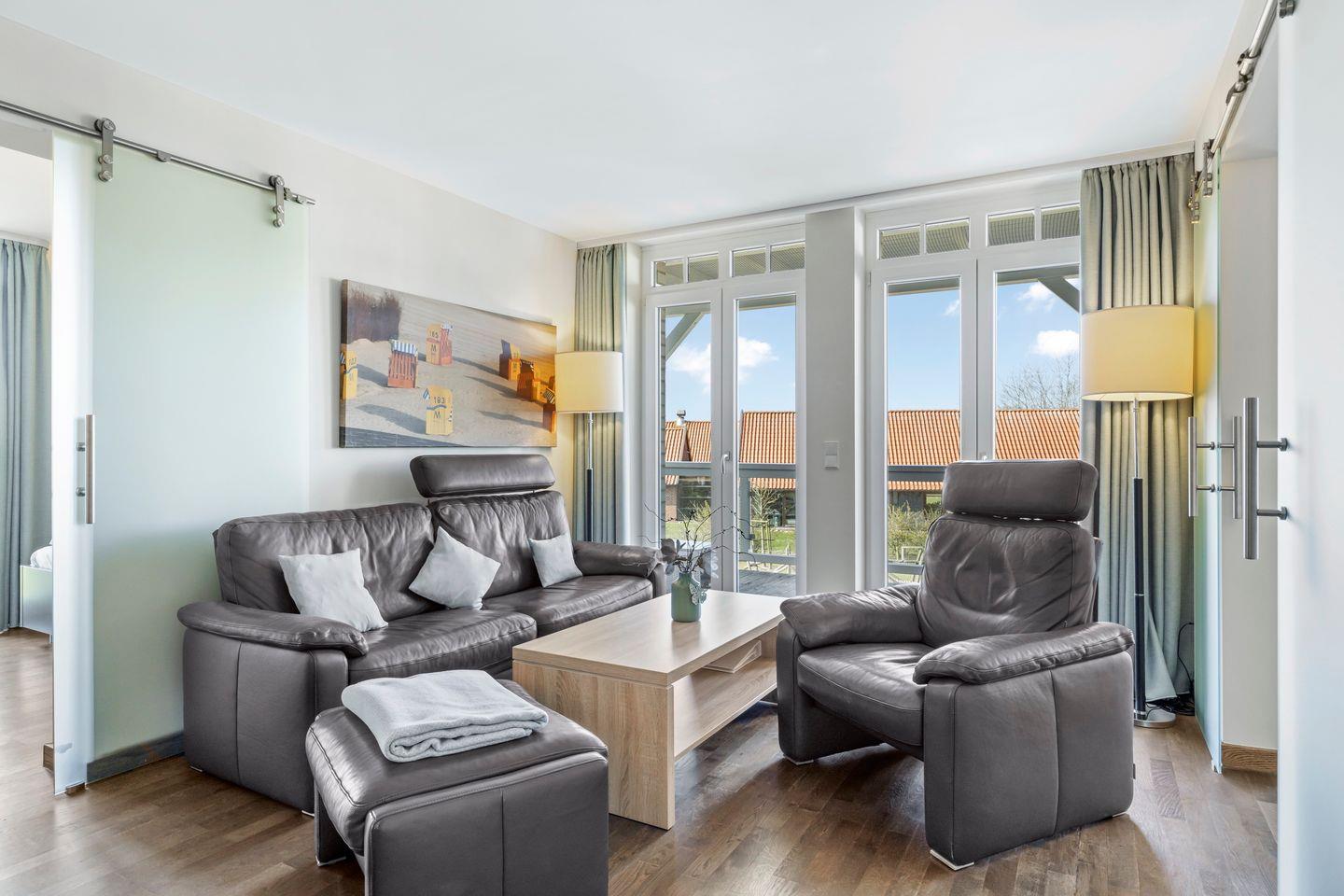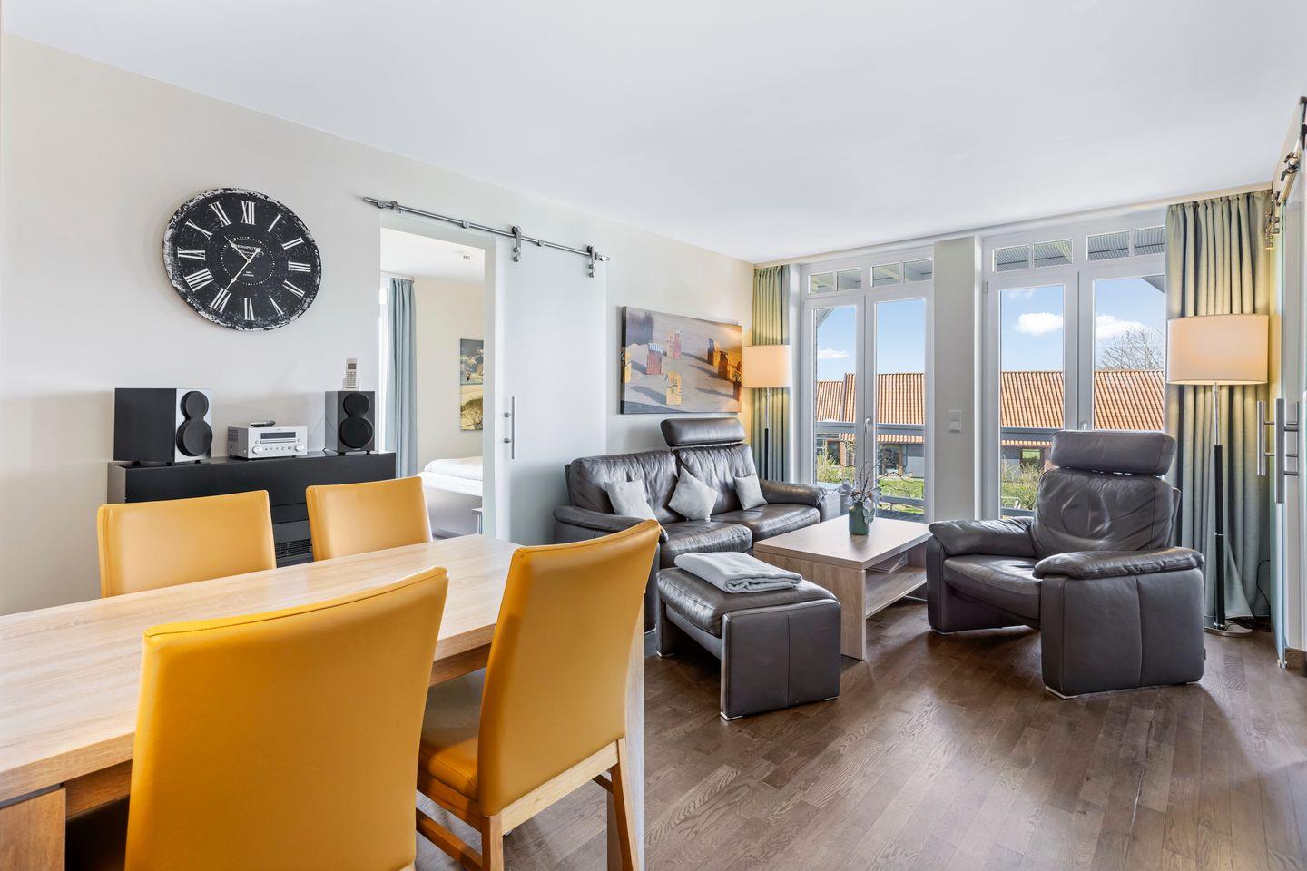 Die 72 m² große 3-Zimmer Ferienwohnung ist für bis zu 4 Personen geeignet. Besonders hervorzuheben ist die private Sauna und der große, überdachte Balkon mit Strandkorb, Lounge-Möbeln und Ausblick zum Nordseedeich.