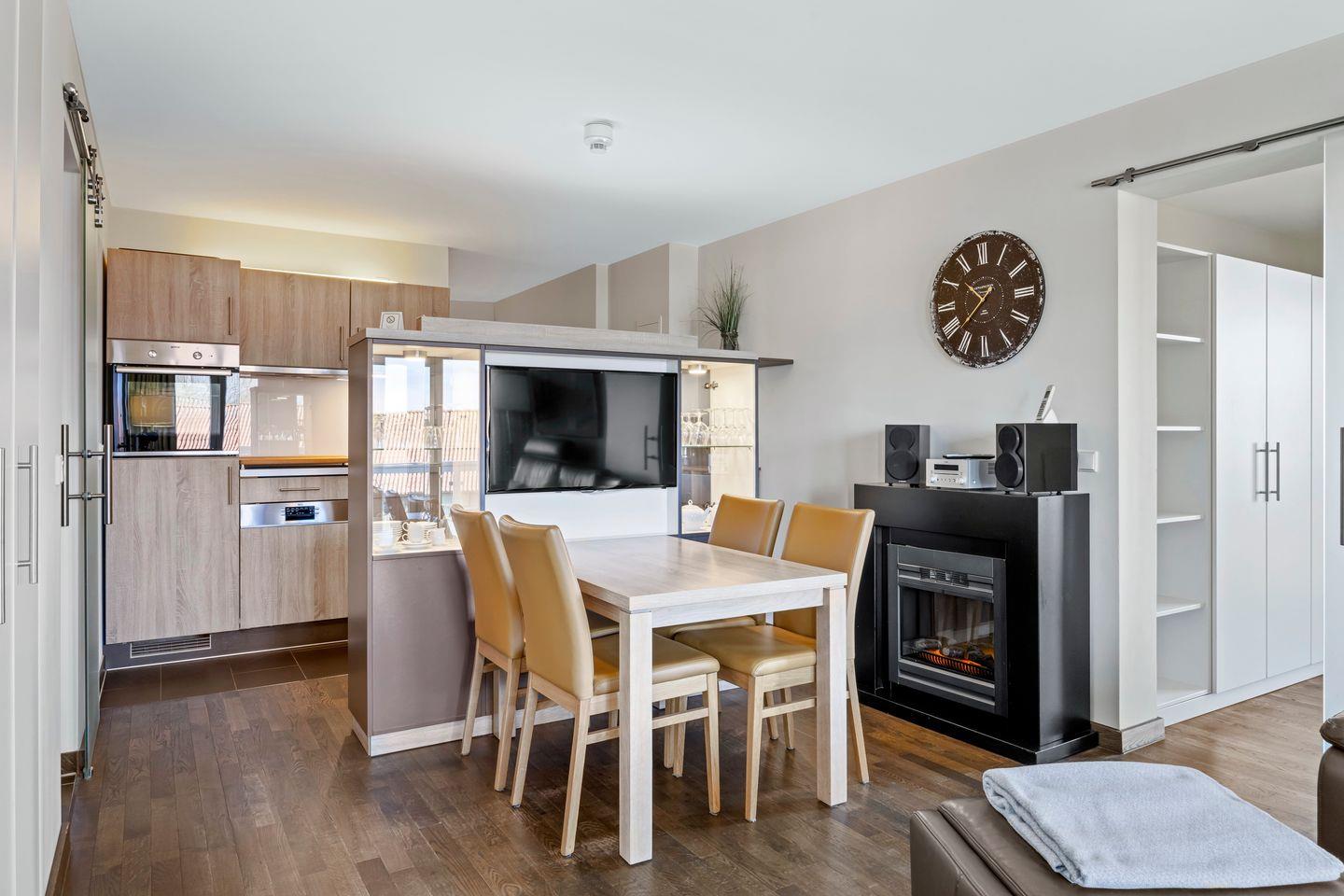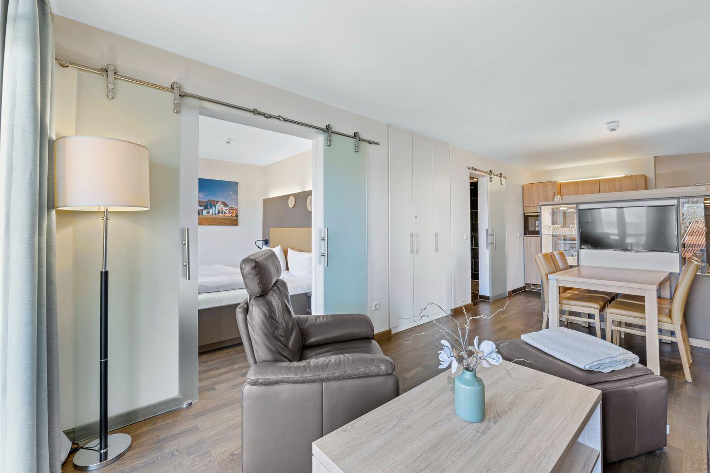 Das moderne Nichtraucher-Apartment verfügt über kostenfreies WLAN und eine voll ausgestattete offene Küche mit Geschirrspüler, Kaffeefilter- und Kaffeekapselmaschine (Tassimo), Toaster, Wasserkocher, Tiefkühlfach, Backofen und Mikrowelle. In den beiden Schlafzimmern stehen euch jeweils ein Doppelbett (1,80 x 2,00 m), im Wohn-Essbereich ein Flatscreen-TV, ein Telefon, eine HiFi-Anlage, eine iPod Docking Station und ein Elektrokamin zur Verfügung. Eines der Schlafzimmer verfügt zudem über einen weiteren Flatscreen-TV und Zugang zum Balkon. Ein Kinderbett kann gegen Entgelt aufgestellt werden und auf Wunsch könnt ihr einen Hochstuhl hinzubuchen.