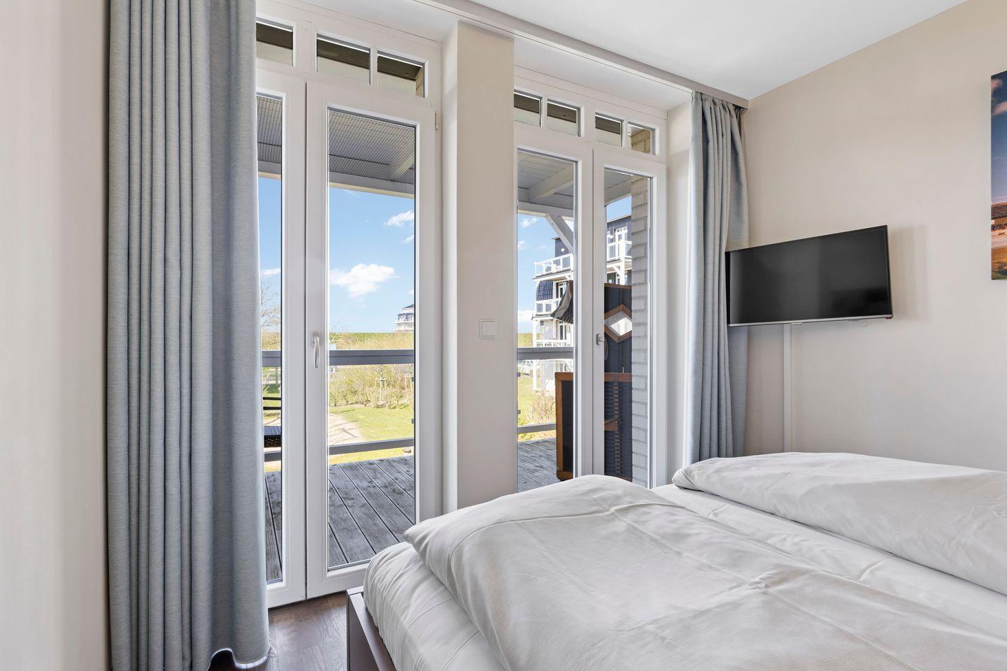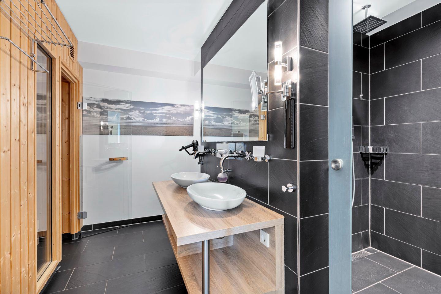 Das hochwertige Badezimmer lässt keine Wünsche offen - ausgestattet mit einem Doppelwaschtisch, begehbarer Regendusche, WC und Bidet, Handtuchwärmer, Föhn und Kosmetikspiegel sowie der großzügigen eigenen Sauna lässt sich hier wunderbar entspannen. Das Apartment verfügt über einen überaus großzügigen, überdachten Balkon mit eigenem Strandkorb, Garten- und Lounge-Möbeln und idyllischem Blick zum Deich und in Richtung Bremerhaven/Überseehafen.