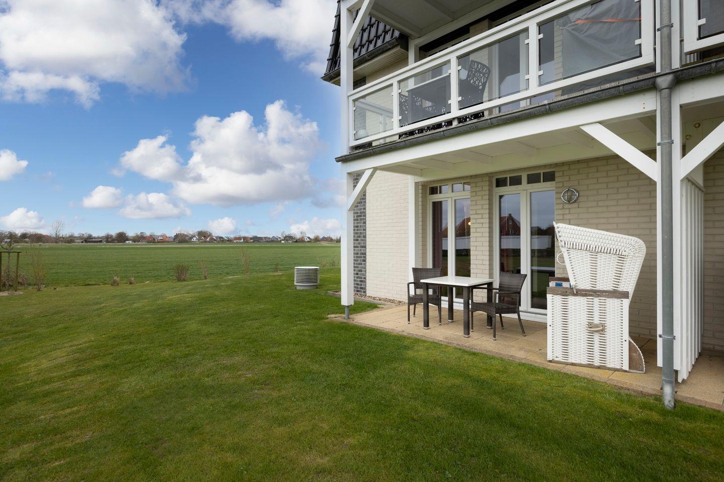 Im komfortablen Badezimmer mit begehbarer Dusche, WC und Bidet, Föhn und Kosmetikspiegel befindet sich eine eigene Sauna zur vollkommenen Entspannung in privater Atmosphäre. Das Apartment verfügt außerdem über eine ruhig gelegene Terrasse mit Gartenmöbeln und Strandkorb. Von hier aus habt ihr einen wunderschönem Blick ins Grüne und auf die Wiesen und Felder.