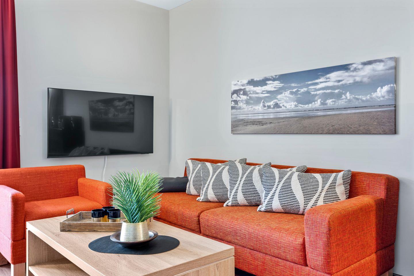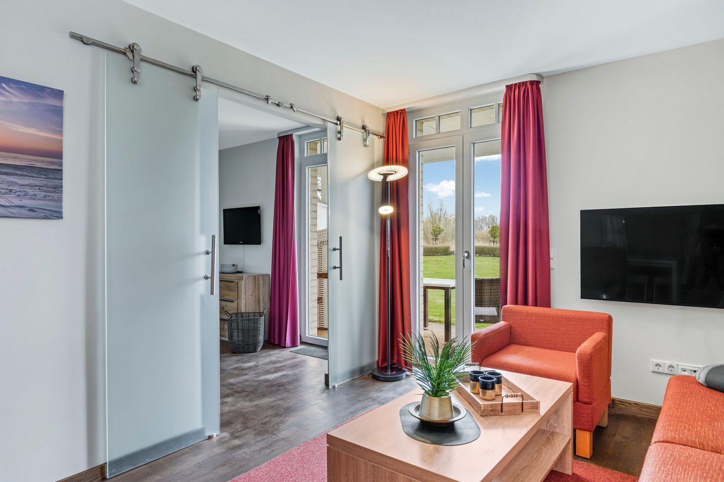 Die 66 m² große 2-Zimmer Ferienwohnung ist für bis zu 2 Personen geeignet. Besonders hervorzuheben ist die Sauna des Apartments und die wunderbar gelegene Terrasse mit Strandkorb und Zugang zum Garten und den Grünflächen.