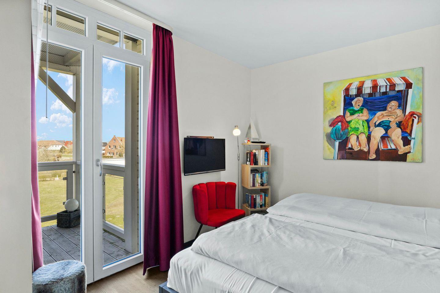 Das hochwertige Badezimmer ist eine richtige Wohlfühloase und lässt keine Wünsche offen - ausgestattet mit einem Doppelwaschtisch, begehbarer Dusche, WC und Bidet, Handtuchwärmer, Föhn und Kosmetikspiegel sowie der großzügigen eigenen Sauna lässt sich hier wunderbar entspannen. Das Apartment verfügt über einen großzügigen, überdachten Balkon mit Gartenmöbeln und extra großem Strandkorb. Von hier aus genießt ihr einen idyllischem Blick ins malerische Umland. Der Balkon ist sowohl vom Wohn- als auch vom Schlafzimmer begehbar. Am Strand steht euch überdies während der Saison ein Strandkorb kostenlos zur Verfügung (der Strandkorb befindet sich nicht am Hundestrand).