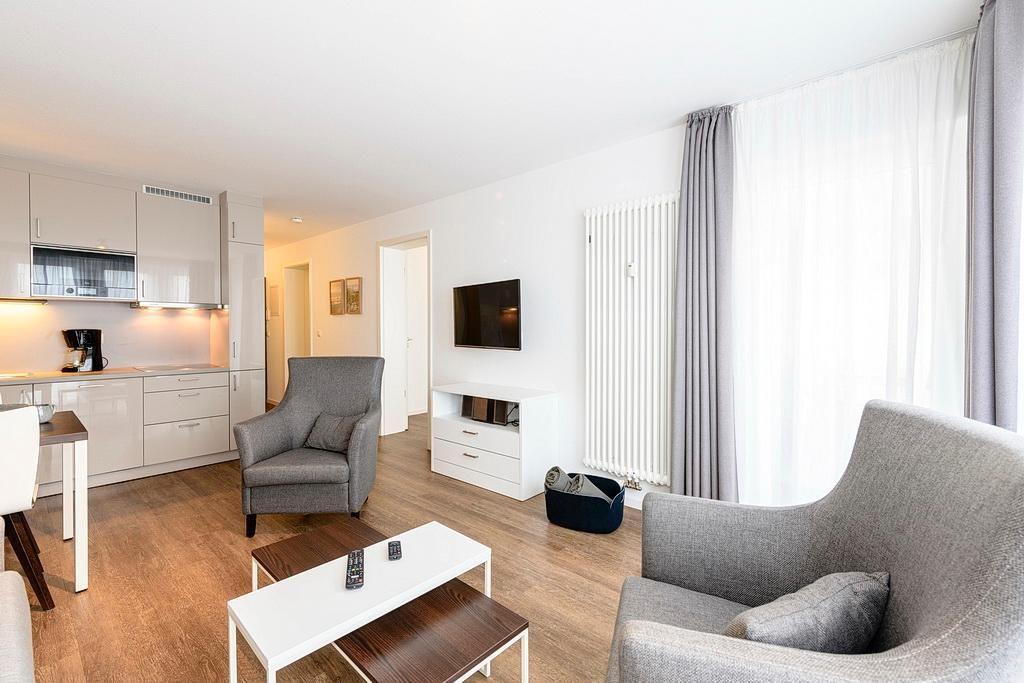 Das geschmackvoll eingerichtete Nichtraucher-Apartment verfügt über kostenfreies WLAN. Der Wohnbereich mit Schlafcouch bietet eine voll ausgestattete offene Küchenzeile mit Geschirrspüler, Gefrierfach, Kaffeemaschine, Toaster, Wasserkocher und Mikrowelle mit Backfunktion sowie einen großen Flatscreen-TV und ein Radio. Das Apartment verfügt über einen Esstisch für 4 Personen und einen behaglichen Sitzbereich. Ein Schlafzimmer verfügt über ein Doppelbett und einen eigenen Flatscreen-TV, ein weiteres Schlafzimmer über zwei Einzelbetten. Ein Kinderbett kann gegen Entgelt aufgestellt werden. Im stilvollen Badezimmer befinden sich eine große begehbare Dusche sowie ein Waschtisch mit Föhn und Kosmetikspiegel. Nach einem erlebnisreichen Urlaubstag entspannt ihr auf dem überdachten und mit Gartenmöbeln für 4 Personen ausgestatteten Balkon. Der Balkon ist vom Wohnbereich und vom Hauptschlafzimmer aus zugänglich.