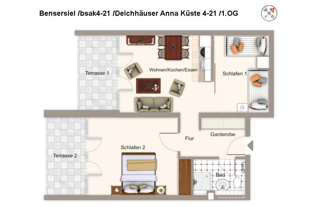 Die moderne und helle Ferienwohnung befindet sich im ersten Obergeschoss des Deichhauses 4, im Herzen von Bensersiel, nur 500 Meter vom Sandstrand und der Nordsee entfernt. In der unmittelbaren Umgebung findet ihr zahlreiche Einkaufsmöglichkeiten, Restaurants und Cafés; auch die Nordseetherme, das Meerwasserfreibad mit großer Wasserrutsche und der Sportthemenpark sind fußläufig gut erreichbar. Unser Tipp: Macht einen Tagesausflug nach Langeoog - die knapp einstündige Fährverbindung zwischen Bensersiel und der autofreien Insel verkehrt mehrfach täglich. Der Fähranleger liegt nur einen kleinen Spaziergang (ca. 1 km) von den Deichhäusern entfernt.