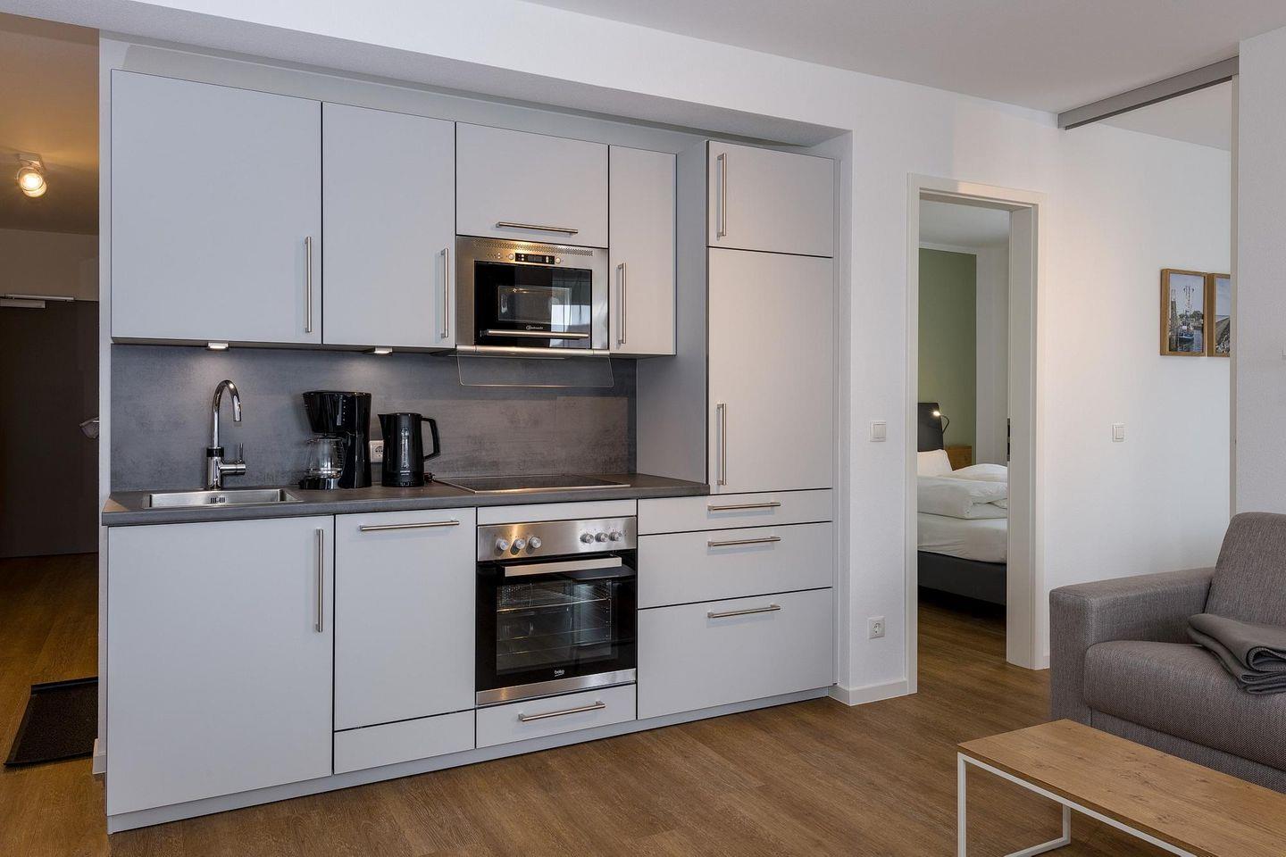 Das geschmackvoll eingerichtete Nichtraucher-Apartment verfügt über kostenfreies WLAN. Der Wohnbereich mit Couch bietet eine voll ausgestattete offene Küchenzeile mit Geschirrspüler, Backofen, Gefrierfach, Kaffeemaschine, Toaster, Wasserkocher und Mikrowelle sowie einen großen Flatscreen-TV und ein Radio. Das Apartment verfügt über einen Esstisch für 5 Personen und einen behaglichen Sitzbereich. Zwei separate Schlafzimmer stehen euch zur Verfügung. Eines davon verfügt über ein Doppelbett mit einer Überlange von 2,10 m und einen eigenen Flatscreen-TV, ein weiteres Schlafzimmer ist ebenfalls mit einem Doppelbett ausgestattet. Ein Kinderbett kann gegen Entgelt aufgestellt werden. Im stilvollen Badezimmer befinden sich eine große begehbare Dusche sowie ein Waschtisch mit Föhn und Kosmetikspiegel. Nach einem erlebnisreichen Urlaubstag entspannt ihr auf dem überdachten und mit Gartenmöbeln für 5 Personen ausgestatteten Balkon.