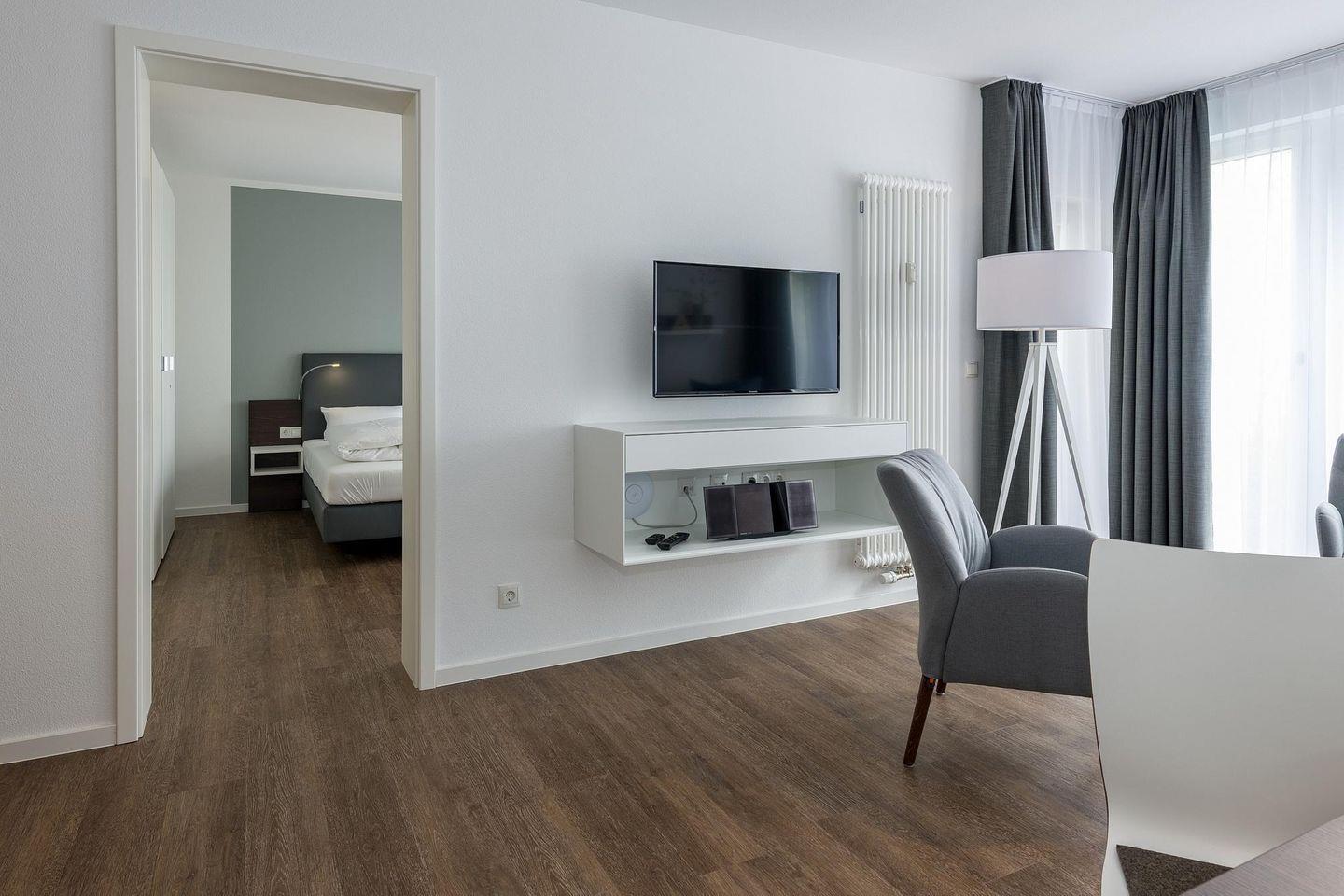Das geschmackvoll eingerichtete Nichtraucher-Apartment verfügt über kostenfreies WLAN. Der Wohnbereich mit Schlafcouch bietet eine voll ausgestattete offene Küchenzeile mit Geschirrspüler, Gefrierfach, Backofen, Kaffeemaschine, Toaster, Wasserkocher und Mikrowelle sowie einen großen Flatscreen-TV und ein Radio. Das Apartment verfügt über einen Esstisch für 5 Personen und einen behaglichen Sitzbereich. Zwei separate Schlafzimmer mit einem Doppelbett und mit je zwei Einzelbetten stehen euch zur Verfügung. Eines davon verfügt zudem über einen eigenen Flatscreen-TV. Ein Kinderbett kann gegen Entgelt aufgestellt werden. Im stilvollen Badezimmer befinden sich eine große begehbare Dusche sowie ein Waschtisch mit Föhn und Kosmetikspiegel. Nach einem erlebnisreichen Urlaubstag entspannt ihr auf dem überdachten und mit Gartenmöbeln für 5 Personen ausgestatteten Balkon.