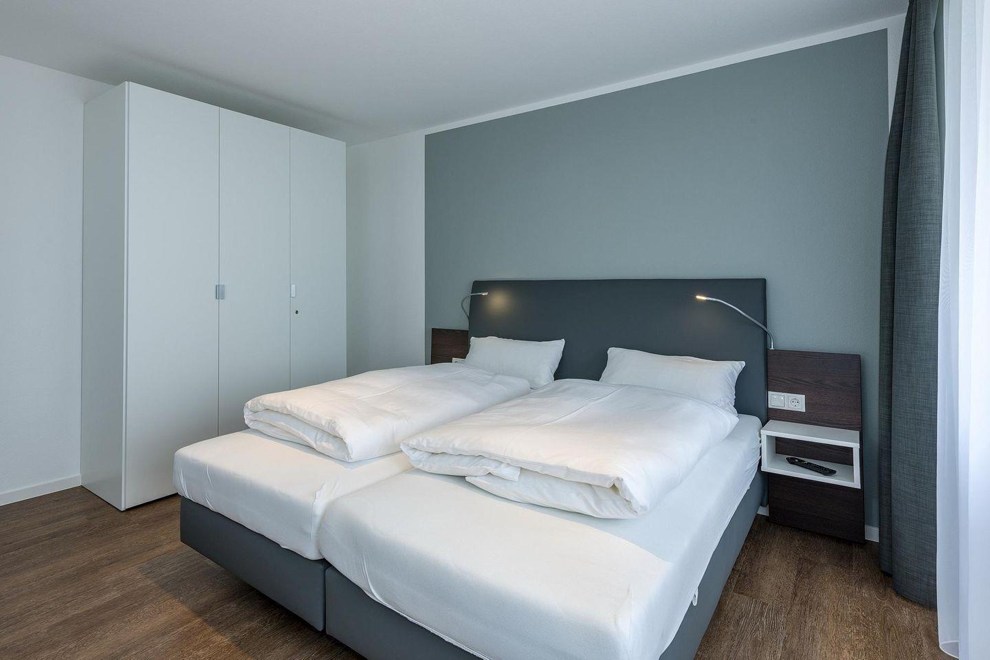 Das geschmackvoll eingerichtete Nichtraucher-Apartment verfügt über kostenfreies WLAN. Der Wohnbereich mit Schlafcouch bietet eine voll ausgestattete offene Küchenzeile mit Geschirrspüler, Gefrierfach, Kaffeemaschine, Toaster, Wasserkocher, Backofen und Mikrowelle sowie einen großen Flatscreen-TV und ein Radio. Das Apartment verfügt über einen Esstisch für 5 Personen und einen behaglichen Sitzbereich. Zwei separate Schlafzimmer stehen euch zur Verfügung. Eines davon verfügt über ein Doppelbett und einen eigenen Flatscreen-TV, ein weiteres über zwei Einzelbetten. Ein Kinderbett kann gegen Entgelt aufgestellt werden. Im stilvollen Badezimmer befinden sich eine große begehbare Dusche sowie ein Waschtisch mit Föhn und Kosmetikspiegel. Nach einem erlebnisreichen Urlaubstag entspannt ihr auf dem überdachten und mit Gartenmöbeln für 4 Personen ausgestatteten Balkon.