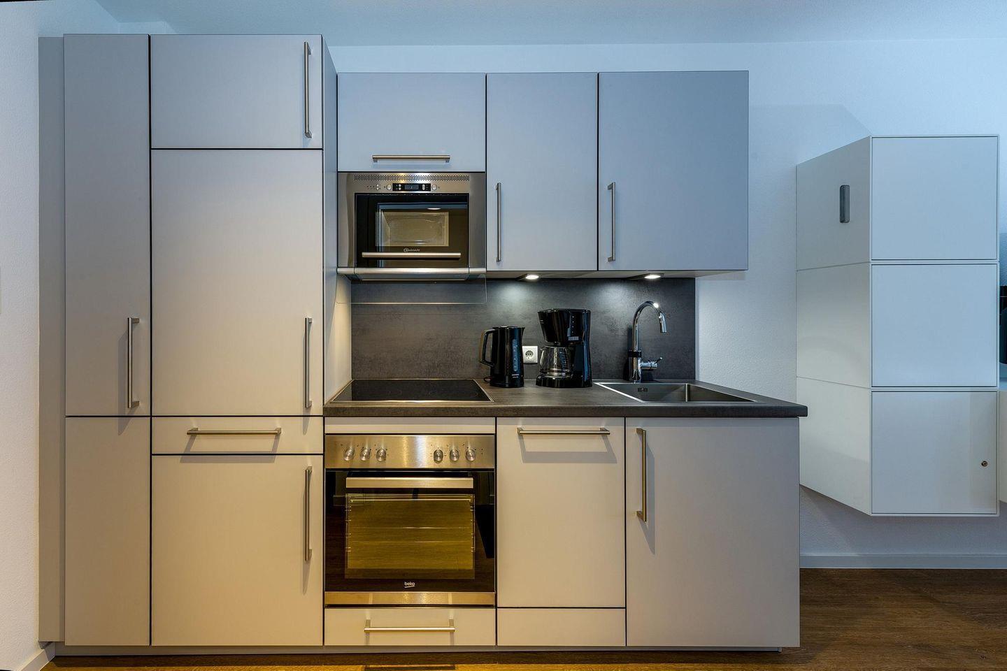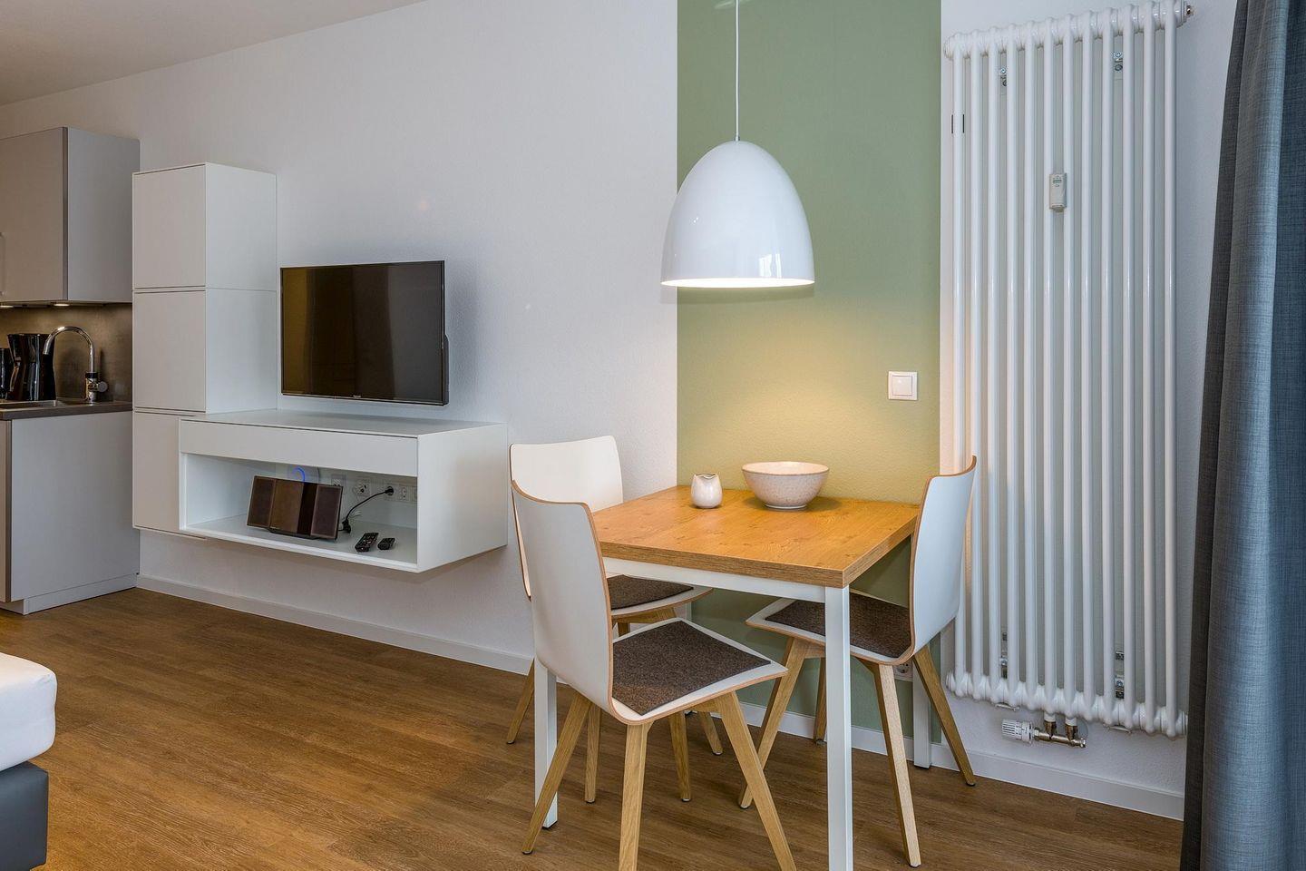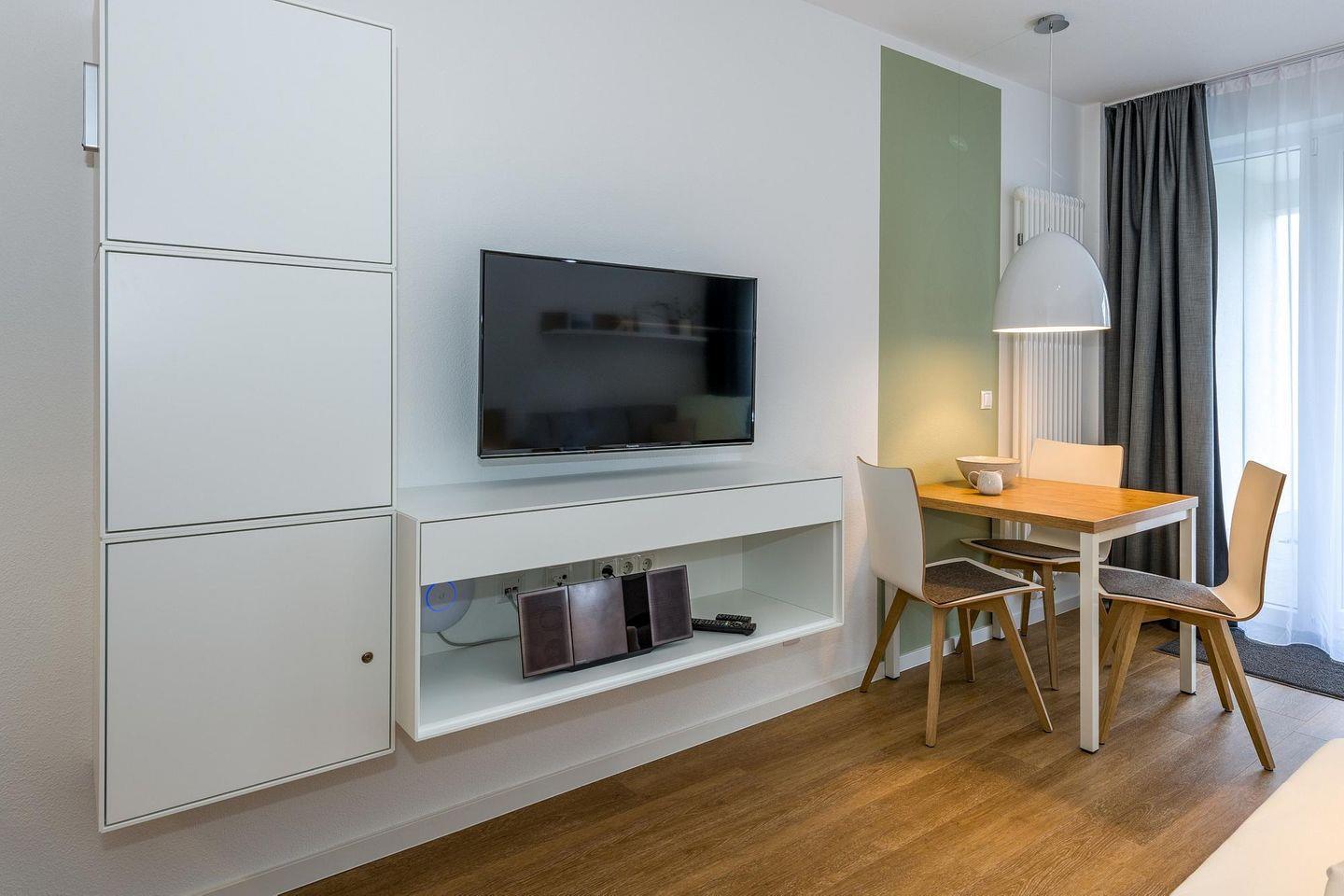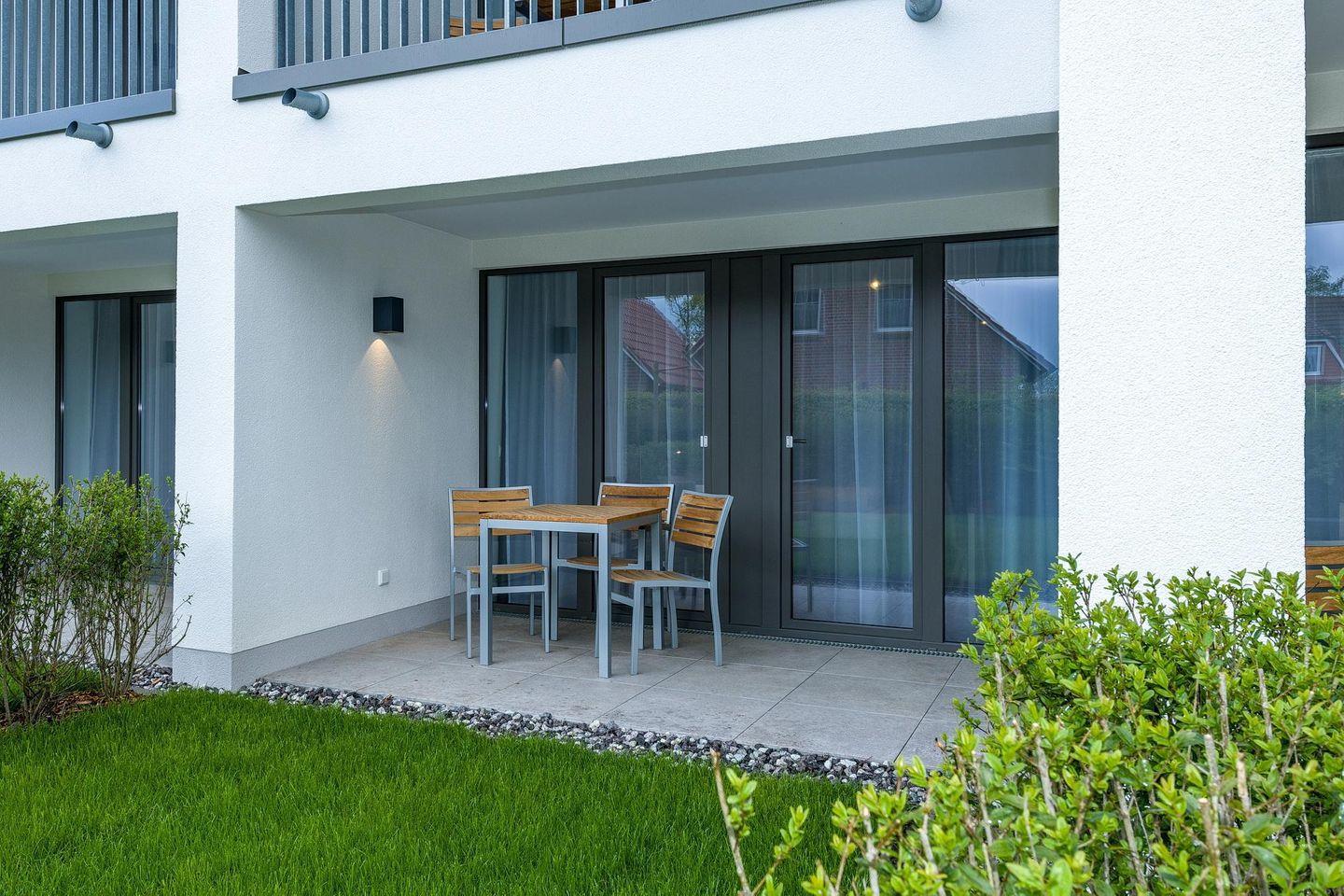 Das geschmackvoll eingerichtete Nichtraucher-Apartment verfügt über kostenfreies WLAN. Der Wohn-Schlafbereich mit Schlafcouch bietet eine voll ausgestattete offene Küchenzeile mit Geschirrspüler, Gefrierfach, Backofen, Kaffeemaschine, Toaster, Wasserkocher und Mikrowelle sowie ein Doppelbett, einen großen Flatscreen-TV und ein Radio. Das Apartment verfügt über einen Esstisch für 3 Personen und einen behaglichen kleinen Sitzbereich. Ein Kinderbett kann gegen Entgelt aufgestellt werden. Im stilvollen Badezimmer befinden sich eine große begehbare Dusche sowie ein Waschtisch mit Föhn und Kosmetikspiegel. Nach einem erlebnisreichen Urlaubstag entspannt ihr auf der überdachten und mit Gartenmöbeln für 3 Personen ausgestatteten Terrasse.