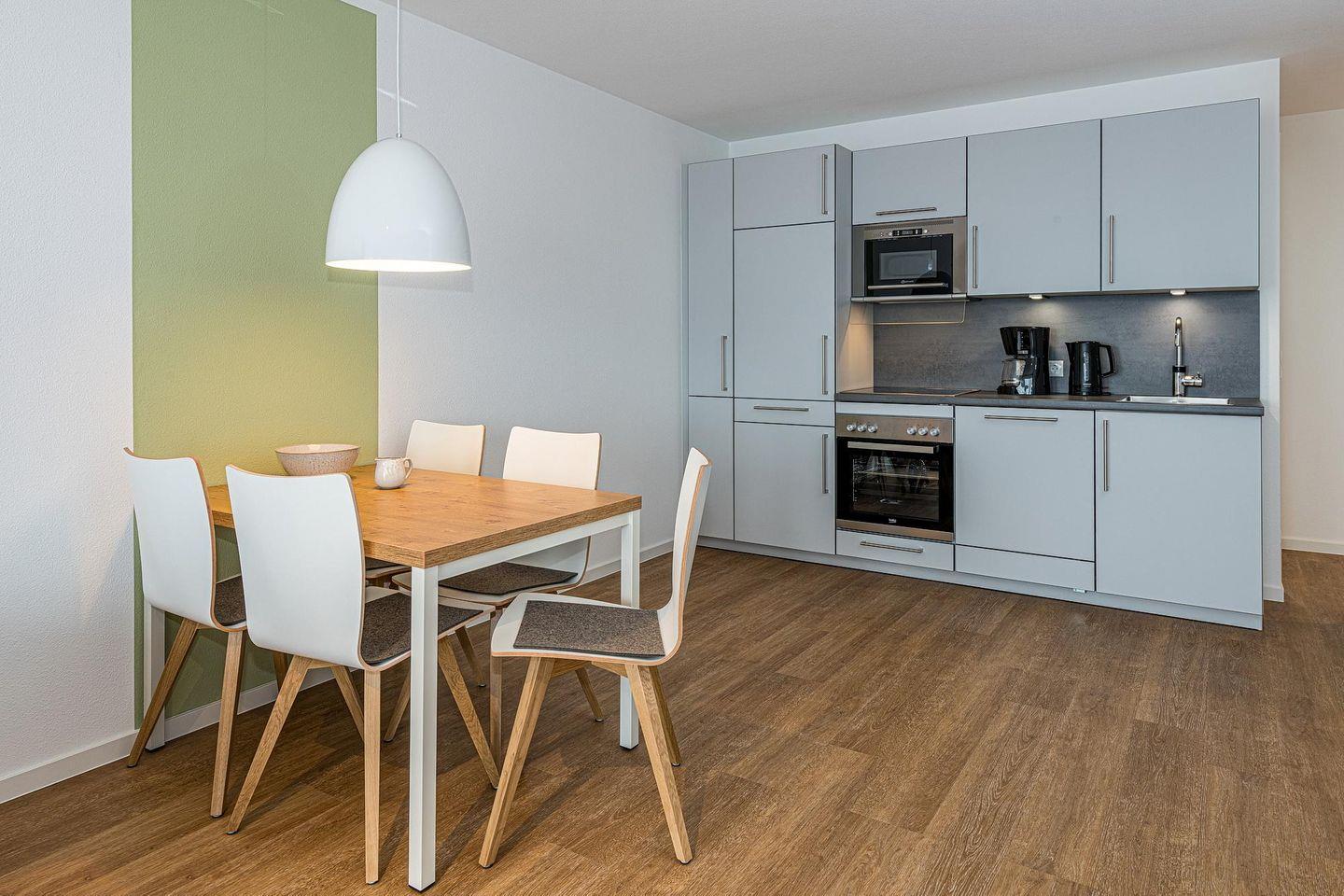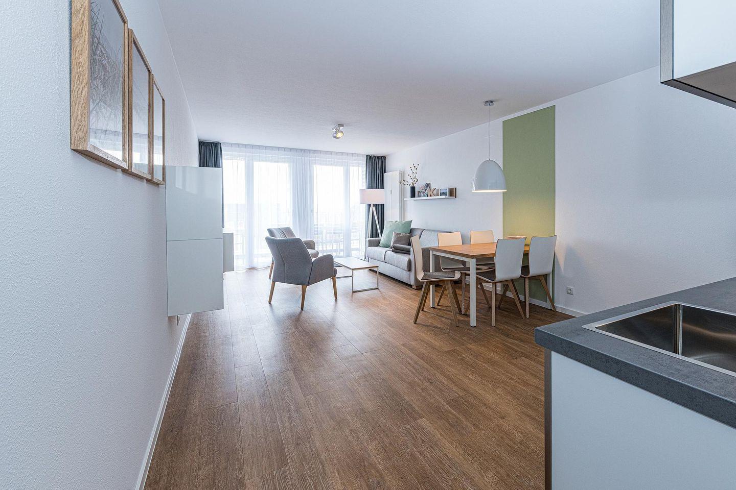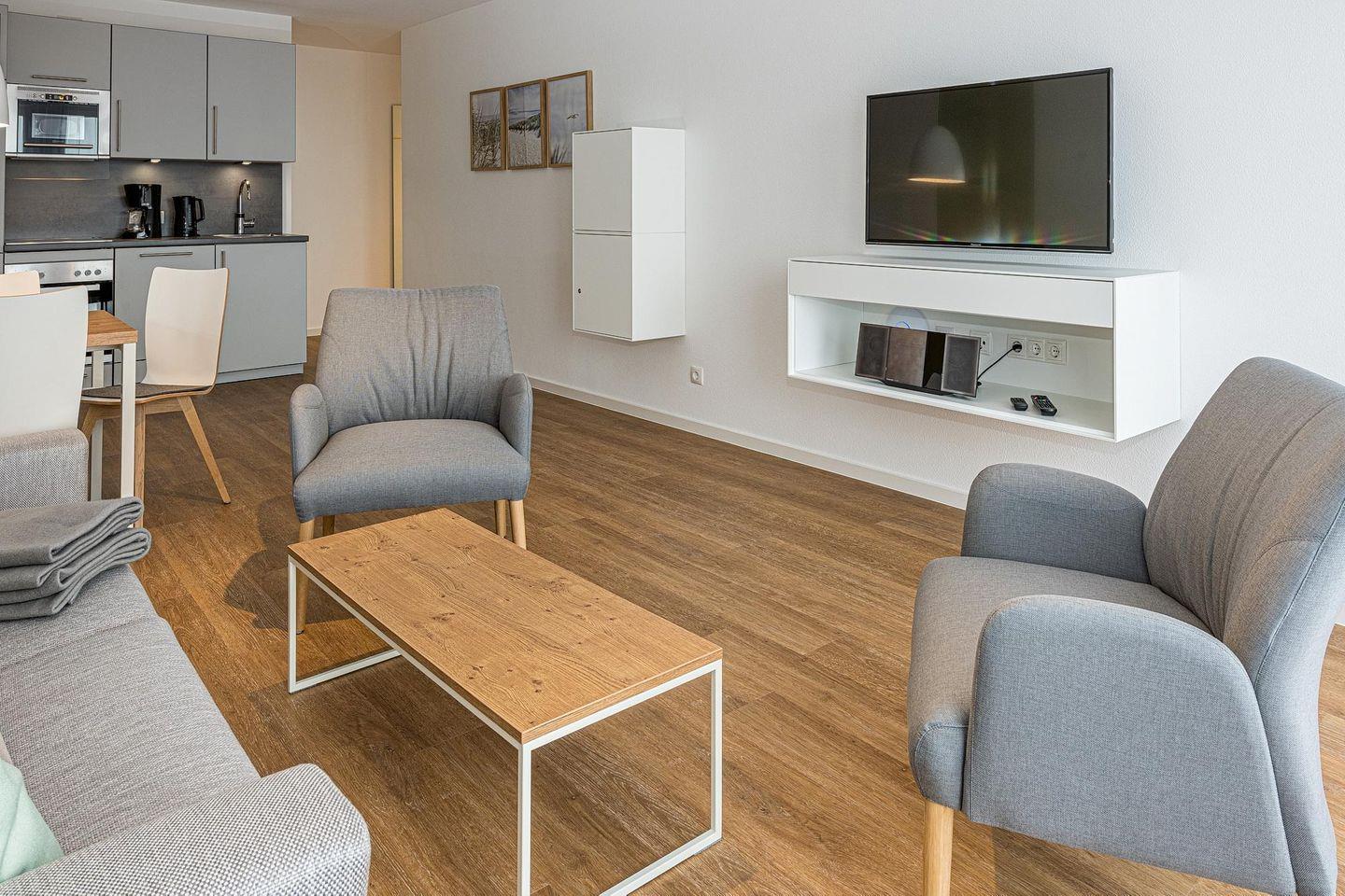 Das geschmackvoll eingerichtete Nichtraucher-Apartment verfügt über kostenfreies WLAN. Der Wohnbereich bietet eine voll ausgestattete offene Küchenzeile mit Geschirrspüler, Gefrierfach, Backofen, Kaffeemaschine, Toaster, Wasserkocher und Mikrowelle sowie einen großen Flatscreen-TV und ein Radio. Das Apartment verfügt über einen Esstisch für 5 Personen und einen behaglichen Sitzbereich mit Schlafcouch. Zwei separate Schlafzimmer stehen euch zur Verfügung. Eines davon verfügt über ein Doppelbett und einen eigenen Flatscreen-TV, ein weiteres über ein Etagenbett. Ein Kinderbett kann gegen Entgelt aufgestellt werden. Im stilvollen Badezimmer befinden sich eine große begehbare Dusche sowie ein Waschtisch mit Föhn und Kosmetikspiegel. Nach einem erlebnisreichen Urlaubstag lässt es sich auf dem überdachten und mit Gartenmöbeln ausgestatteten Balkon wunderbar entspannen.