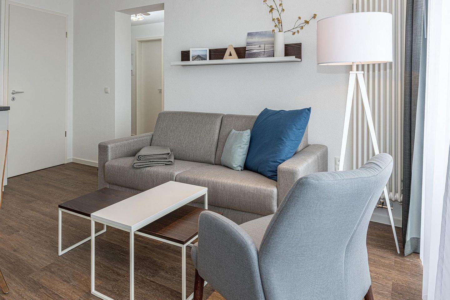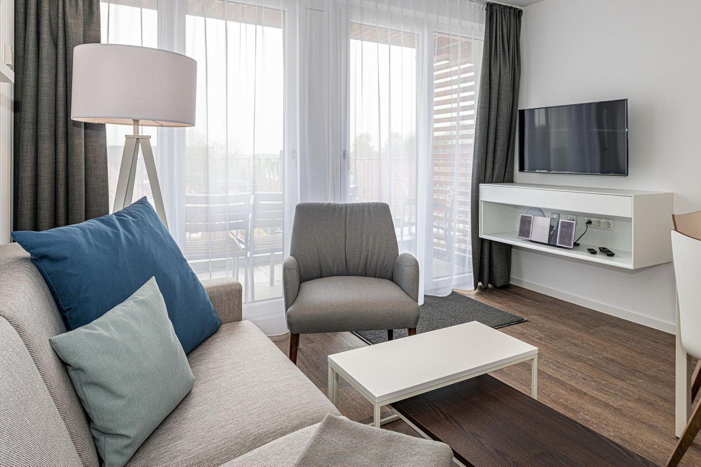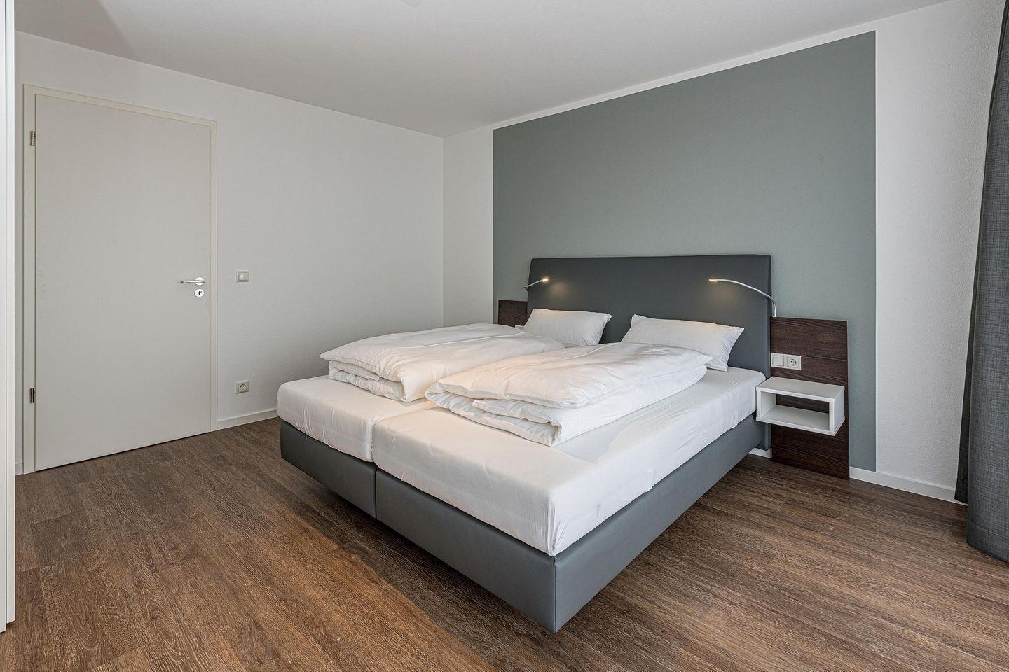 Das geschmackvoll eingerichtete Nichtraucher-Apartment verfügt über kostenfreies WLAN. Der Wohnbereich mit einer Schlafcouch bietet eine voll ausgestattete offene Küchenzeile mit Geschirrspüler, Gefrierfach, Backofen, Kaffeemaschine, Toaster, Wasserkocher und Mikrowelle sowie einen großen Flatscreen-TV und ein Radio. Das Apartment verfügt über einen Esstisch für 5 Personen und einen behaglichen Sitzbereich. Zwei separate Schlafzimmer stehen euch zur Verfügung. Das Hauptschlafzimmer verfügt über ein Doppelbett mit eigenem Flatscreen-TV. Ein weiteres Schlafzimmer verfügt über zwei Einzelbetten mit Oberlichtfenster und Verdunklungsmöglichkeit. Ein Kinderbett kann gegen Entgelt aufgestellt werden. Im stilvollen Badezimmer befinden sich eine große begehbare Dusche sowie ein Waschtisch mit Föhn und Kosmetikspiegel. Nach einem erlebnisreichen Urlaubstag entspannt ihr auf den überdachten und mit Gartenmöbeln für 5 Personen ausgestatteten Balkonen. Die Balkone sind vom Wohnbereich bzw. vom Hauptschlafzimmer aus zugänglich. Besonders komfortabel sind die elektrischen Außenrollladen zur Verdunklung, die außerdem für ein angenehmes Raumklima sorgen - besonders in den warmen Sommermonaten.