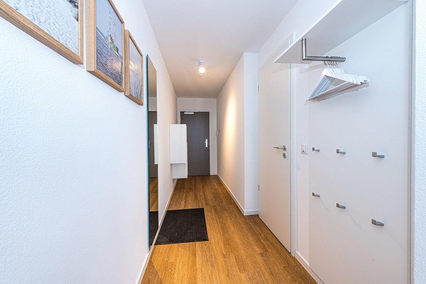 Die 58 m² große 3-Zimmer Ferienwohnung ist für bis zu 5 Personen geeignet. Besonders hervorzuheben ist der großzügige und überdachte Balkon, ähnlich einer Loggia, in sonniger Süd-West-Lage. Hier lässt sich bis zum Abend das wohltuende Meeresklima und die Sonne genießen.